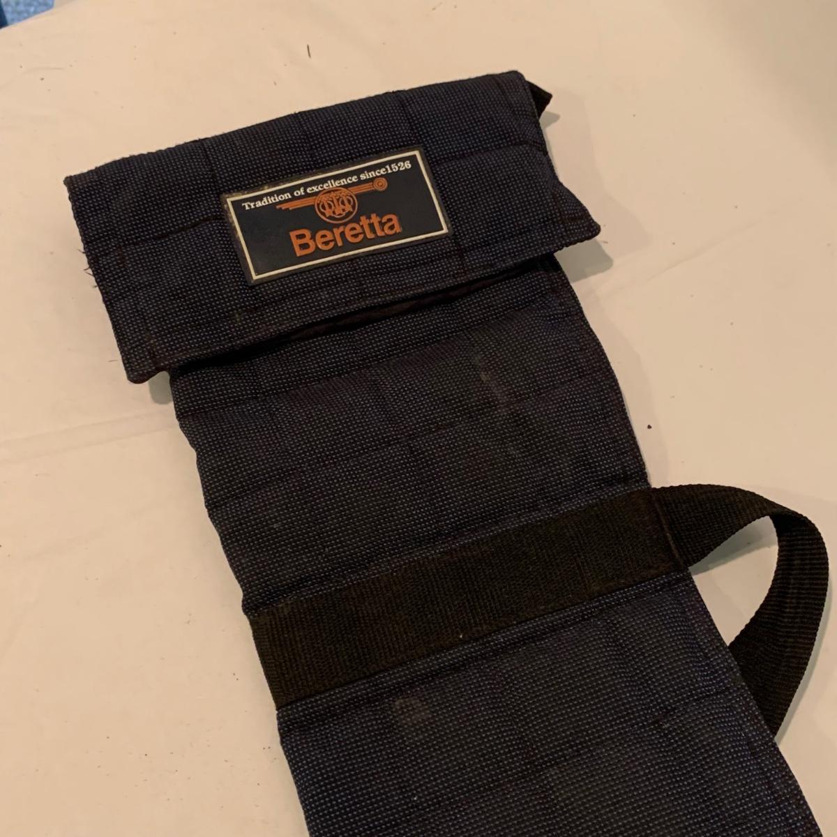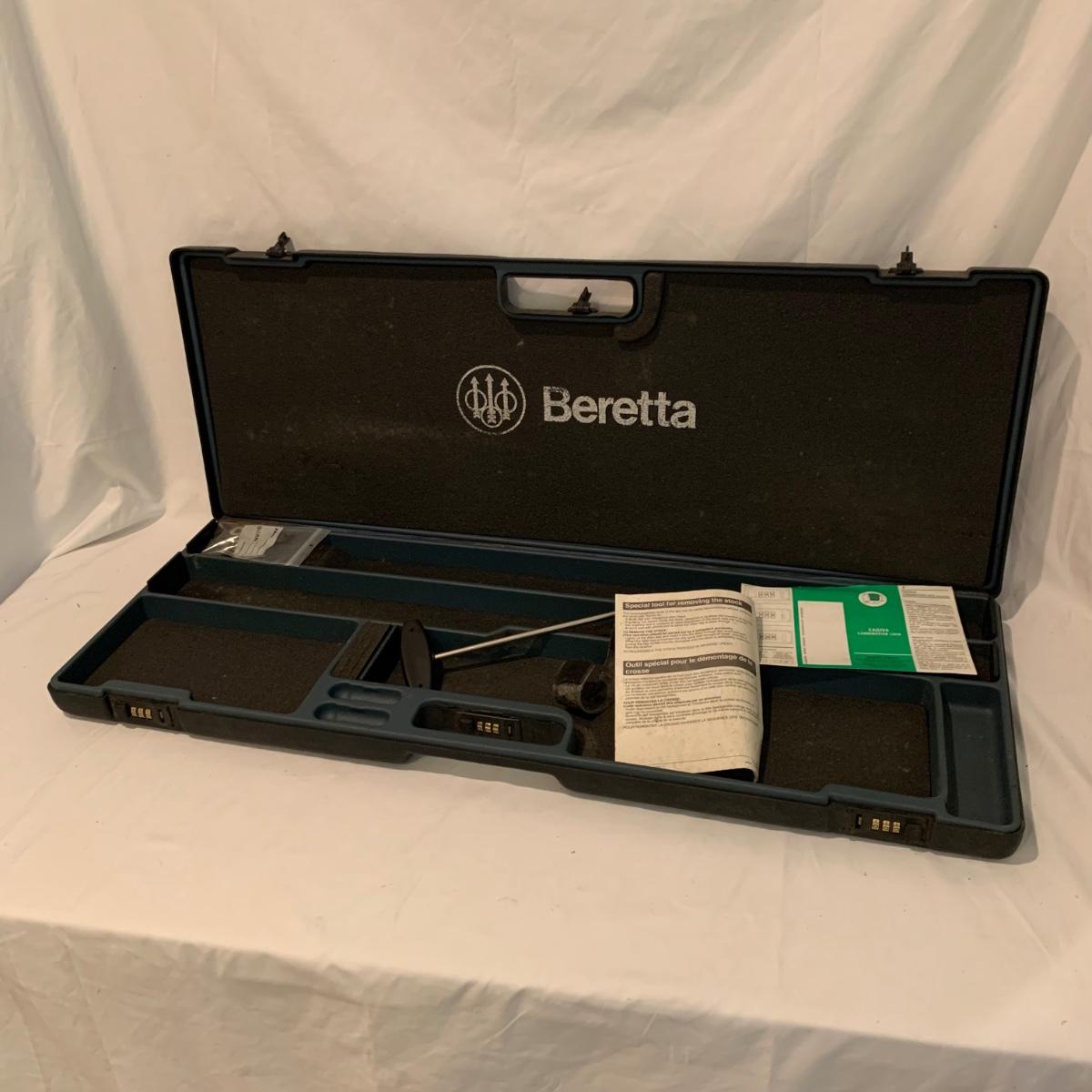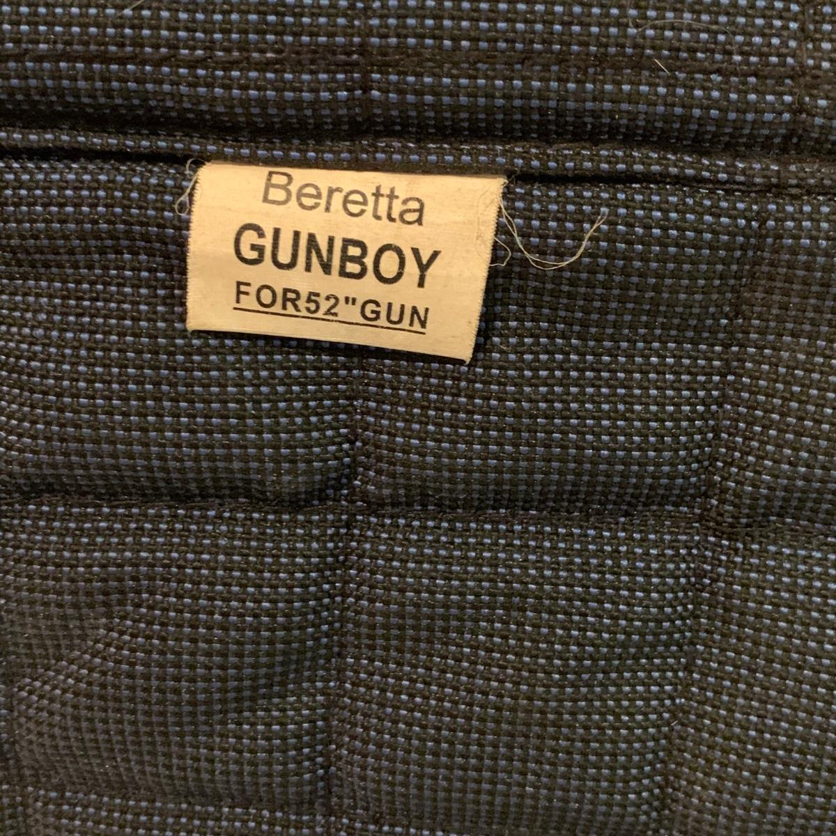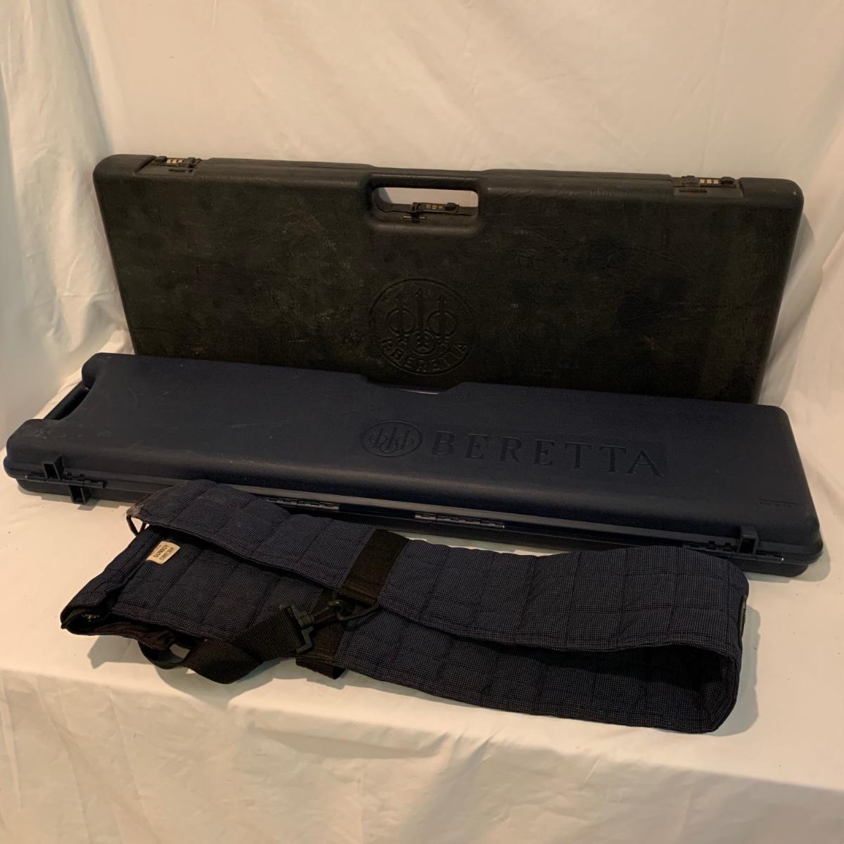 Three Beretta gun storage items. Two hard cases and one soft “Gunboy” for a 52” gun. Black case measures 35.5” x 13.5” x 3”H. It has combination locks and instructions on how to reset. It has a musty smell inside. Navy blue case is 38” x 11” x 3.5”H.