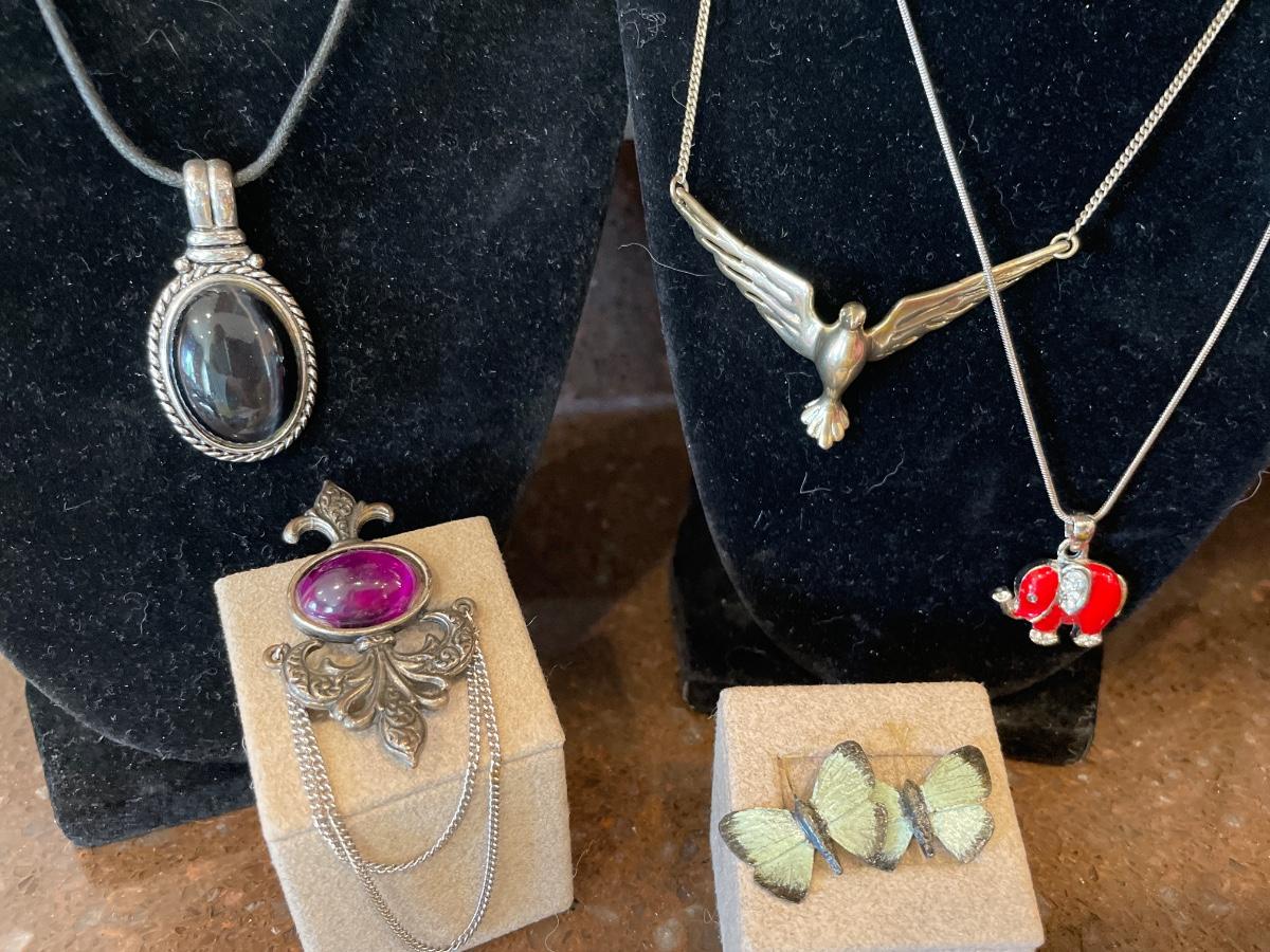 Bergers pin, bird and elephant necklaces & butterfly earrings
