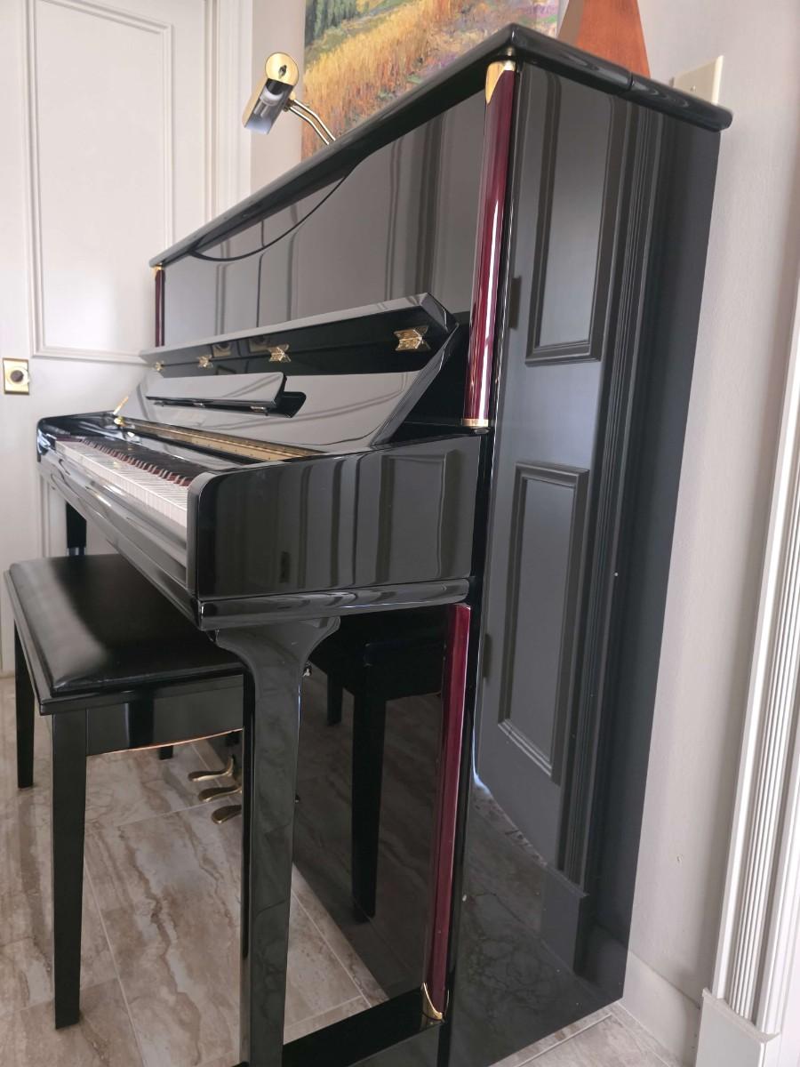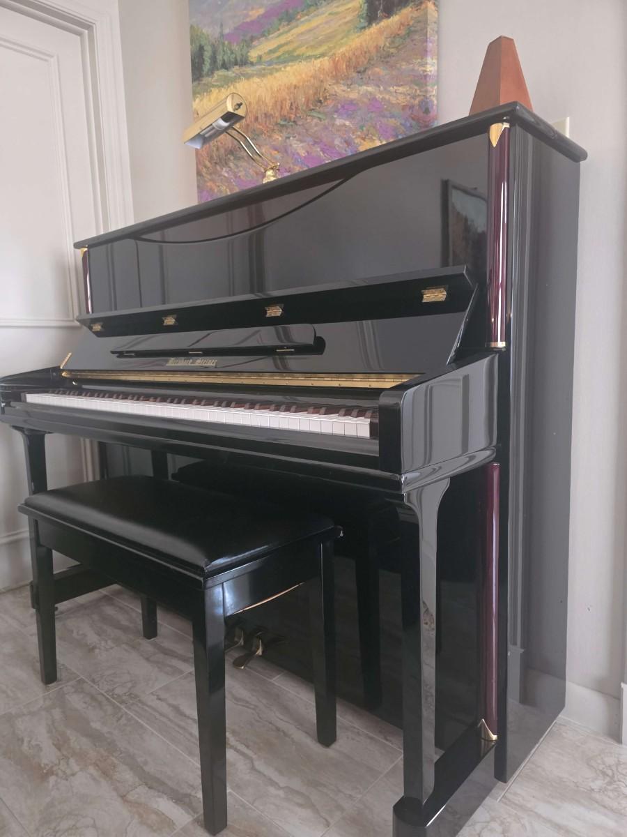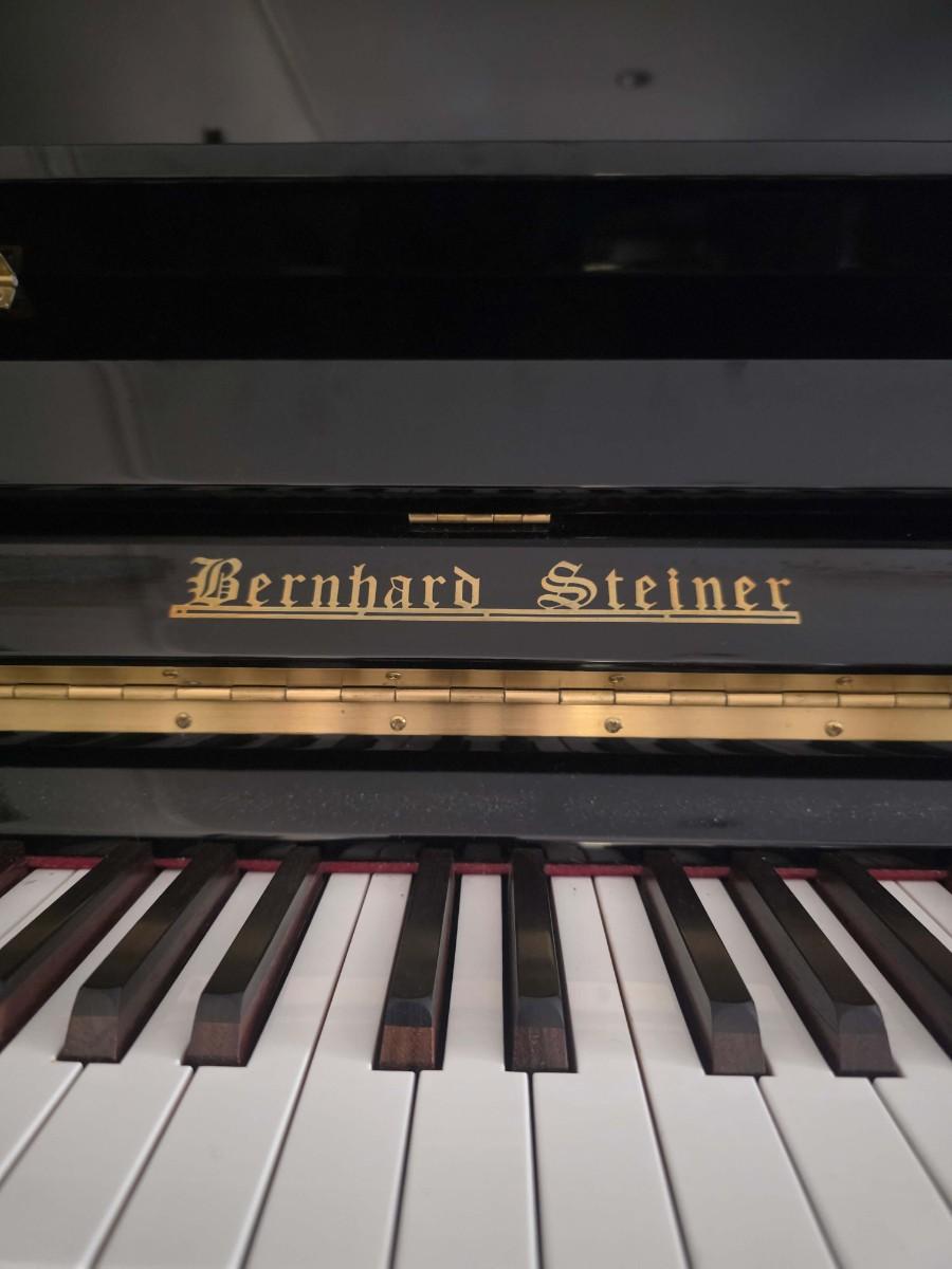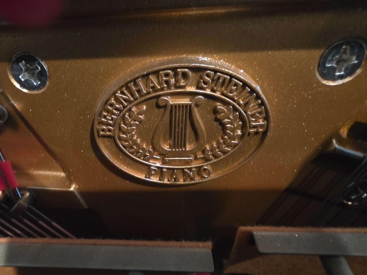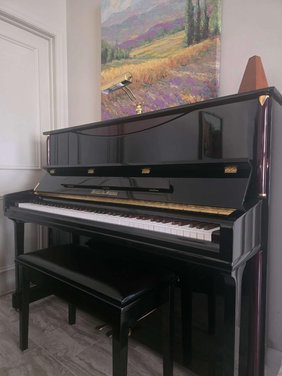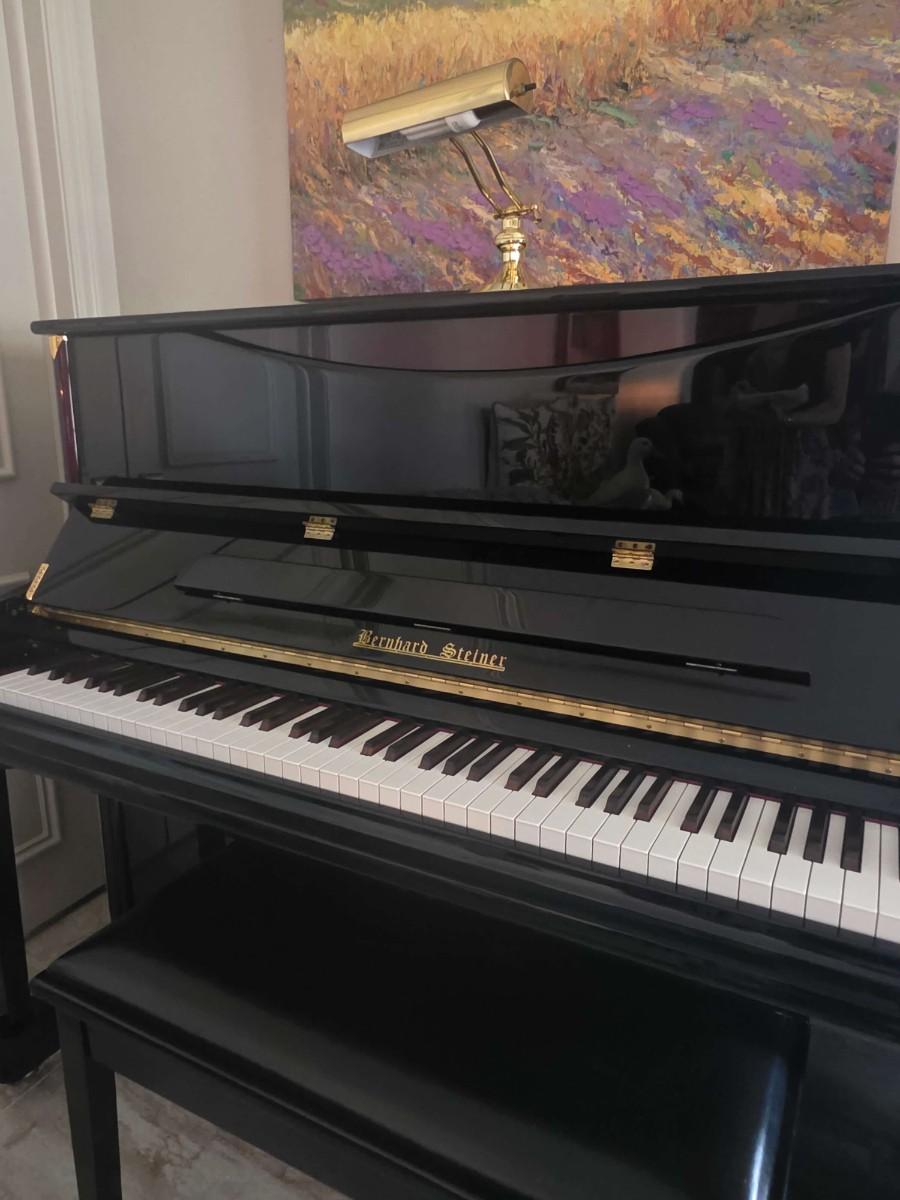 This polished ebony piano is an absolute stunner, complemented with cherry wood and brass accents. Research indicates Bernhard Steiner began manufacturing in Germany in the late 1880s, before transitioning to South Africa in the 1940s, and eventually being acquired by Korean manufacturer, Samick in the late 1990s or early 2000s. During this phase, it is possible that the pianos were made by Young Chang. This specific piano has had a single owner and was purchased roughly 20 years ago, with its most recent tuning 5 years ago. Notably, the piano has been kept in pristine condition, displayed in a clean, climate controlled, smoke free environment. In my assessment, as someone not highly familiar with pianos, this instrument is truly exceptional, boasting a glossy ebony finish and wood grain keys that render it a standout statement piece.