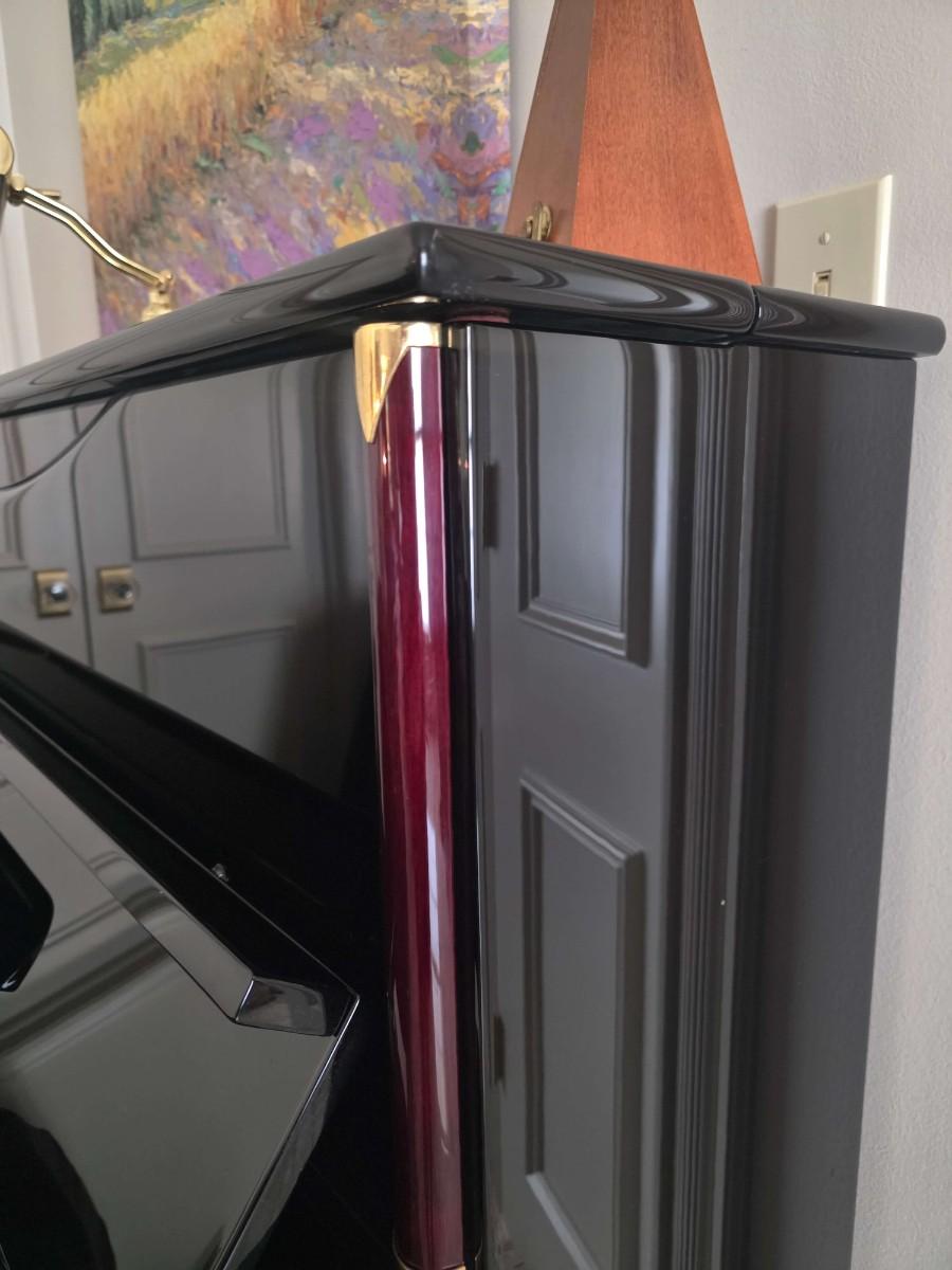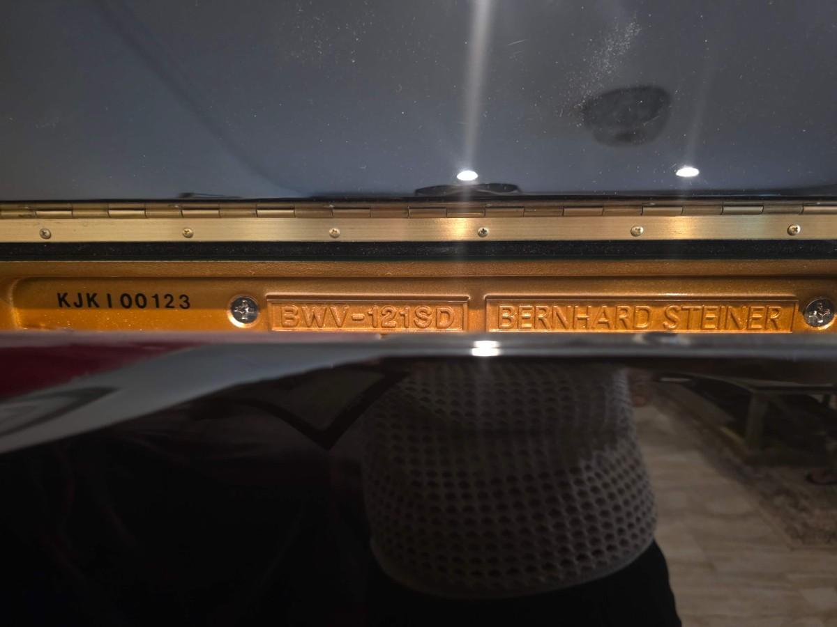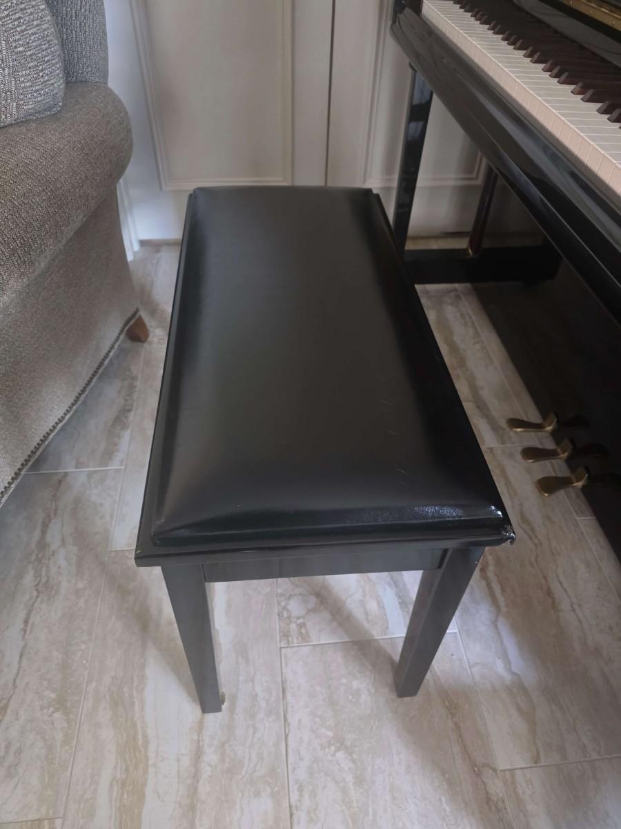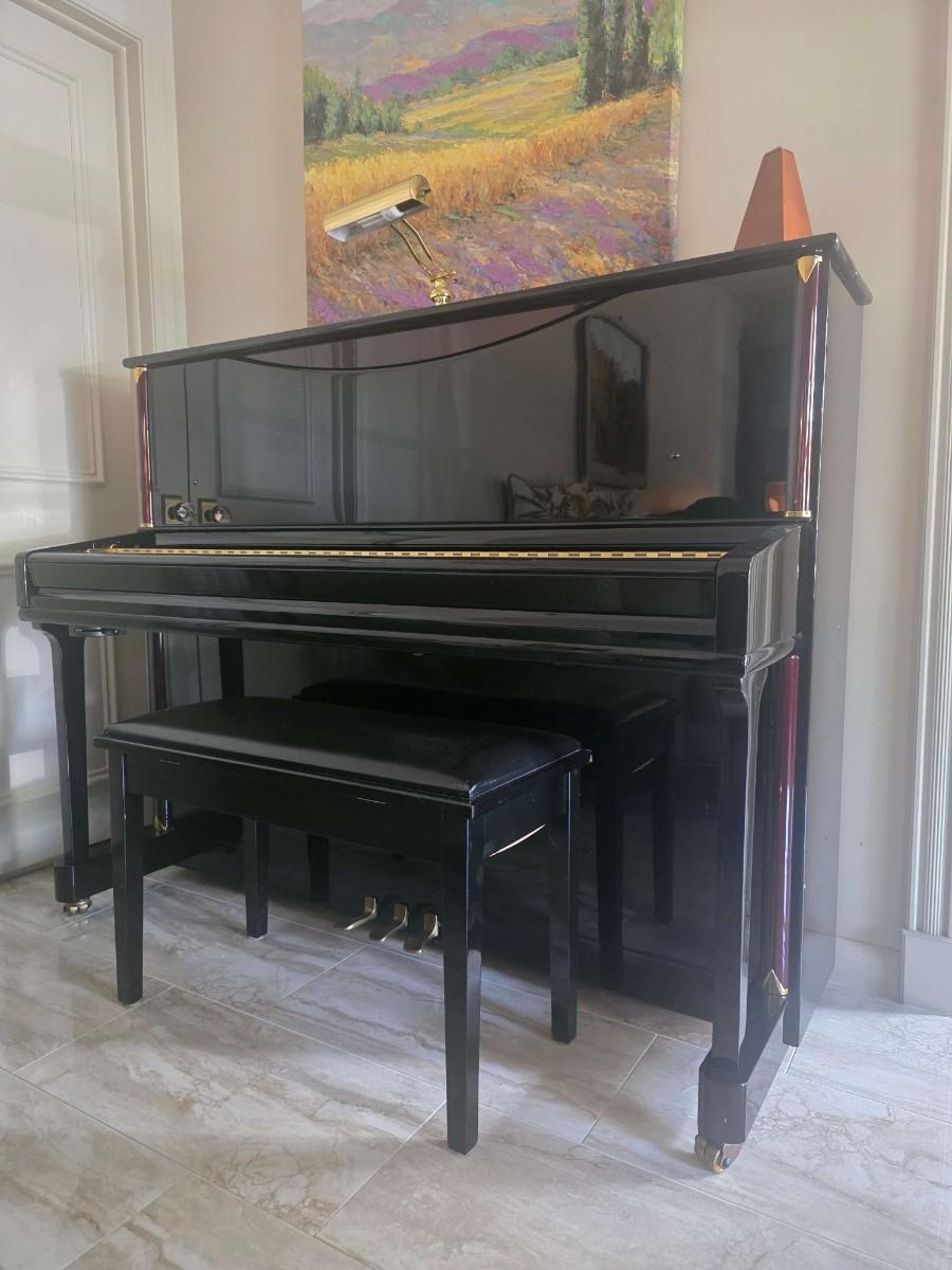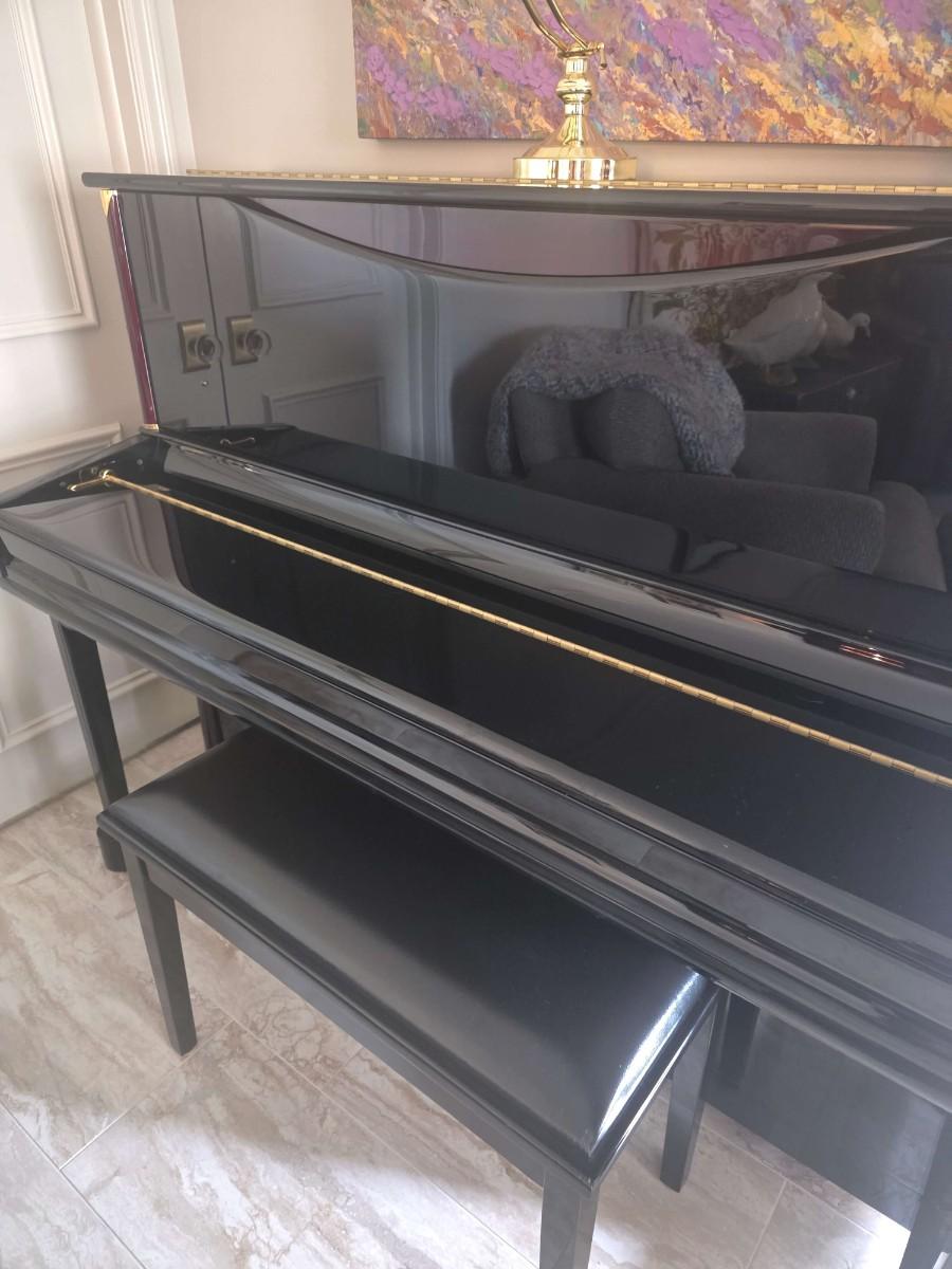 This polished ebony piano is an absolute stunner, complemented with cherry wood and brass accents. Research indicates Bernhard Steiner began manufacturing in Germany in the late 1880s, before transitioning to South Africa in the 1940s, and eventually being acquired by Korean manufacturer, Samick in the late 1990s or early 2000s. During this phase, it is possible that the pianos were made by Young Chang. This specific piano has had a single owner and was purchased roughly 20 years ago, with its most recent tuning 5 years ago. Notably, the piano has been kept in pristine condition, displayed in a clean, climate controlled, smoke free environment. In my assessment, as someone not highly familiar with pianos, this instrument is truly exceptional, boasting a glossy ebony finish and wood grain keys that render it a standout statement piece.