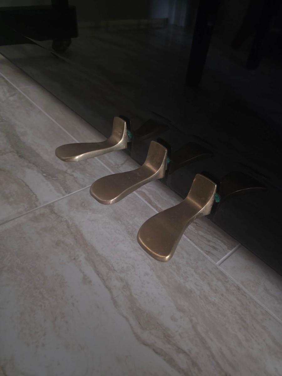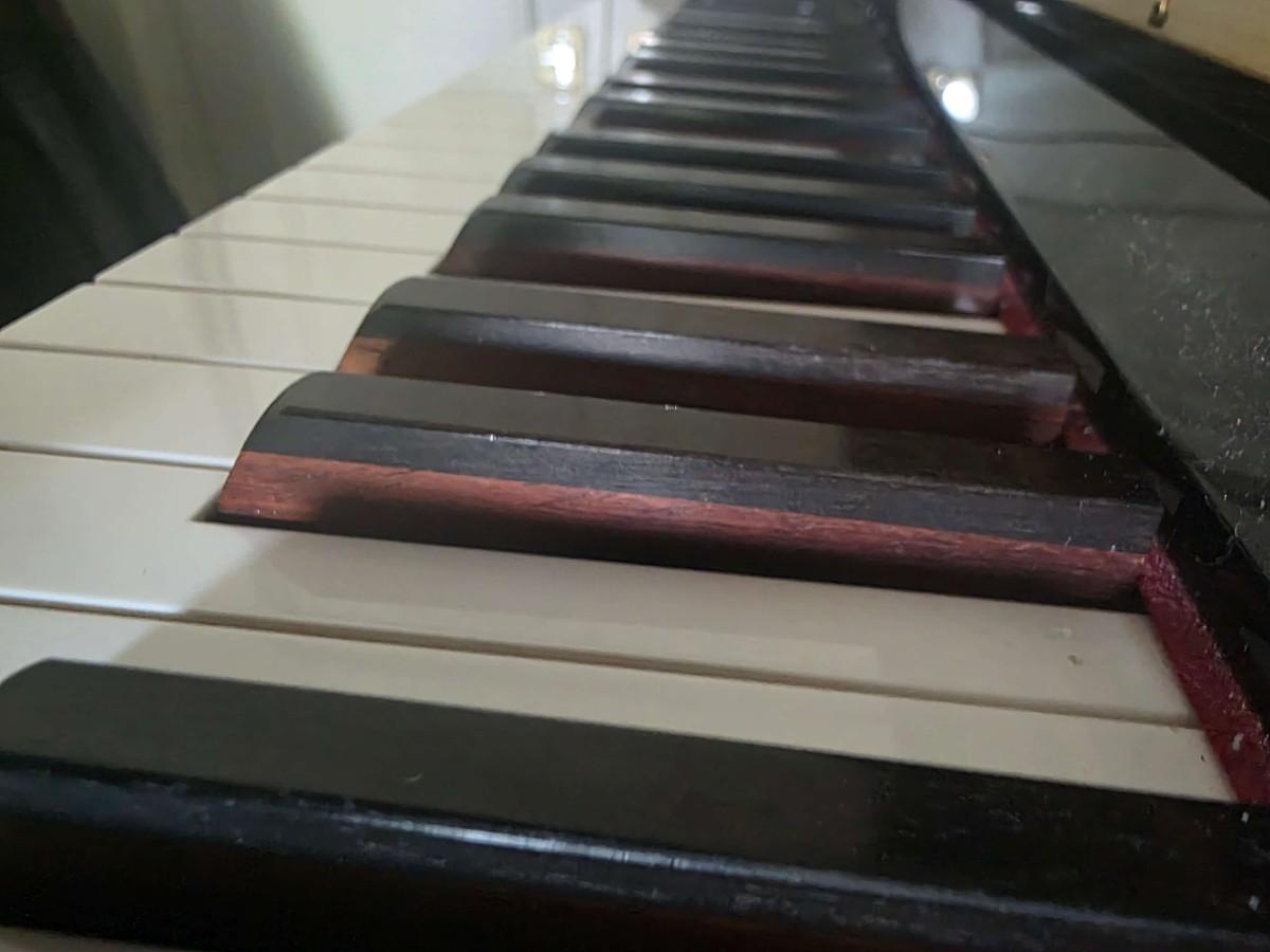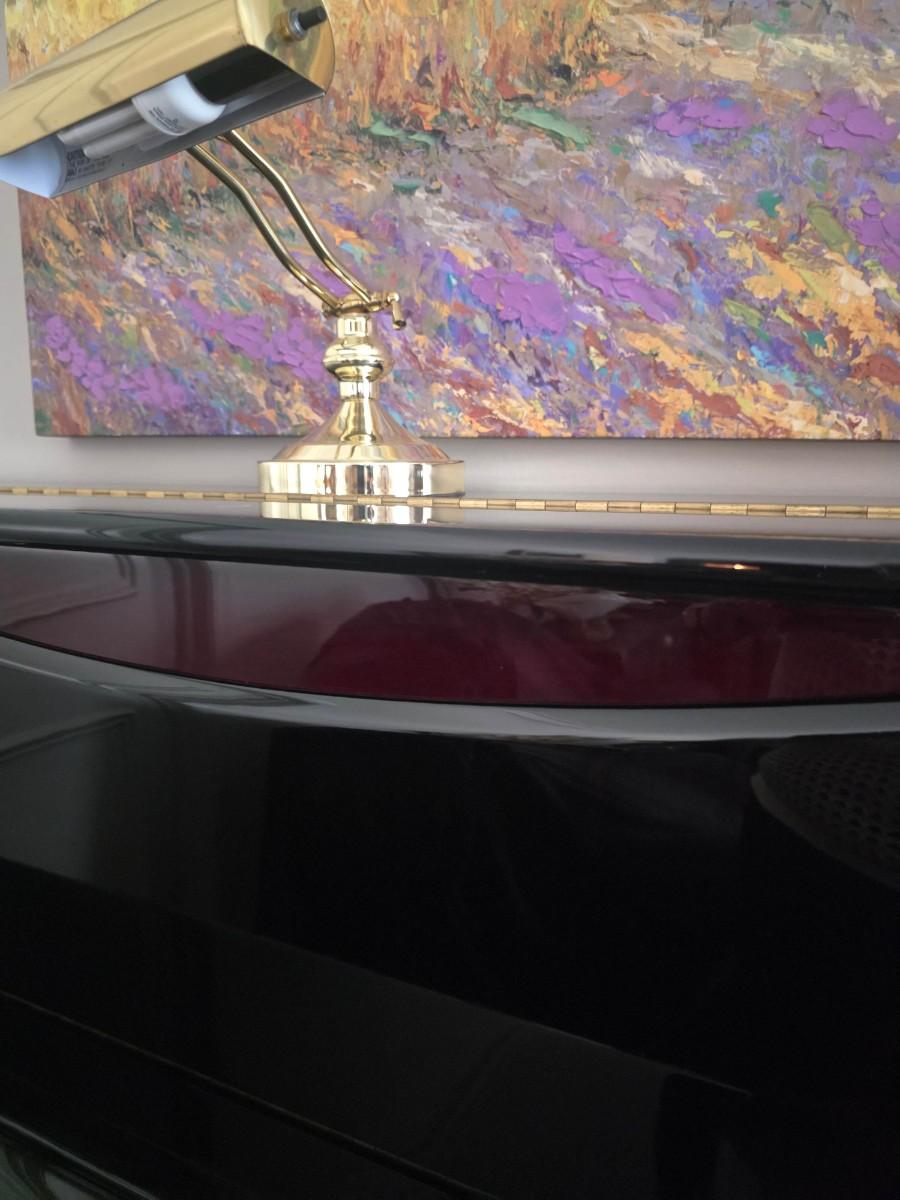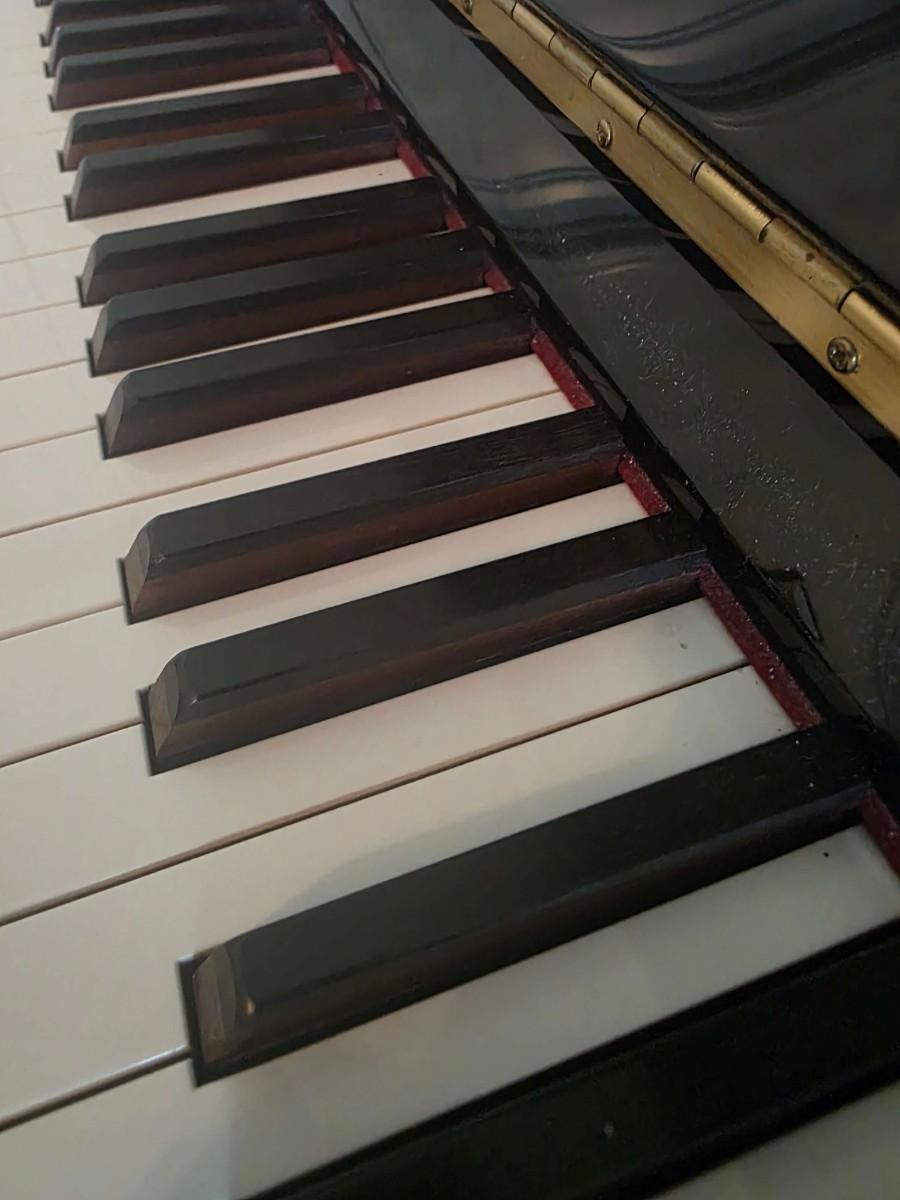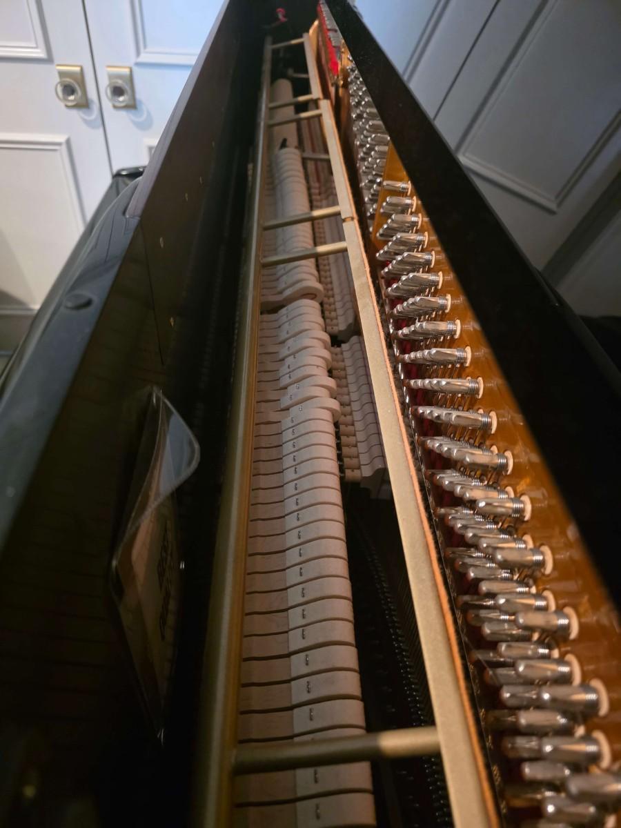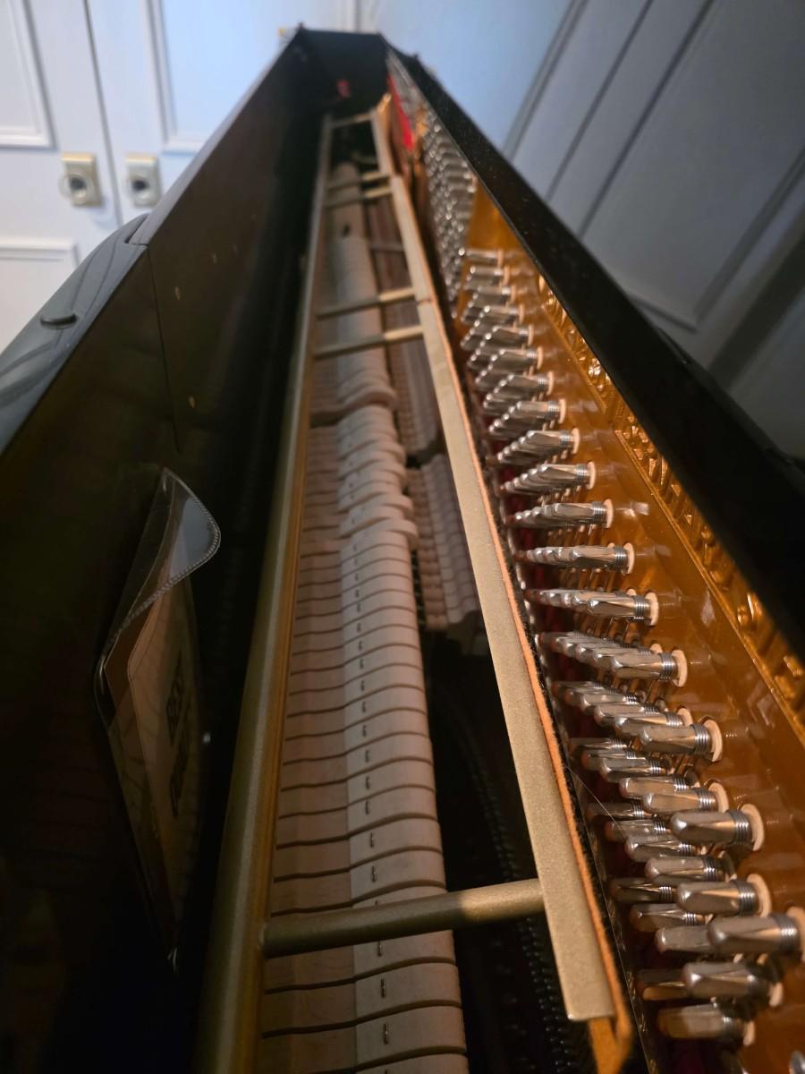 This polished ebony piano is an absolute stunner, complemented with cherry wood and brass accents. Research indicates Bernhard Steiner began manufacturing in Germany in the late 1880s, before transitioning to South Africa in the 1940s, and eventually being acquired by Korean manufacturer, Samick in the late 1990s or early 2000s. During this phase, it is possible that the pianos were made by Young Chang. This specific piano has had a single owner and was purchased roughly 20 years ago, with its most recent tuning 5 years ago. Notably, the piano has been kept in pristine condition, displayed in a clean, climate controlled, smoke free environment. In my assessment, as someone not highly familiar with pianos, this instrument is truly exceptional, boasting a glossy ebony finish and wood grain keys that render it a standout statement piece.