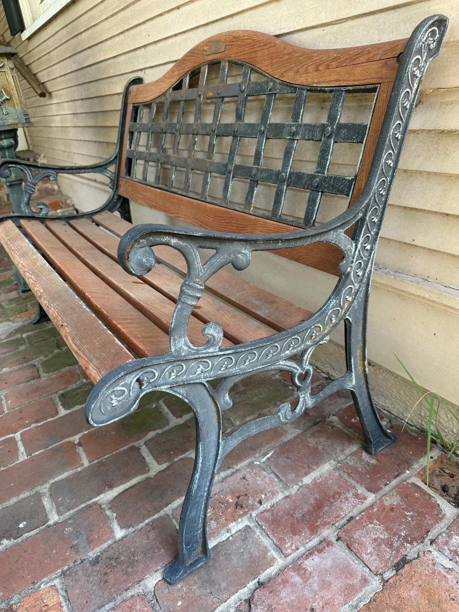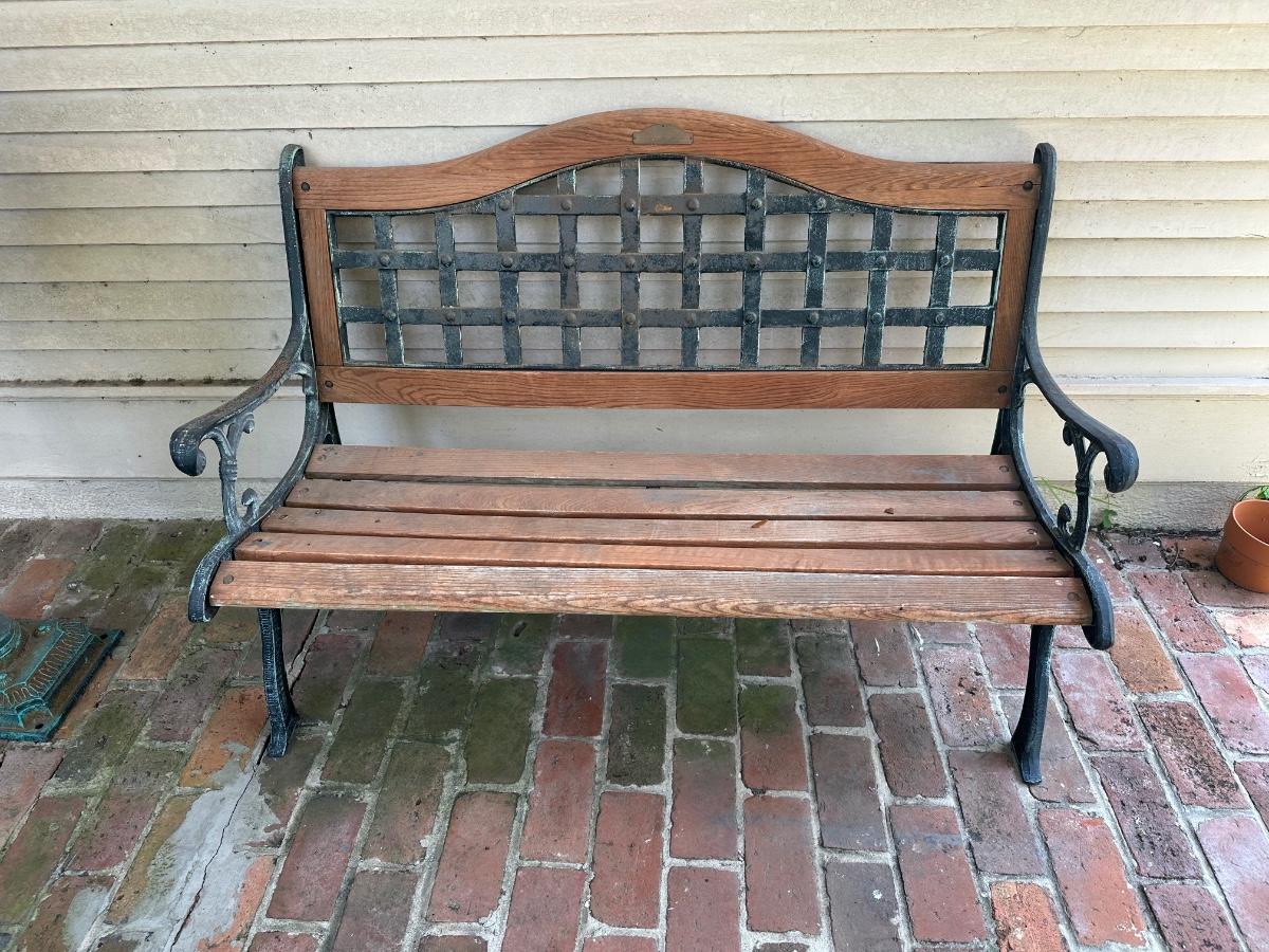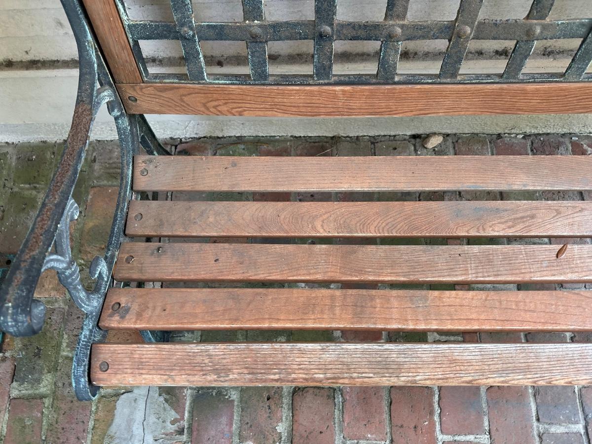 Shows outdoor wear, including rust and patina to the iron and minor weathering to the wood, as shown.