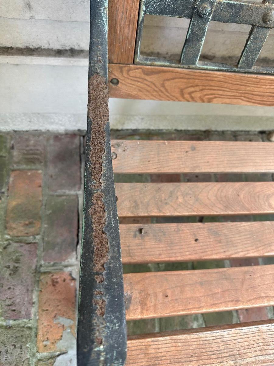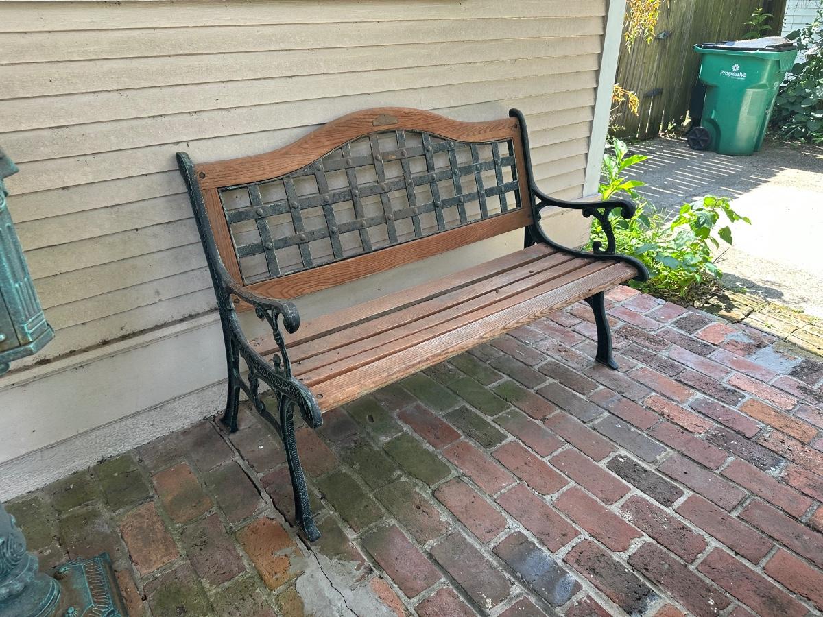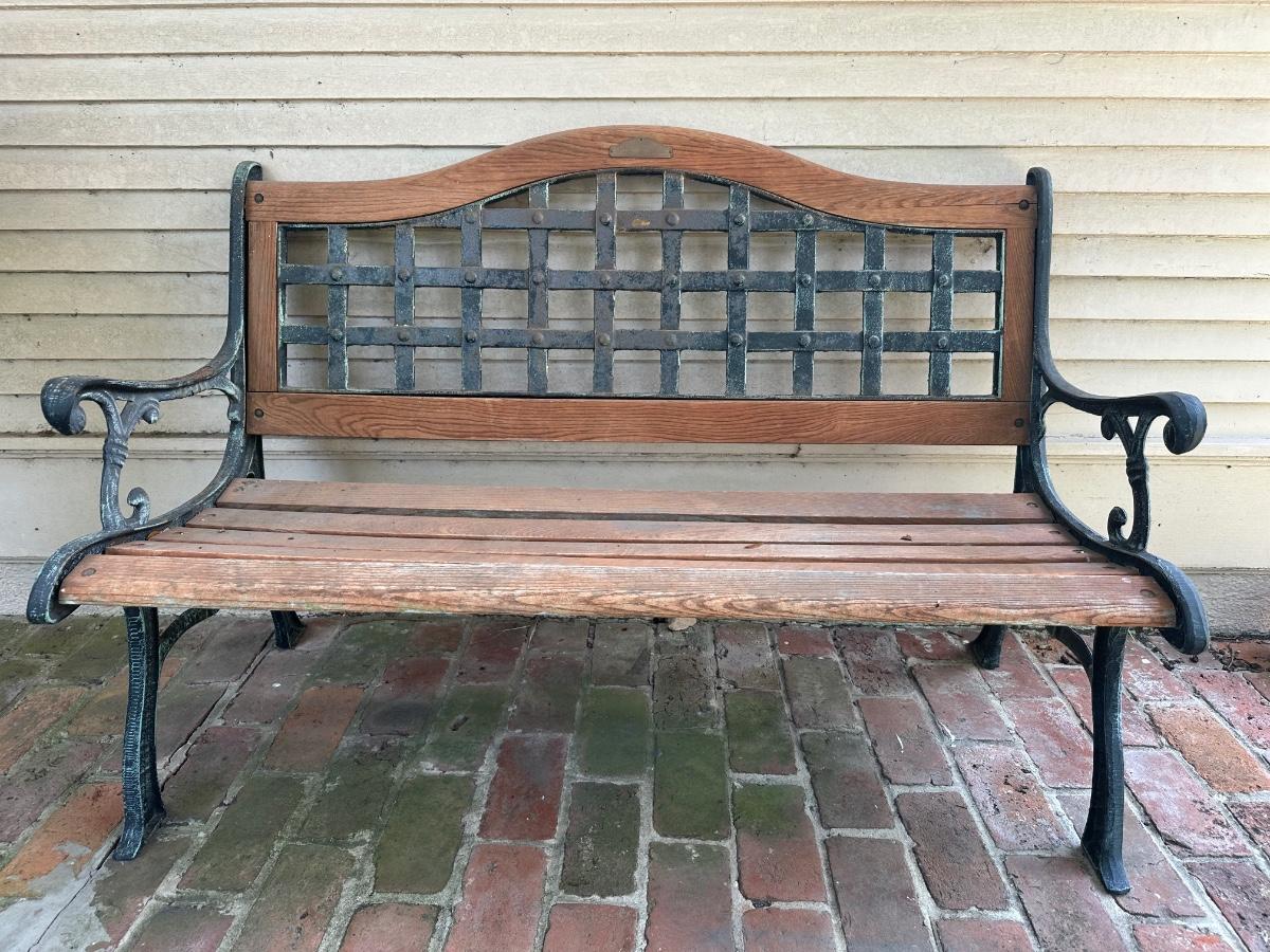Shows outdoor wear, including rust and patina to the iron and minor weathering to the wood, as shown.