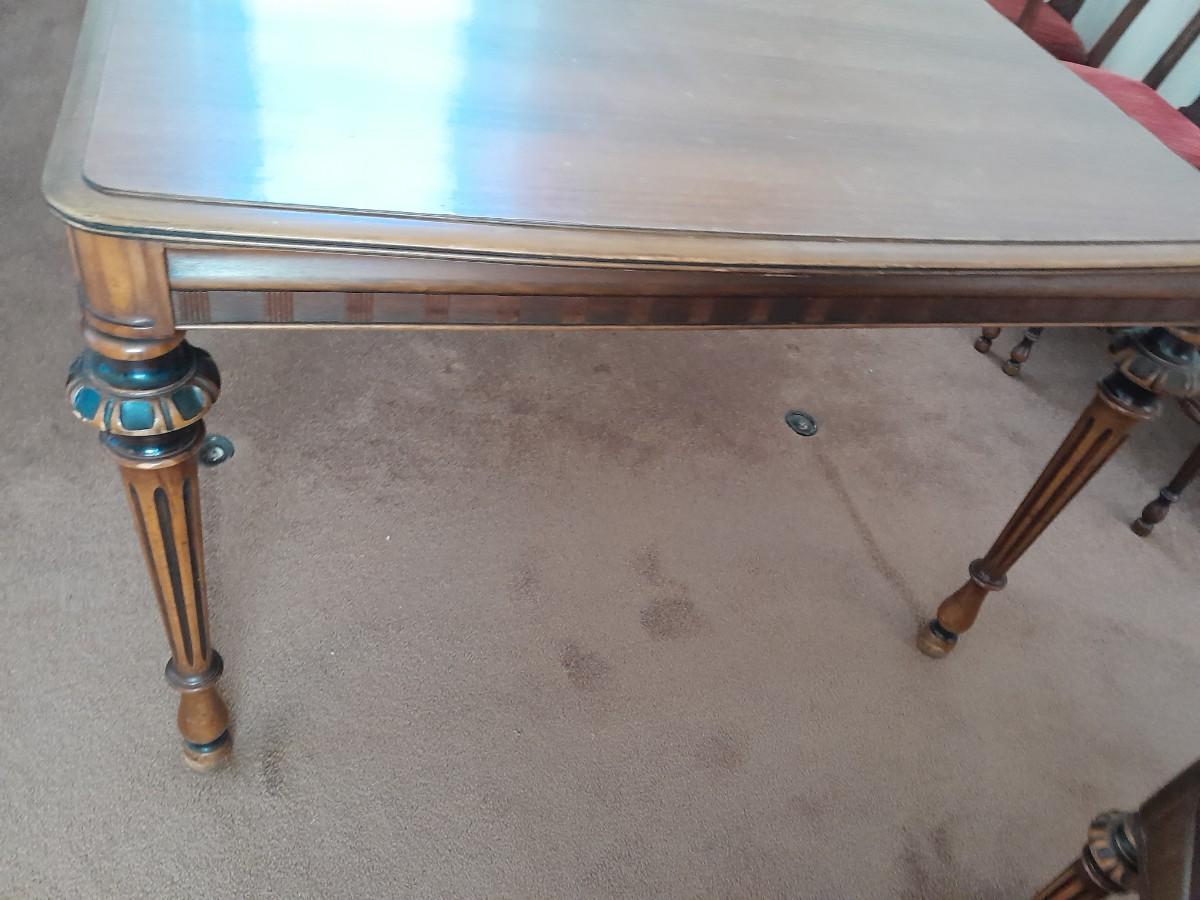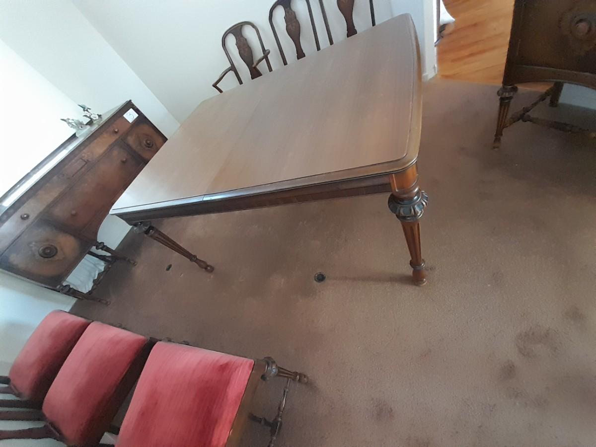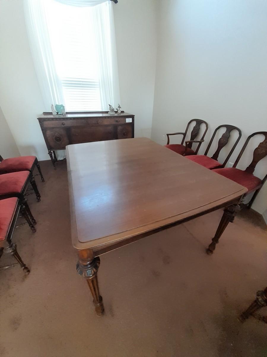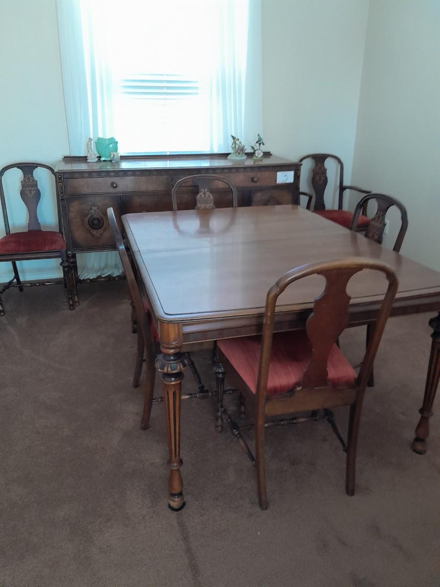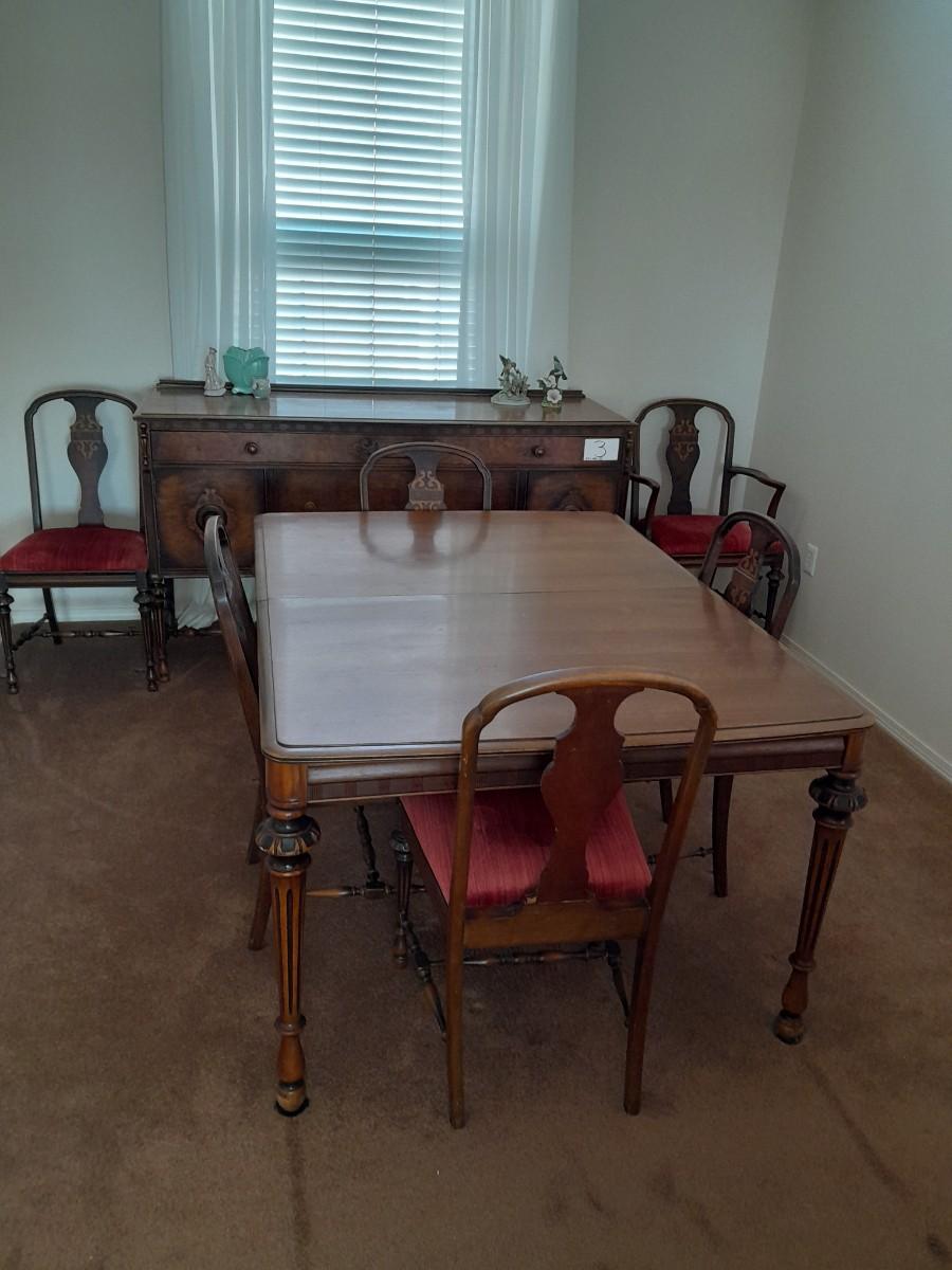 2 CAPTAINS AND 4 STANDARD CHAIRS WITH UPHOLSTERED SEATS. THIS TABLE MATCHES THE BUFFET AND SIDEBOARD. VERY GOOD CONDITION