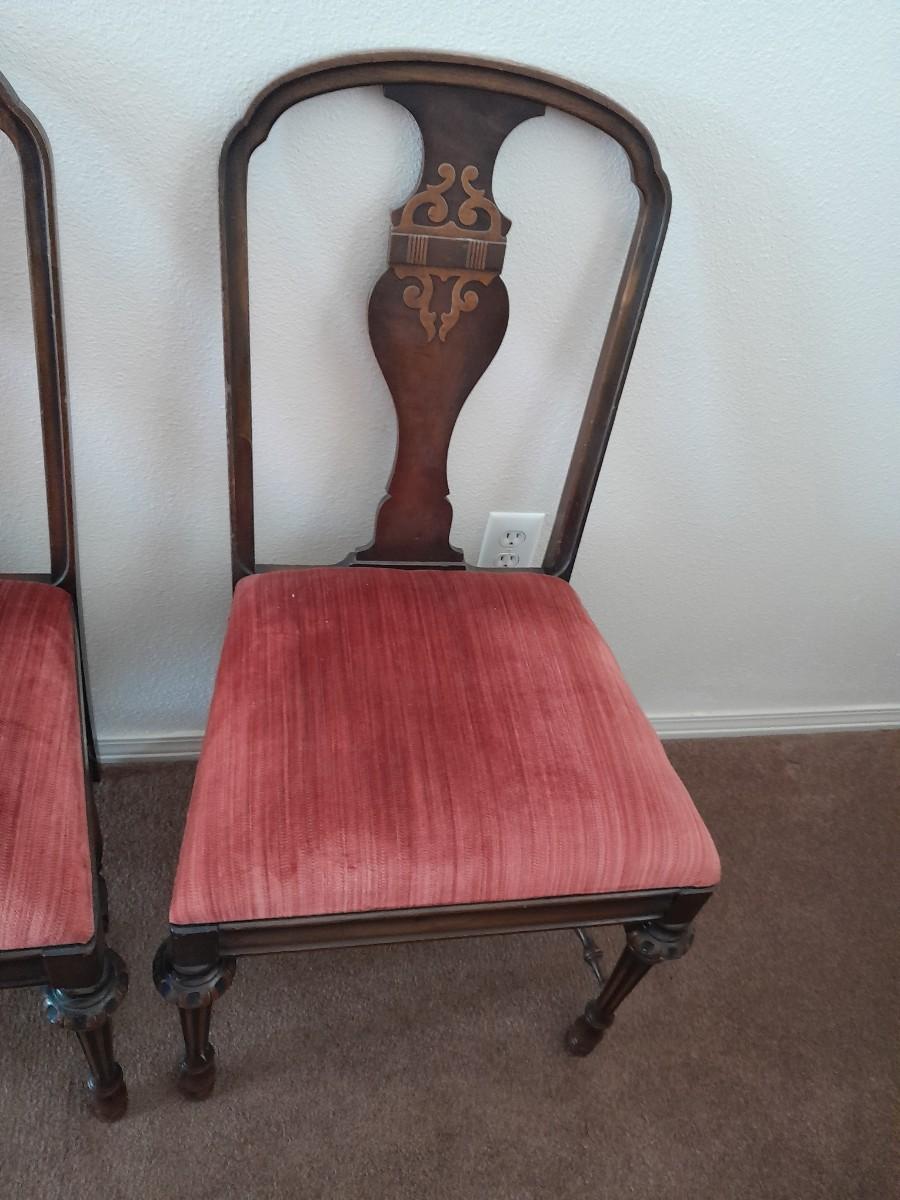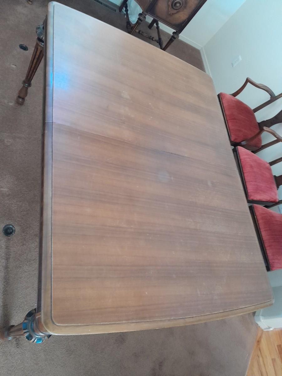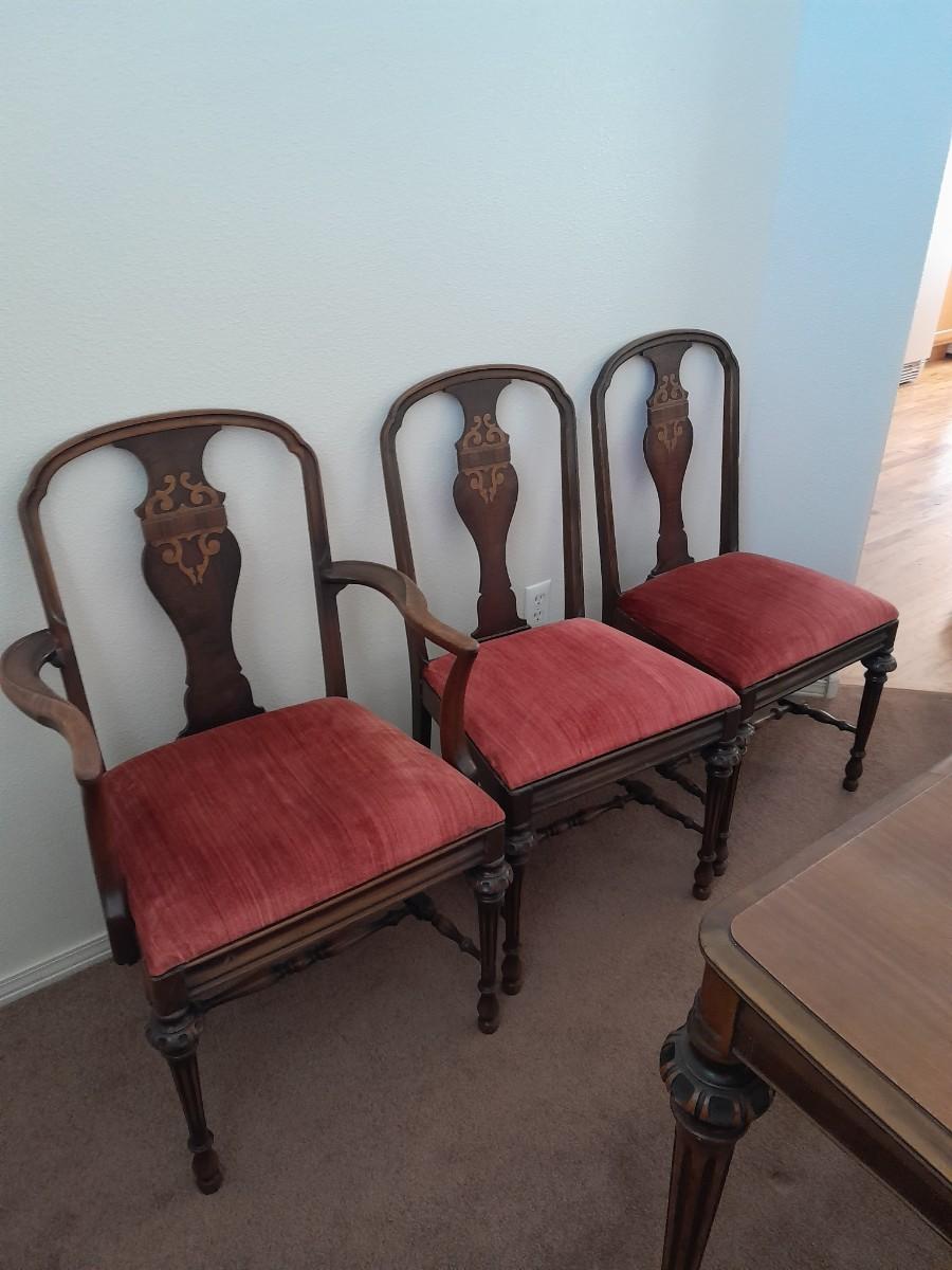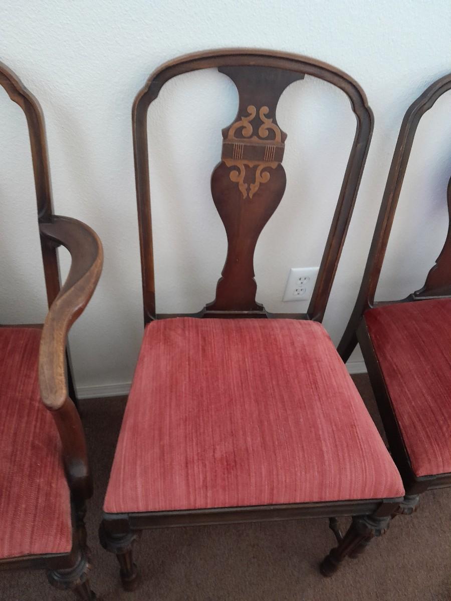 2 CAPTAINS AND 4 STANDARD CHAIRS WITH UPHOLSTERED SEATS. THIS TABLE MATCHES THE BUFFET AND SIDEBOARD. VERY GOOD CONDITION