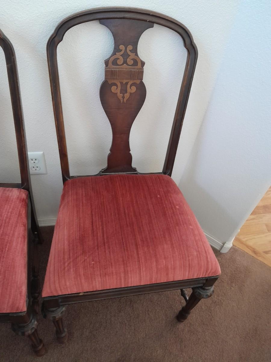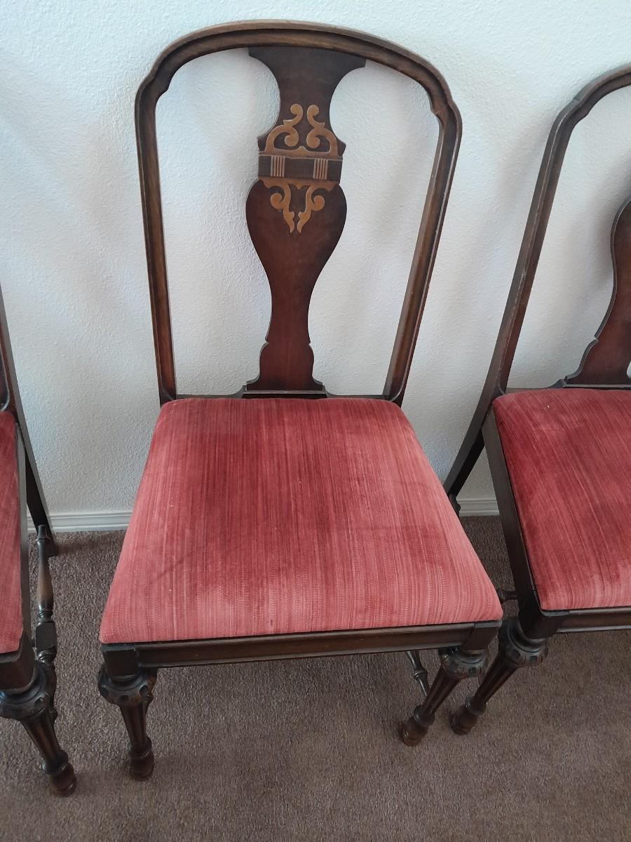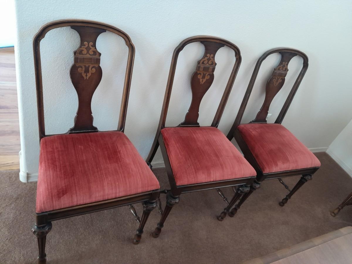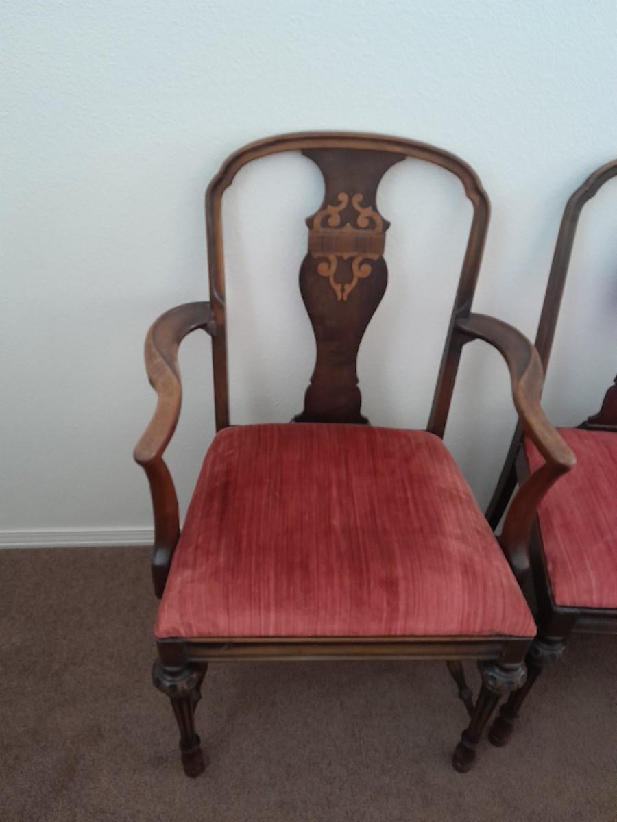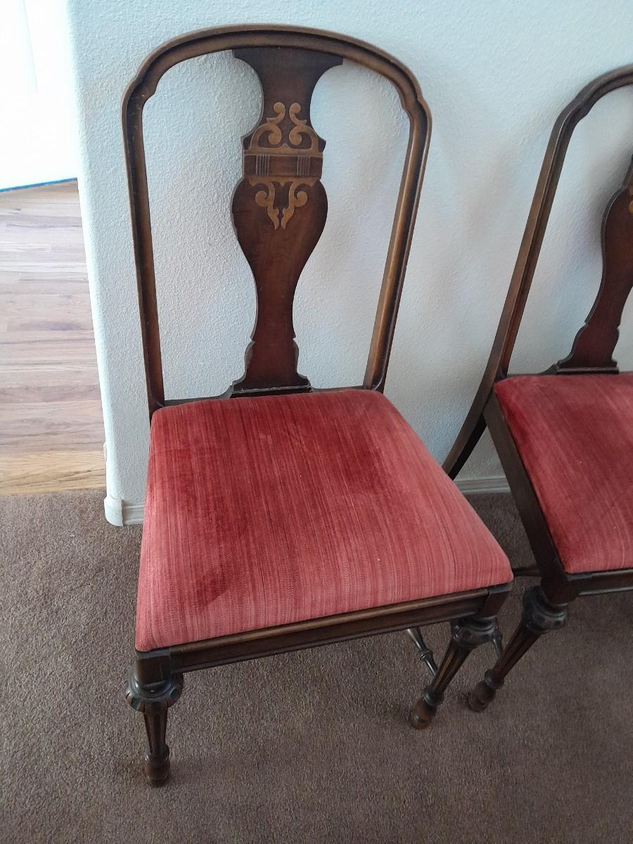 2 CAPTAINS AND 4 STANDARD CHAIRS WITH UPHOLSTERED SEATS. THIS TABLE MATCHES THE BUFFET AND SIDEBOARD. VERY GOOD CONDITION