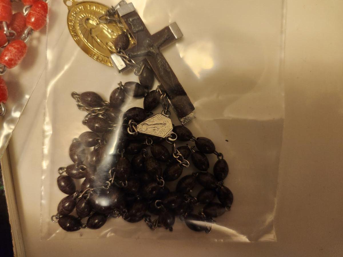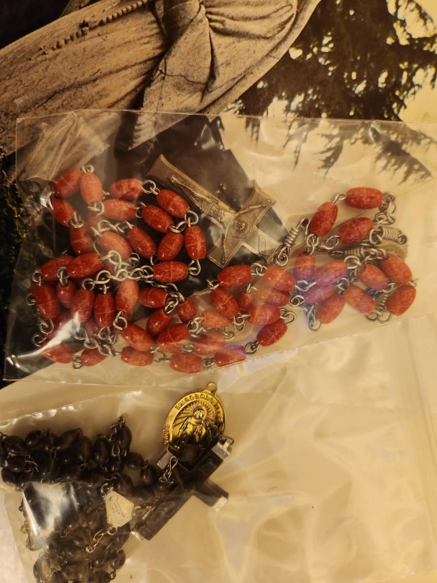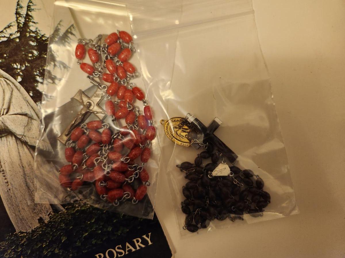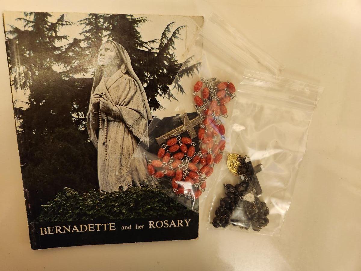 This auction lot is for a Bernadette Booklet and Two Rosaries. This small paperback booklet is a study of Marian Spirituality. It tells of the life of St. Bernadette and how the Rosary was such an important part. The 80 page booklet is used but in clean condition and ready for a good study. The crucifix of the brown rosary has some damage - see photo. The red rosary is ready for action.