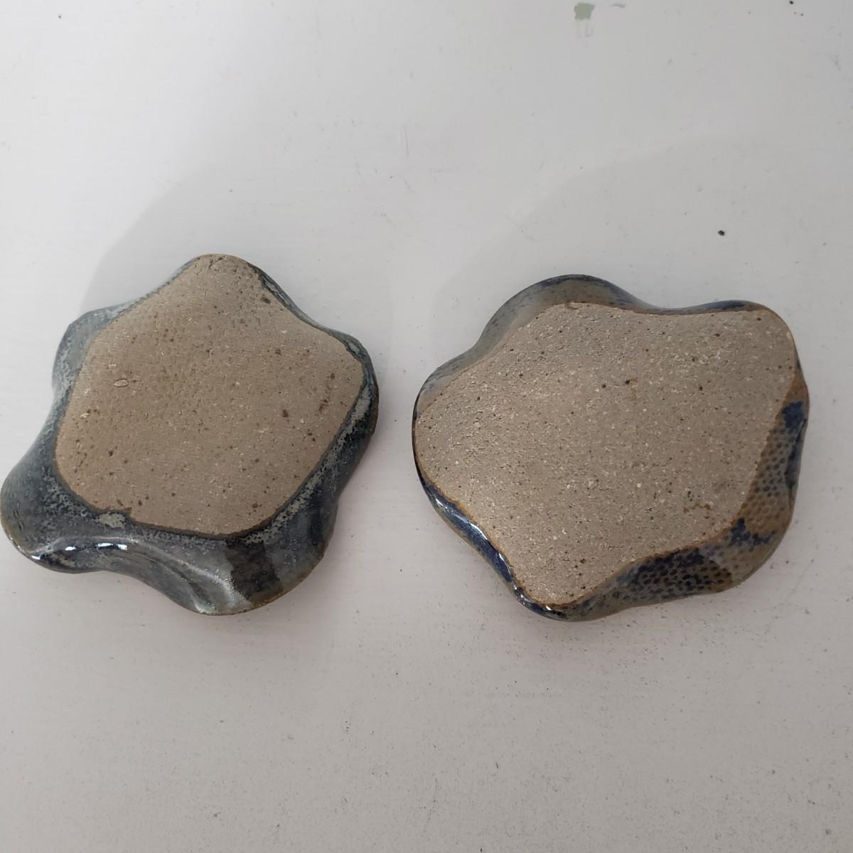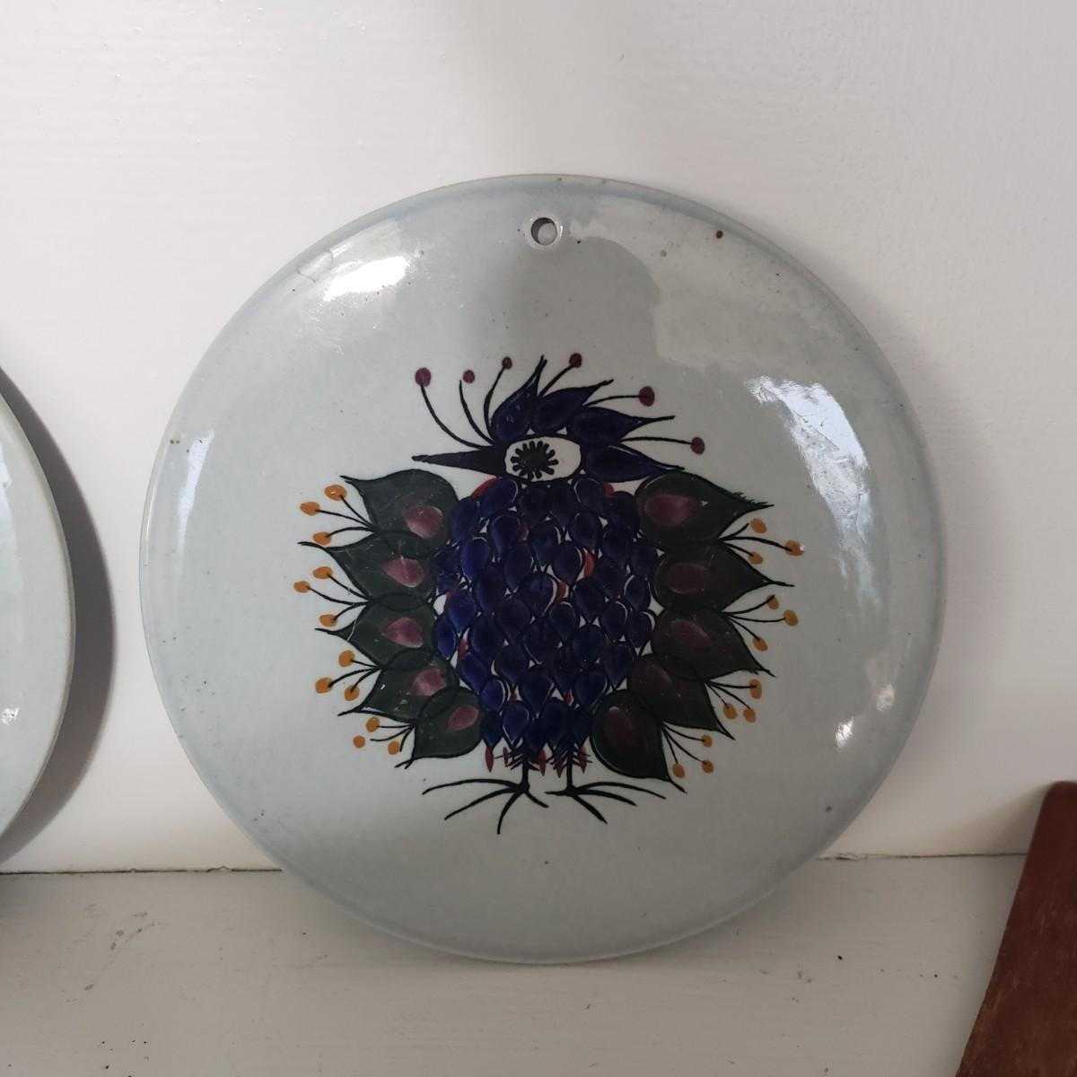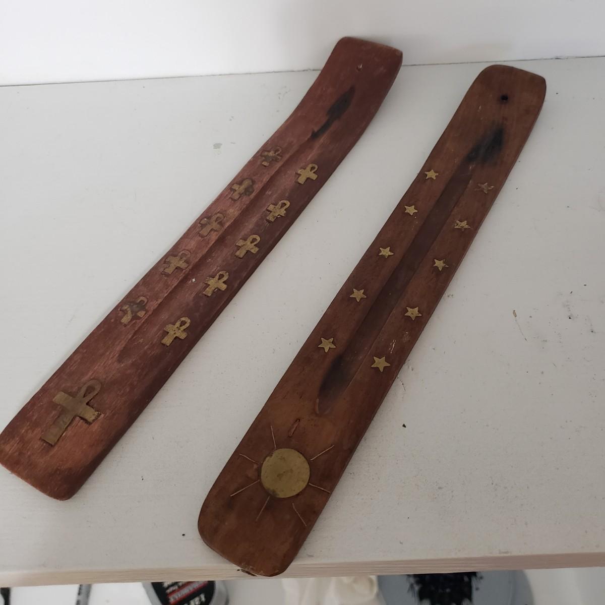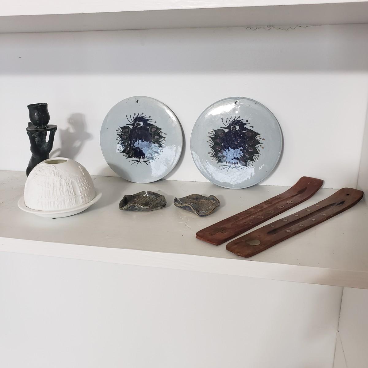 This lot features two Royal Copenhagen hand painted birds marked 128/1665. These plaques are a light blue color with a peacock like bird. They measure 6". The metal cat holding a tea cup, made in China measures approximately 4" x 1" x 6"H. The Bernardaud Limoges votive candle holder measures approximately 4" x 3"H. The art on the dome are Mona Lisa in an Italian building scene, which may be hard to see in the pictures. The two small pottery pieces measure 2". The two wooden incense holders have what looks like brass inlays.