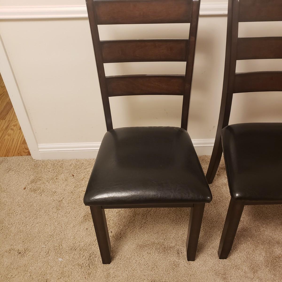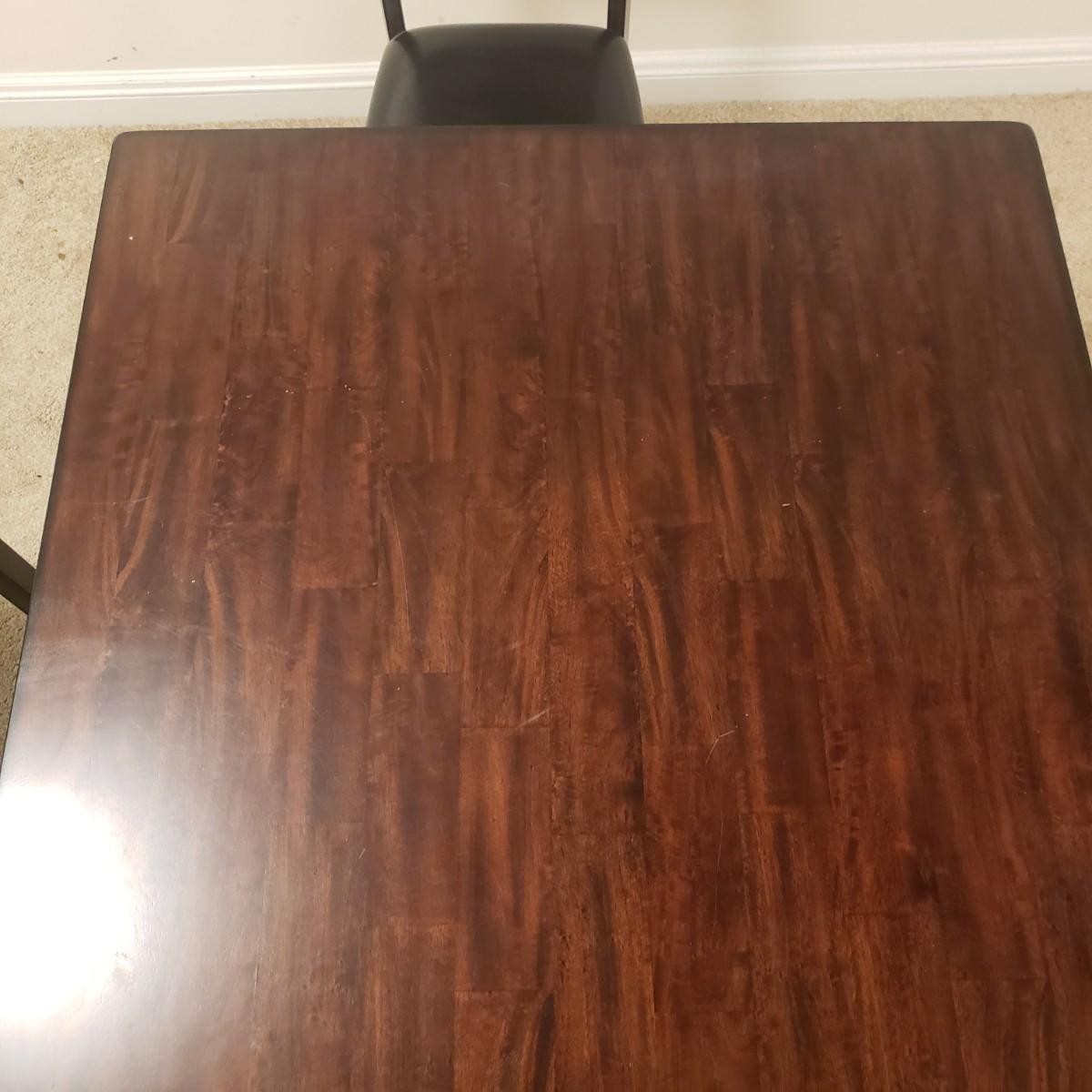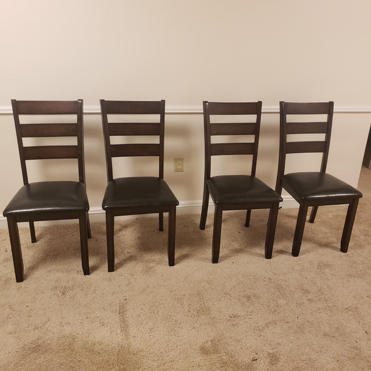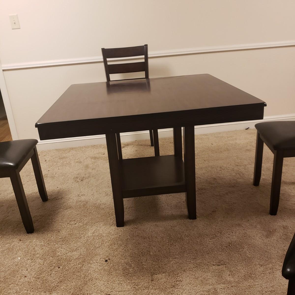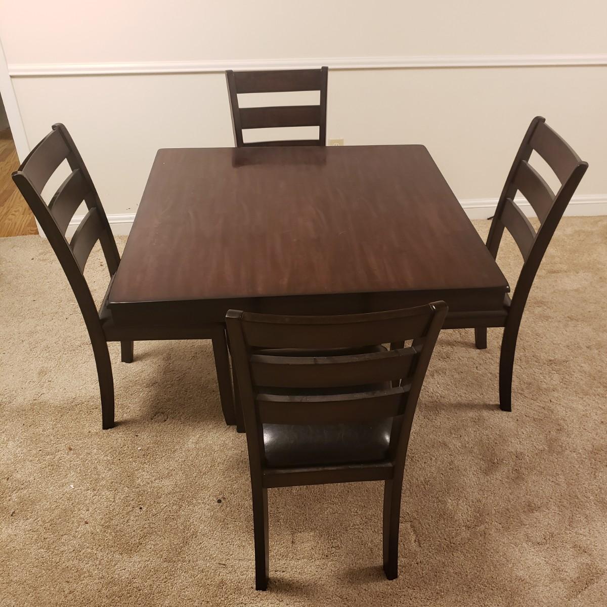 The lot contains a Bernards wooden dining table and four chairs. The table measures 40" x 40" x 30" H. There is a small platform under the table. The four chairs measure 18" x 17"x 38" H and the seat height is 19". The seats are covered with a black faux leather. The chairs could use more tightening with an allen wrench, as some are loose, but tightened up by hand. There is some wear on the table, see pictures.