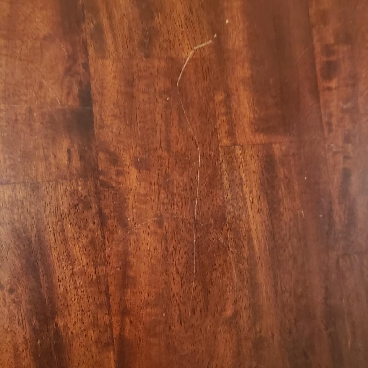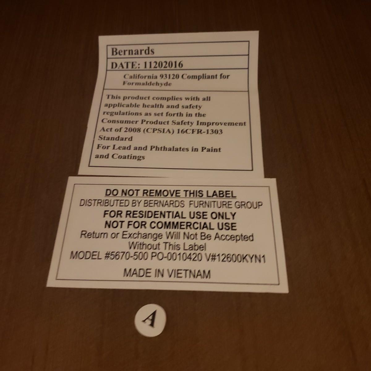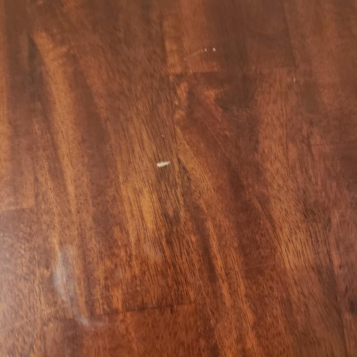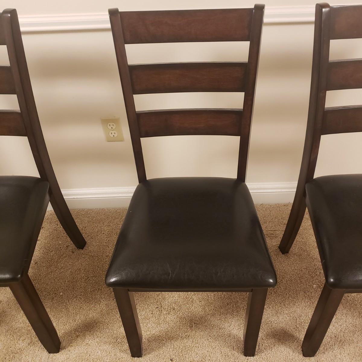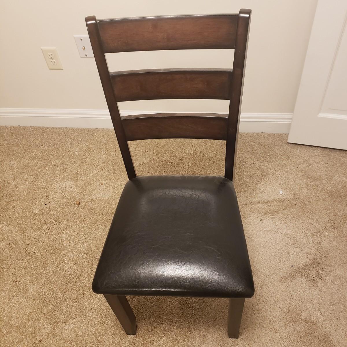 The lot contains a Bernards wooden dining table and four chairs. The table measures 40" x 40" x 30" H. There is a small platform under the table. The four chairs measure 18" x 17"x 38" H and the seat height is 19". The seats are covered with a black faux leather. The chairs could use more tightening with an allen wrench, as some are loose, but tightened up by hand. There is some wear on the table, see pictures.