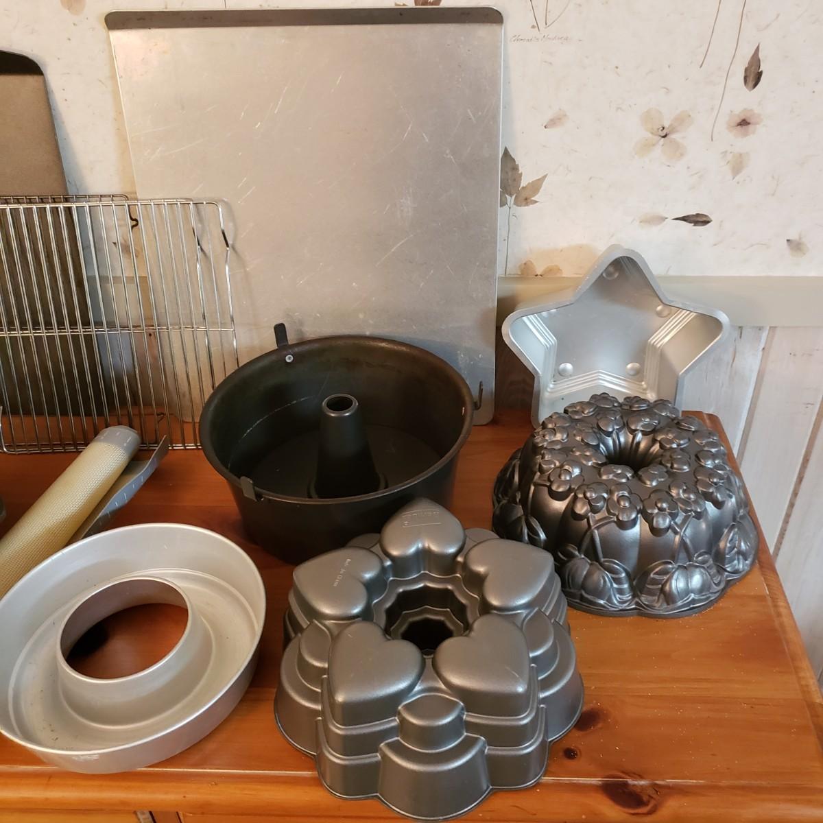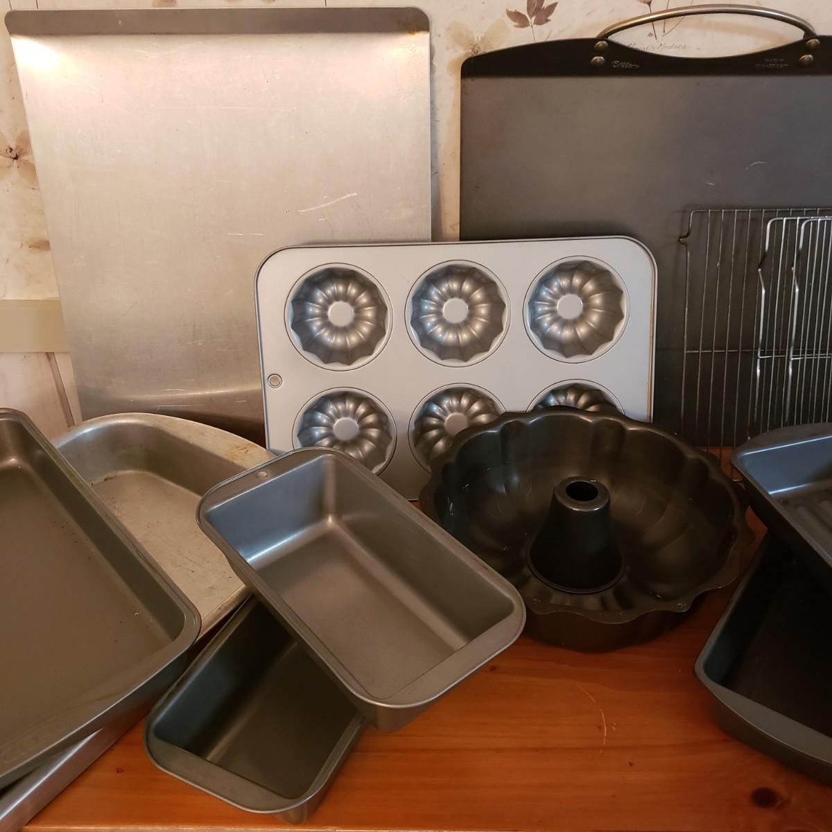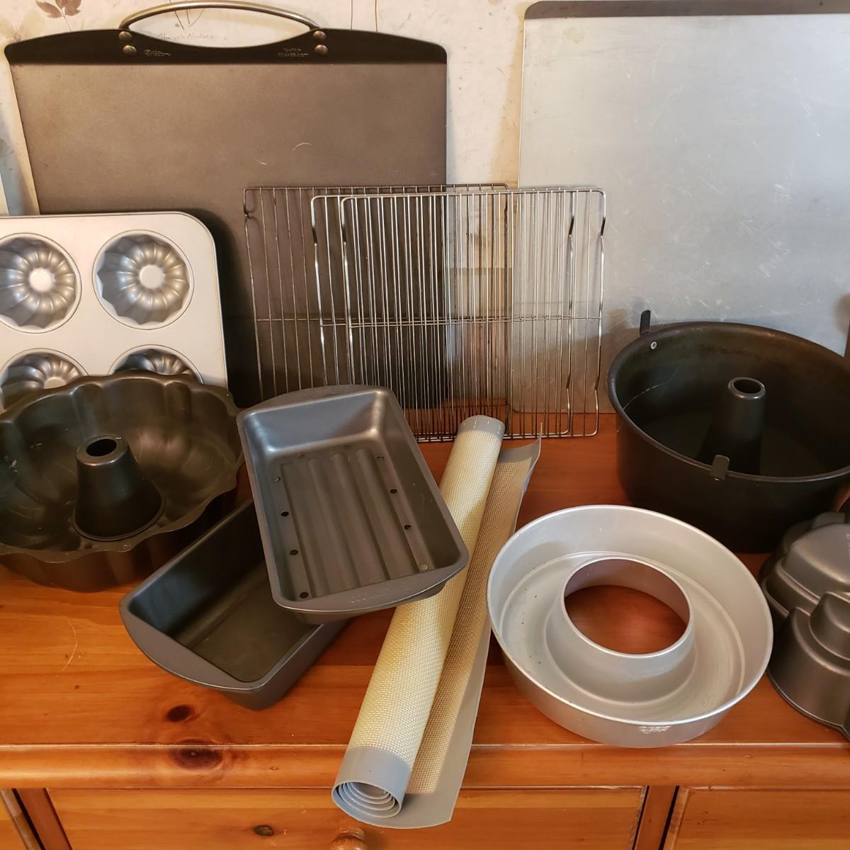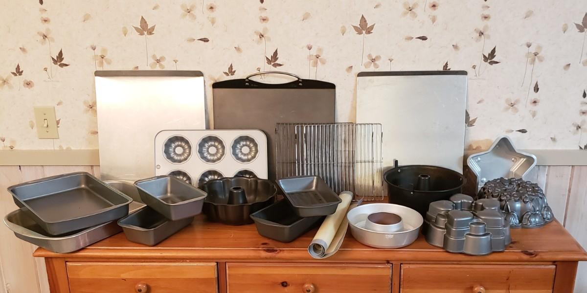 This lot contains 20 pieces of baking pans and dishes! There are 5 bundt pans, a star, circle cake pans and a heart pan from Berndes. A silicone baking mat and 3 cookie sheets; the larger one from Wilson measures 16" x 14". A large rectangle pan from Dura-Ware and an Oneida 9" x 13". A set of two Gourmetware loaf pan system. There are also 3 wire racks for cooling.