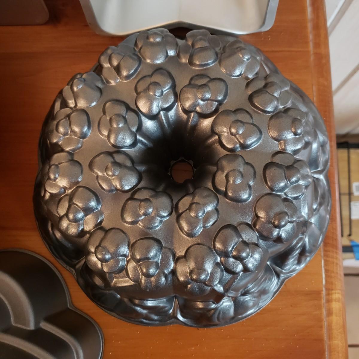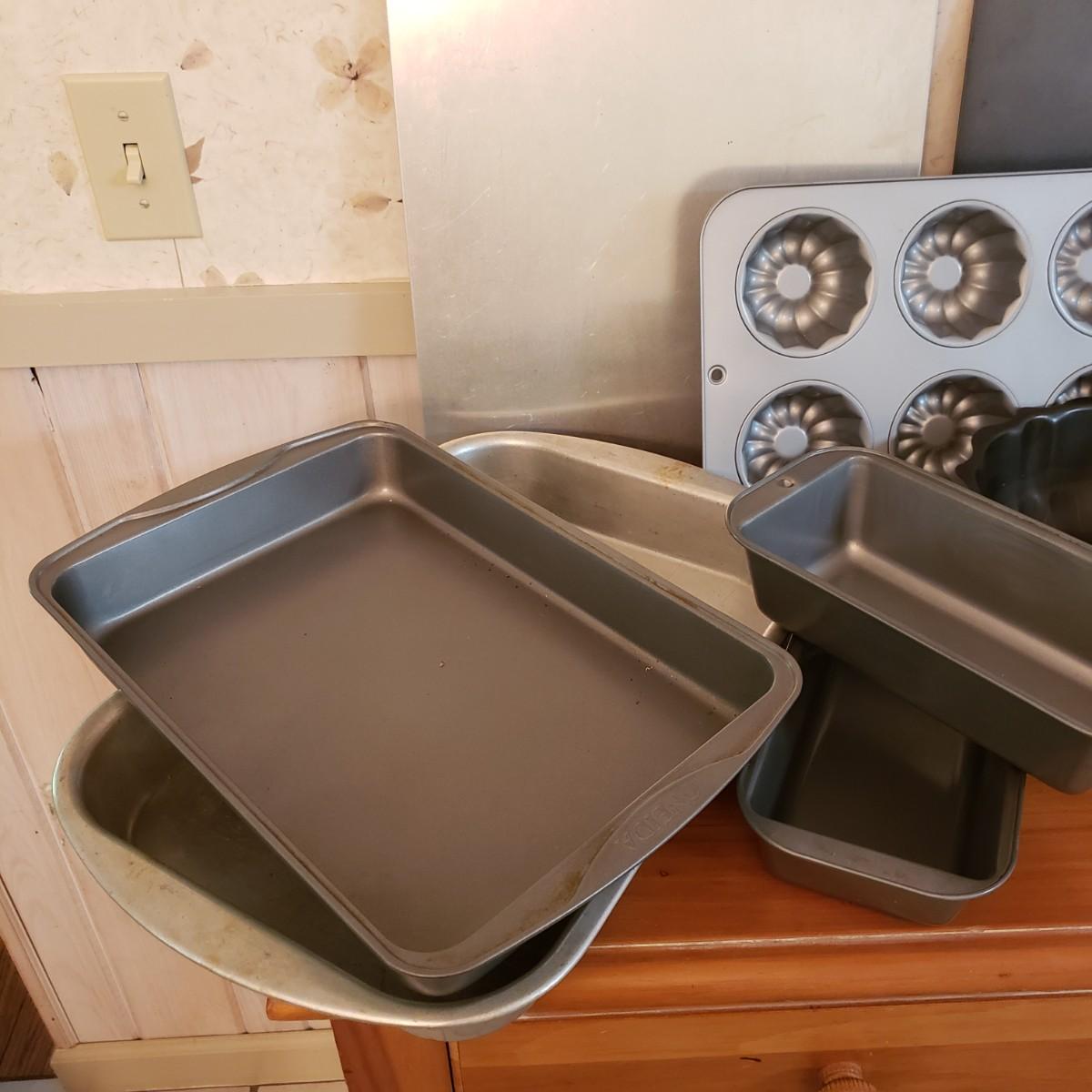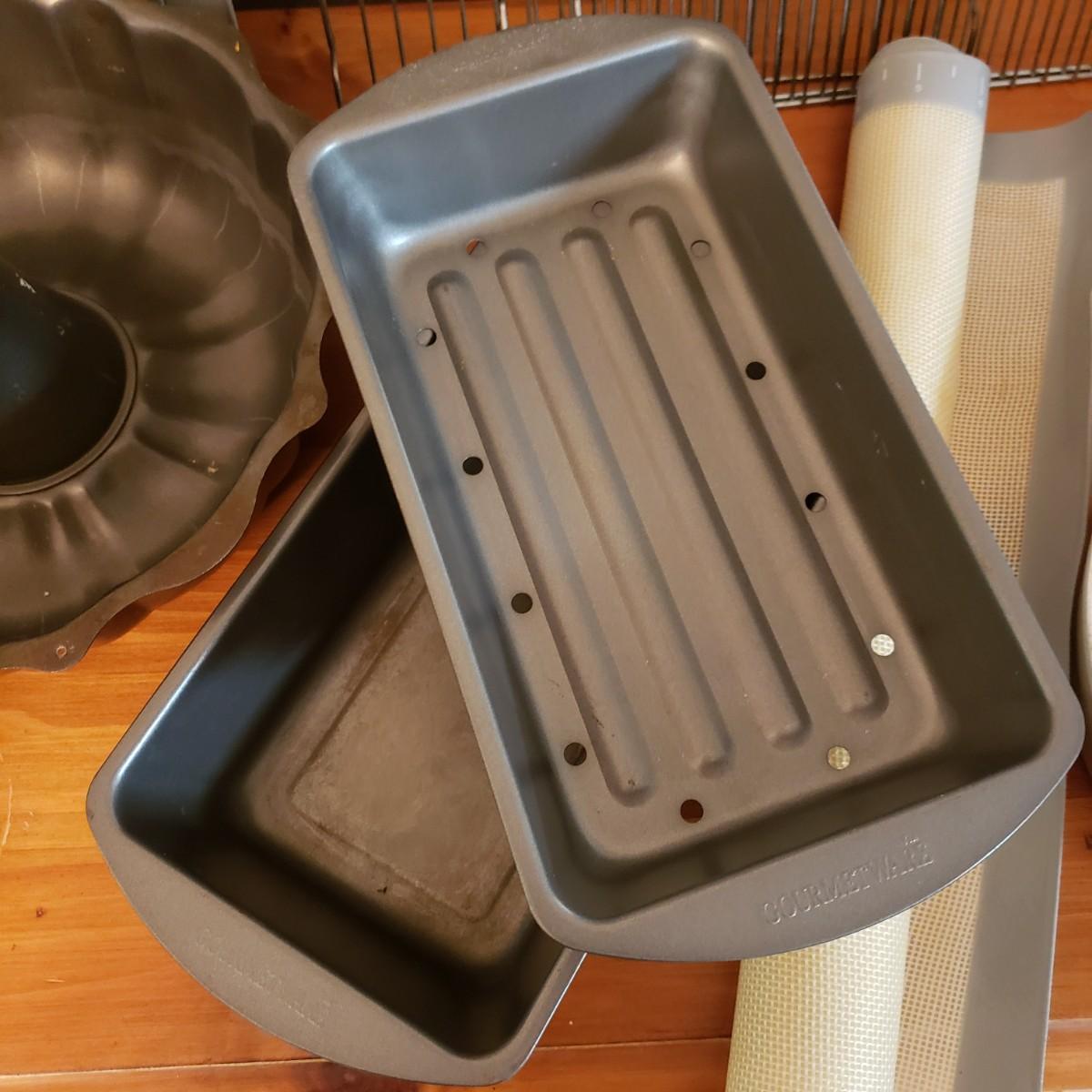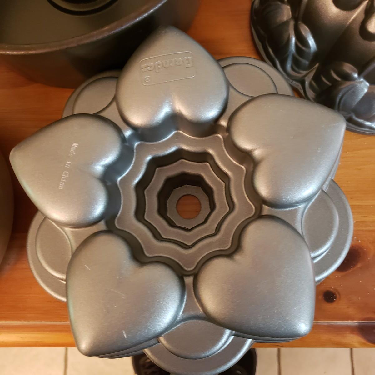 This lot contains 20 pieces of baking pans and dishes! There are 5 bundt pans, a star, circle cake pans and a heart pan from Berndes. A silicone baking mat and 3 cookie sheets; the larger one from Wilson measures 16" x 14". A large rectangle pan from Dura-Ware and an Oneida 9" x 13". A set of two Gourmetware loaf pan system. There are also 3 wire racks for cooling.