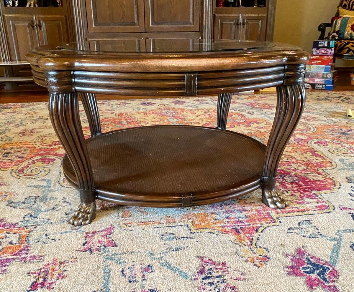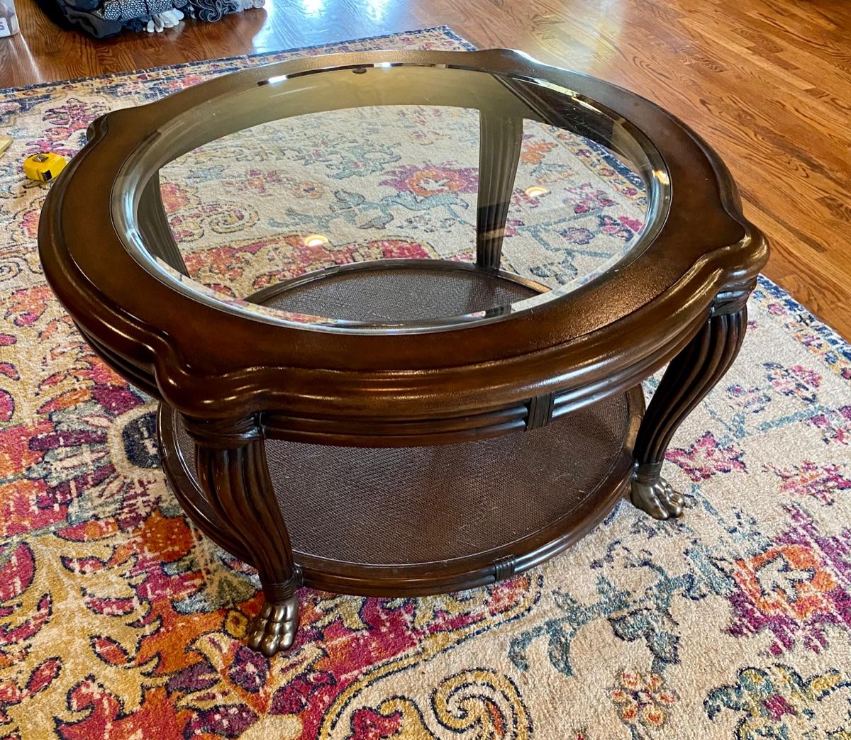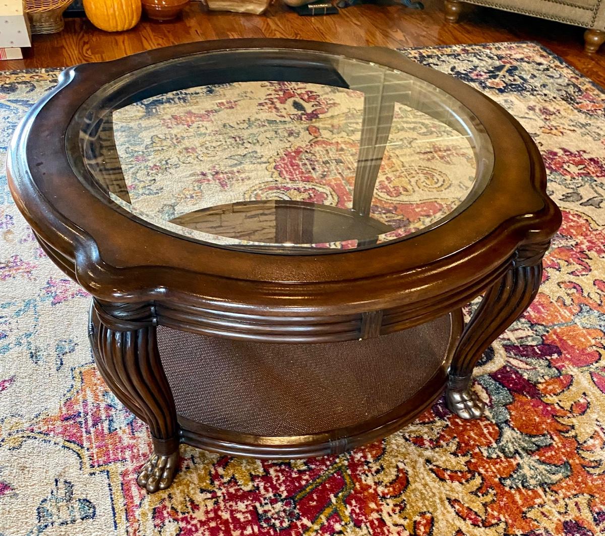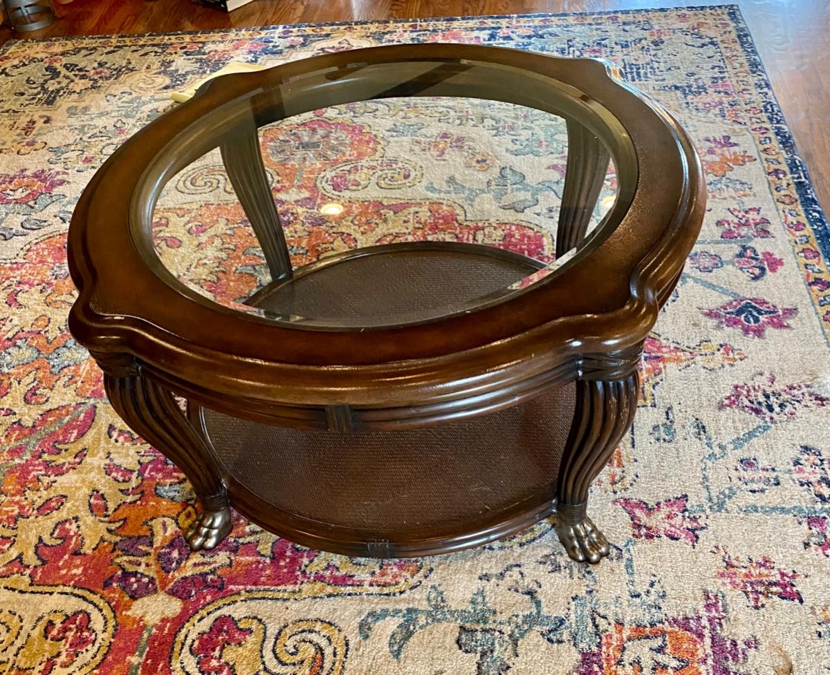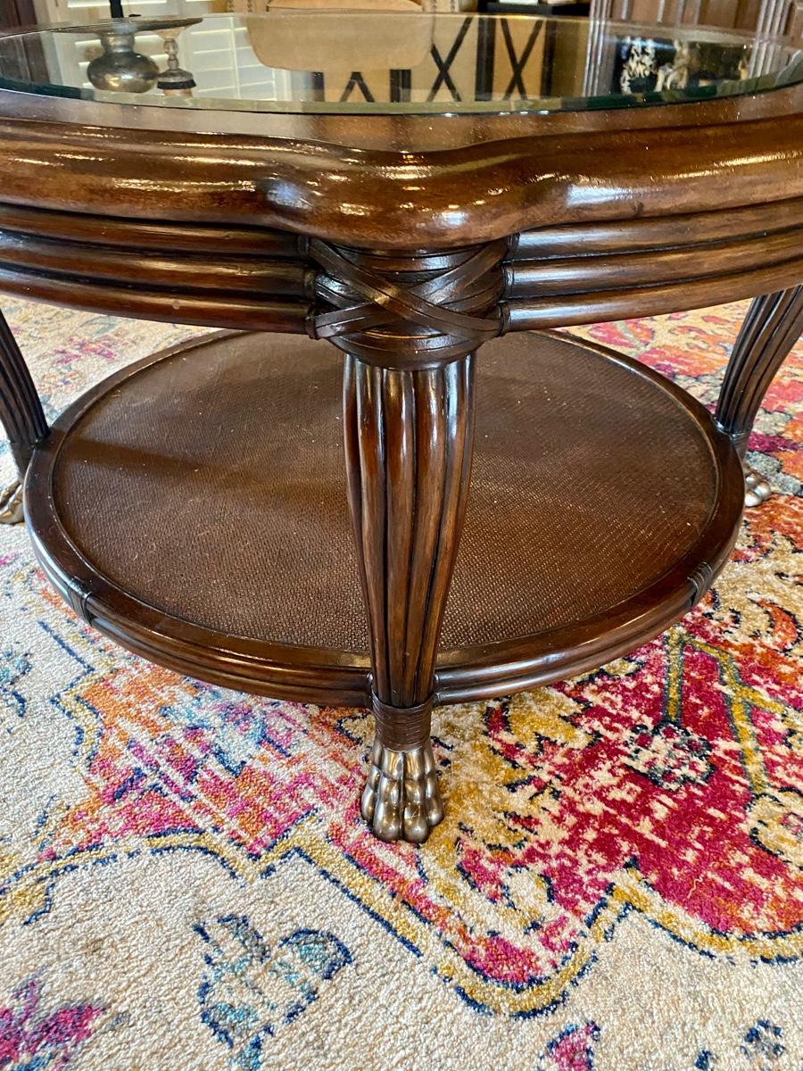 Bernhardt 41" Round coffee table features glass top, bottom shelf, ornate legs and feet, excellent condition
