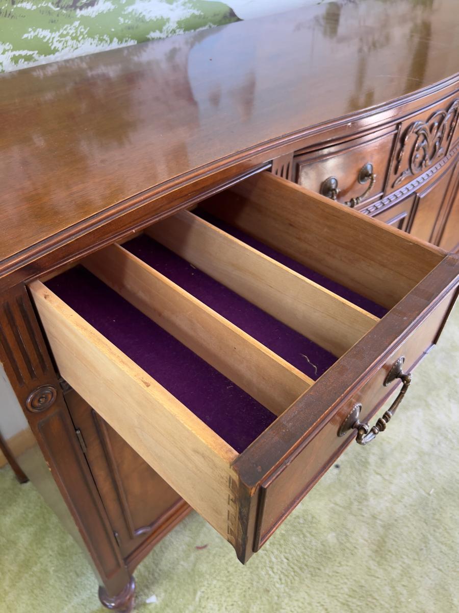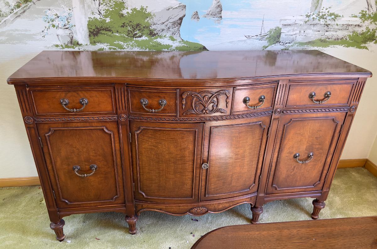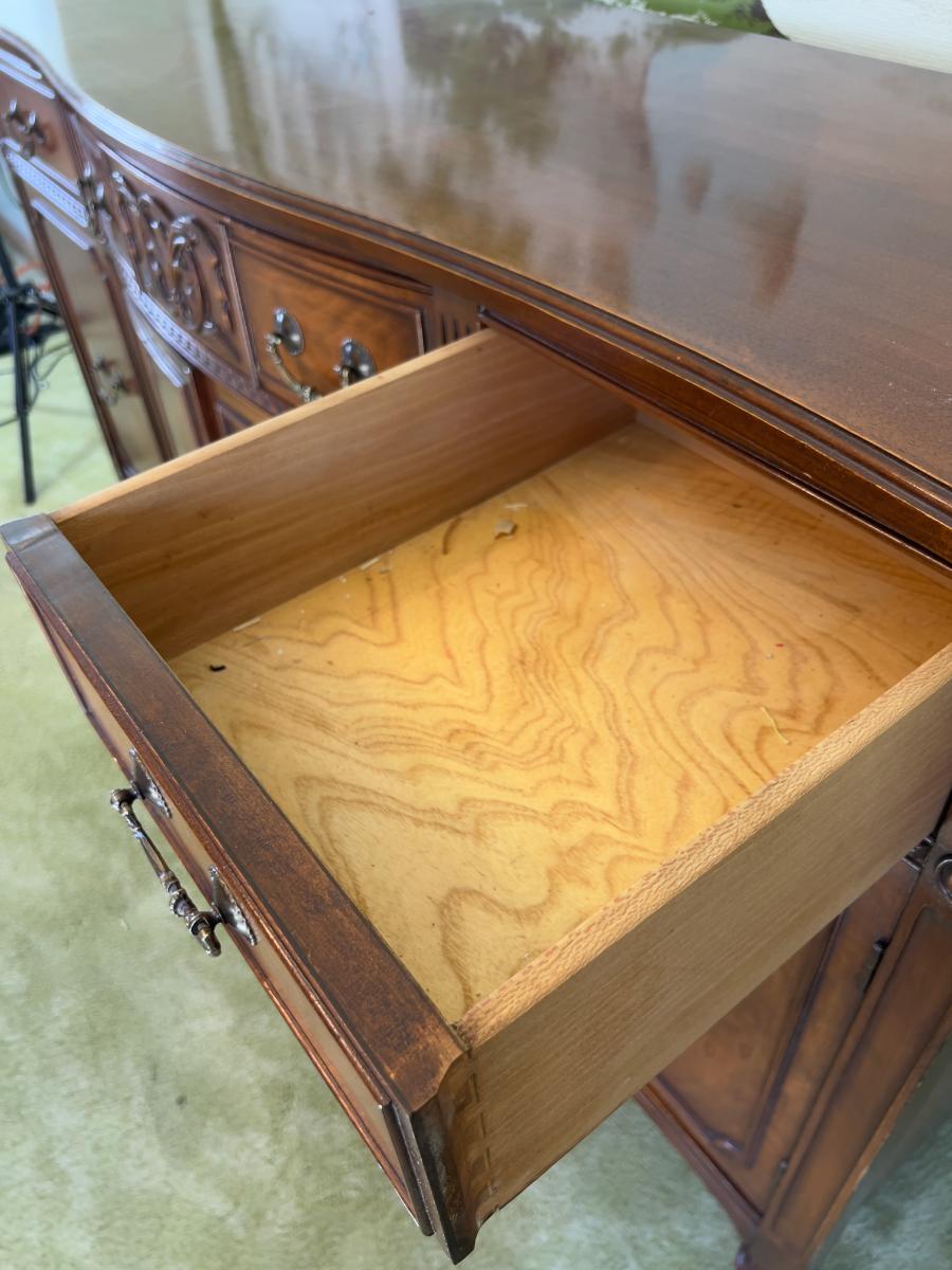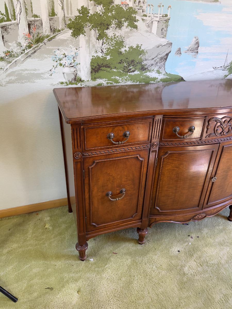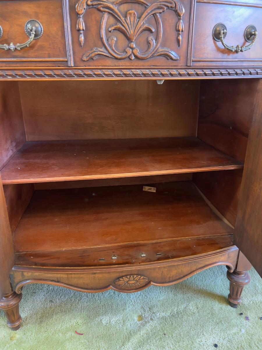 Very Good Condition. Ornate. Carved Wood. Sheraton Style. 3 Drawers 3 cupboards for the China or Whatever.