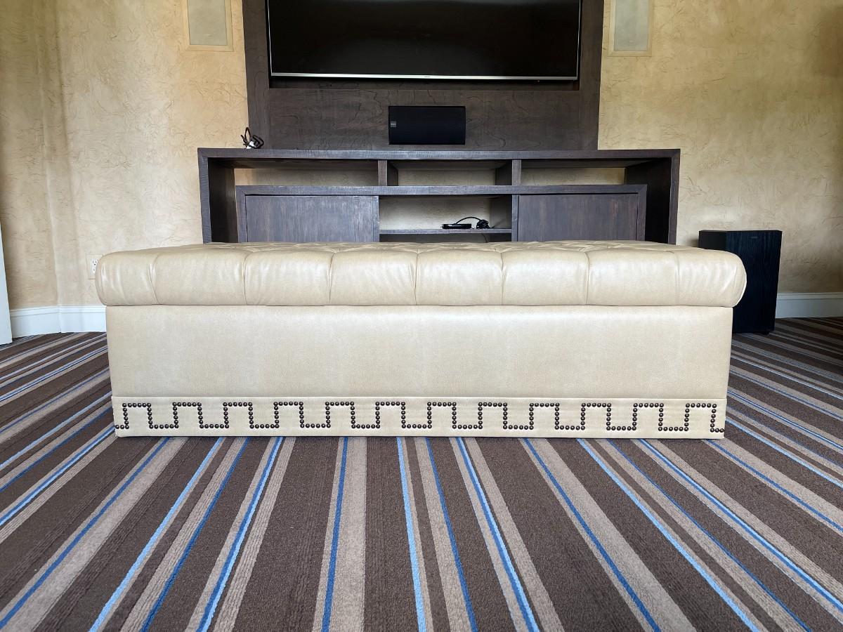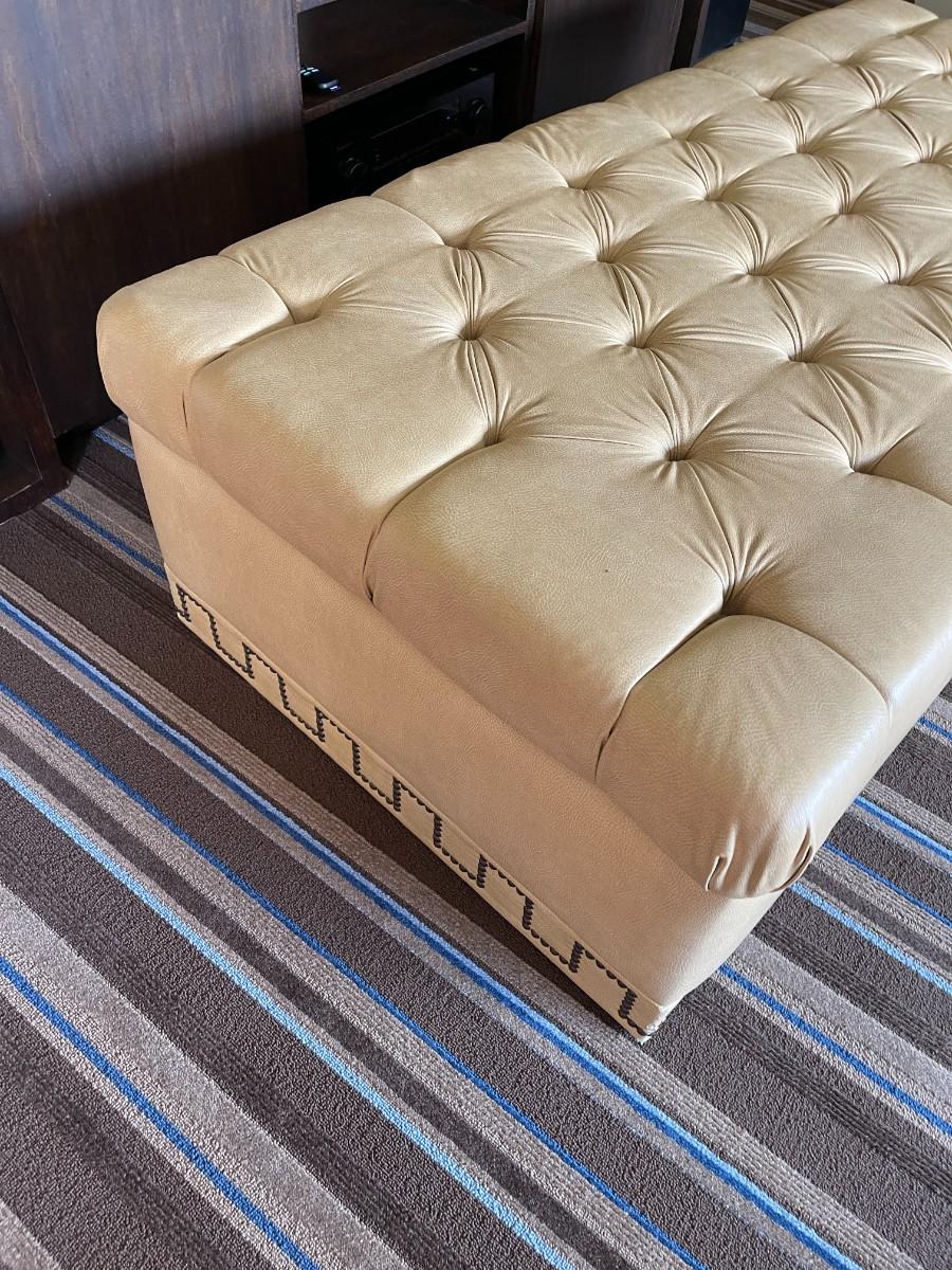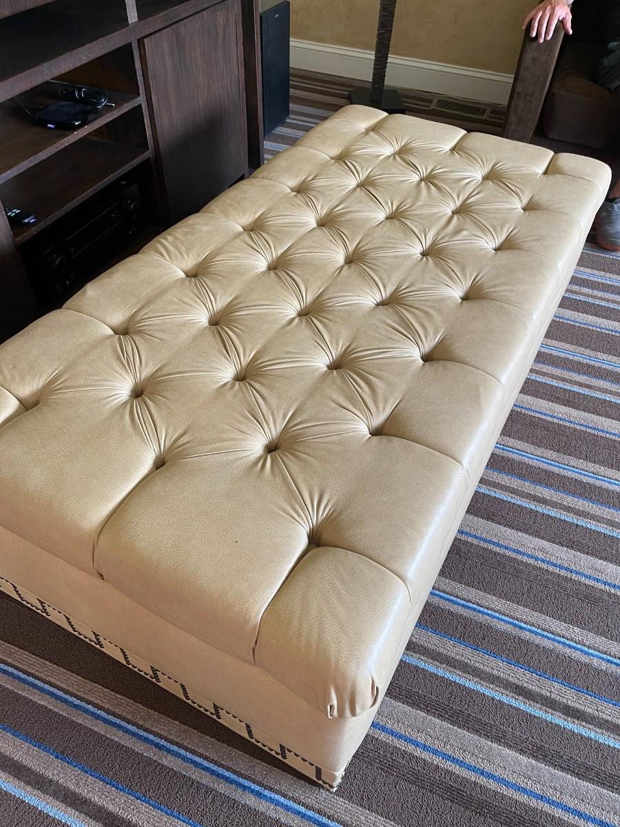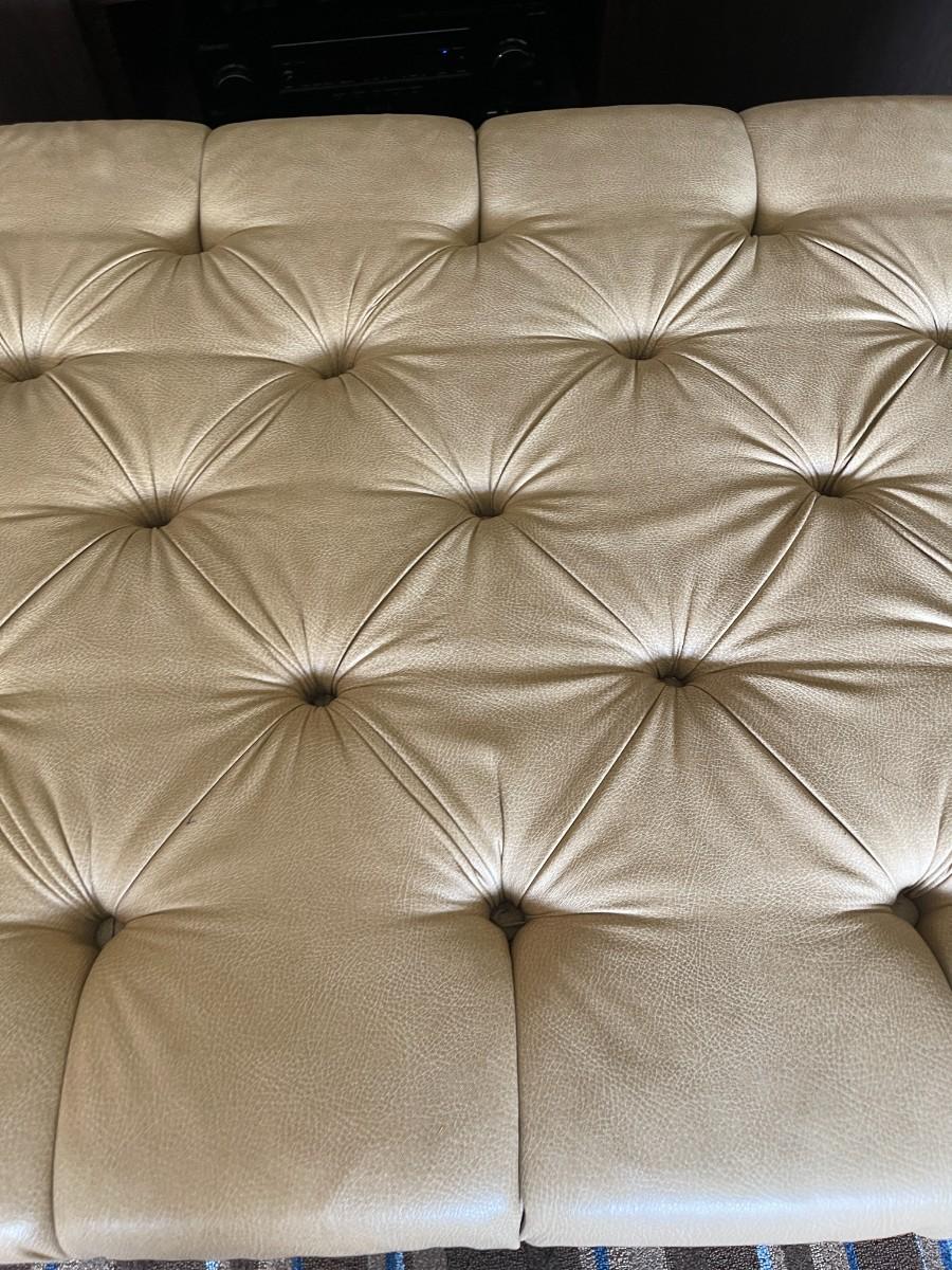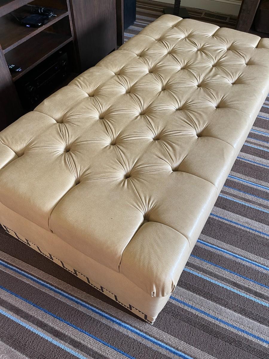 Bernhardt leather button tufted ottoman with nail head trim. Good condition. Missing a couple of nail heads and shows some scuff marks on the bottom, especially the corners. 61" x 30" x 19". Comes from a smoke free estate.