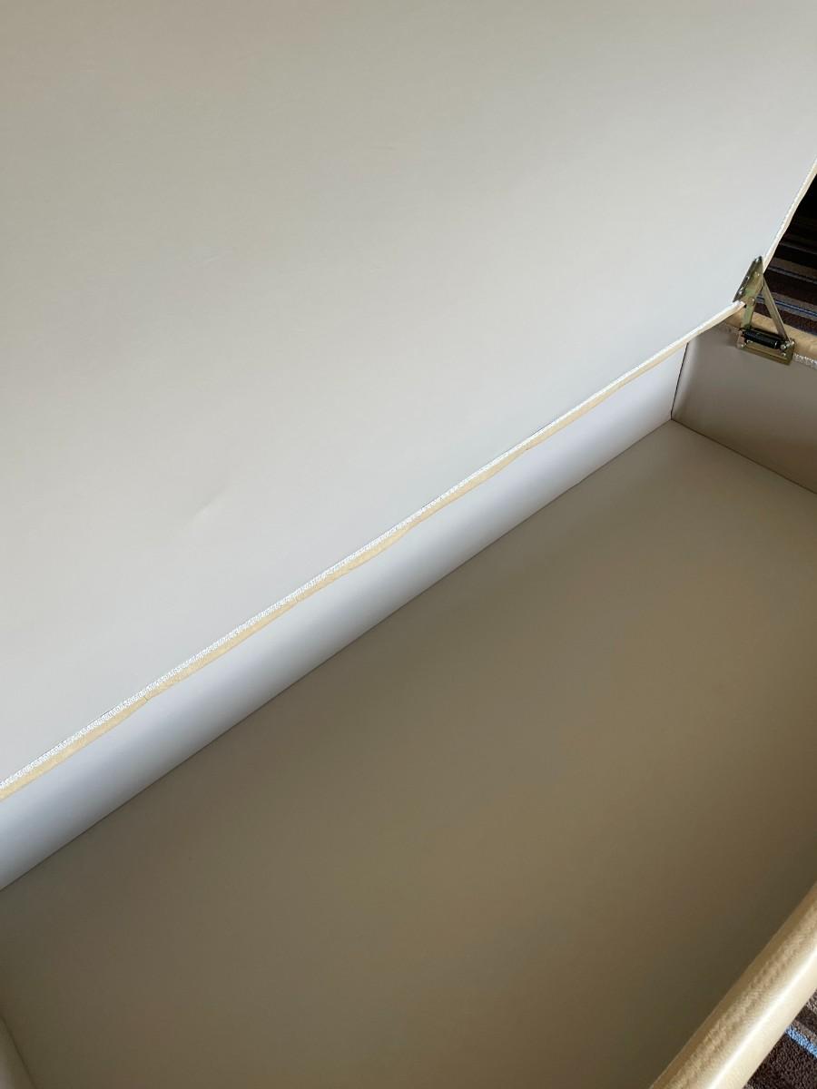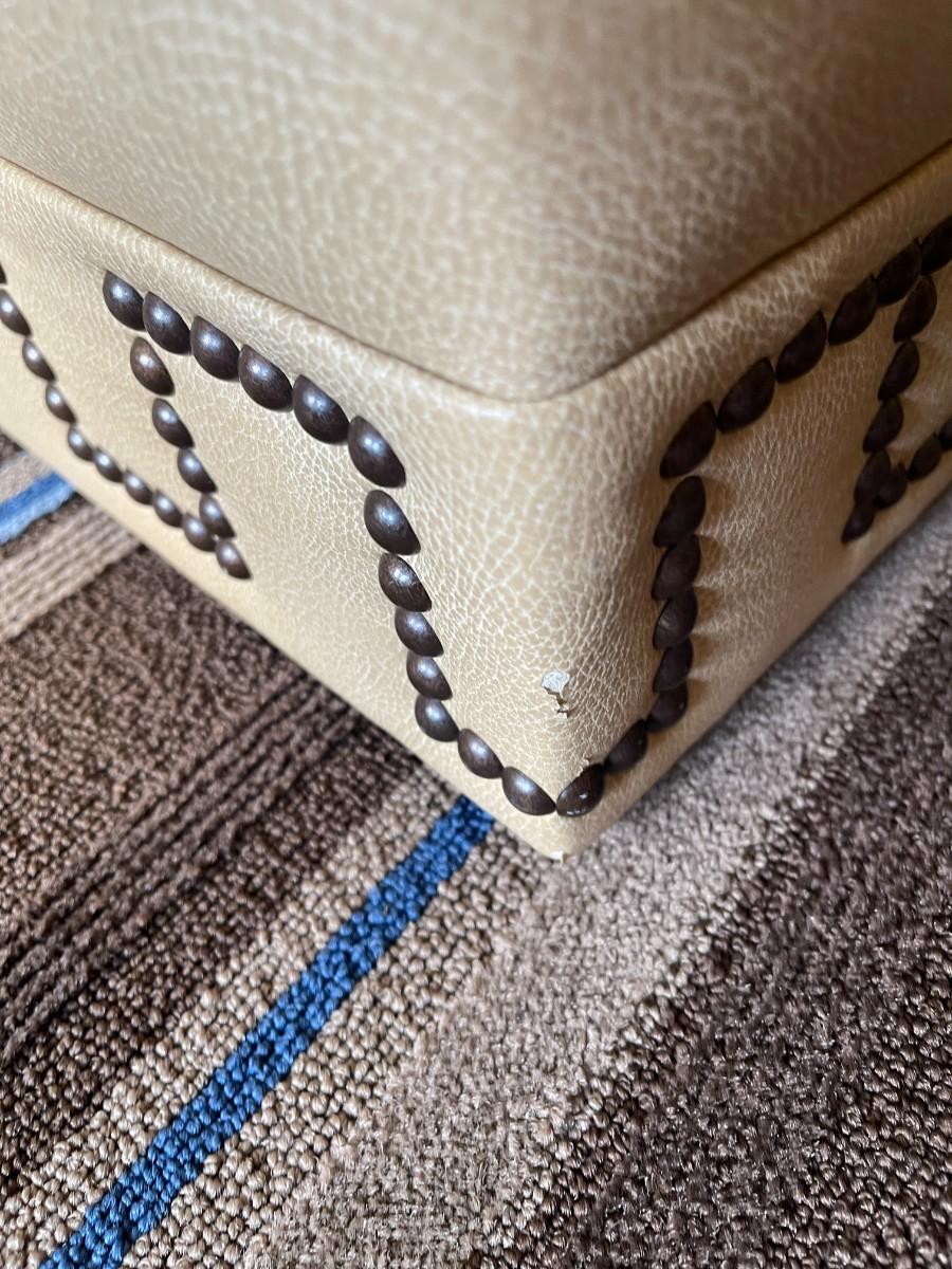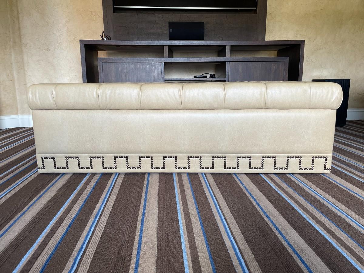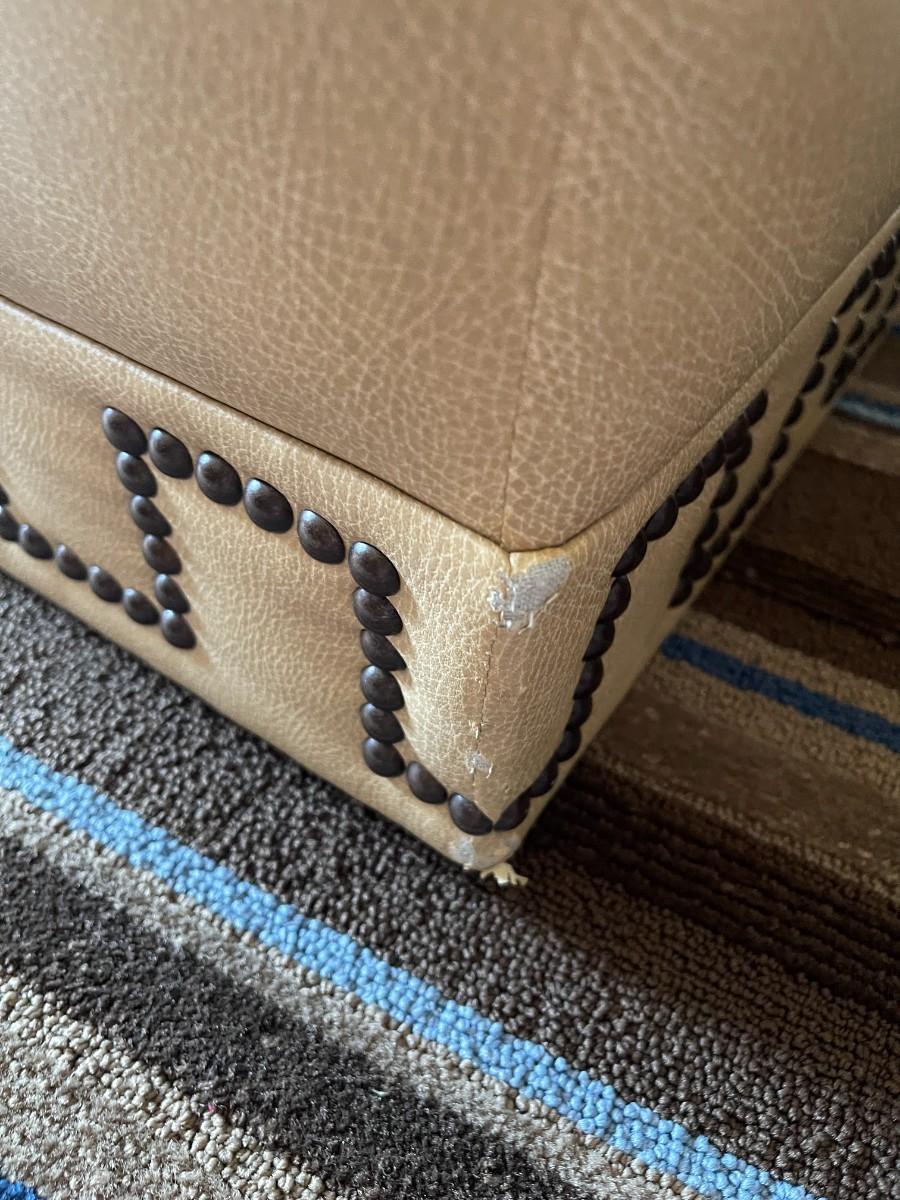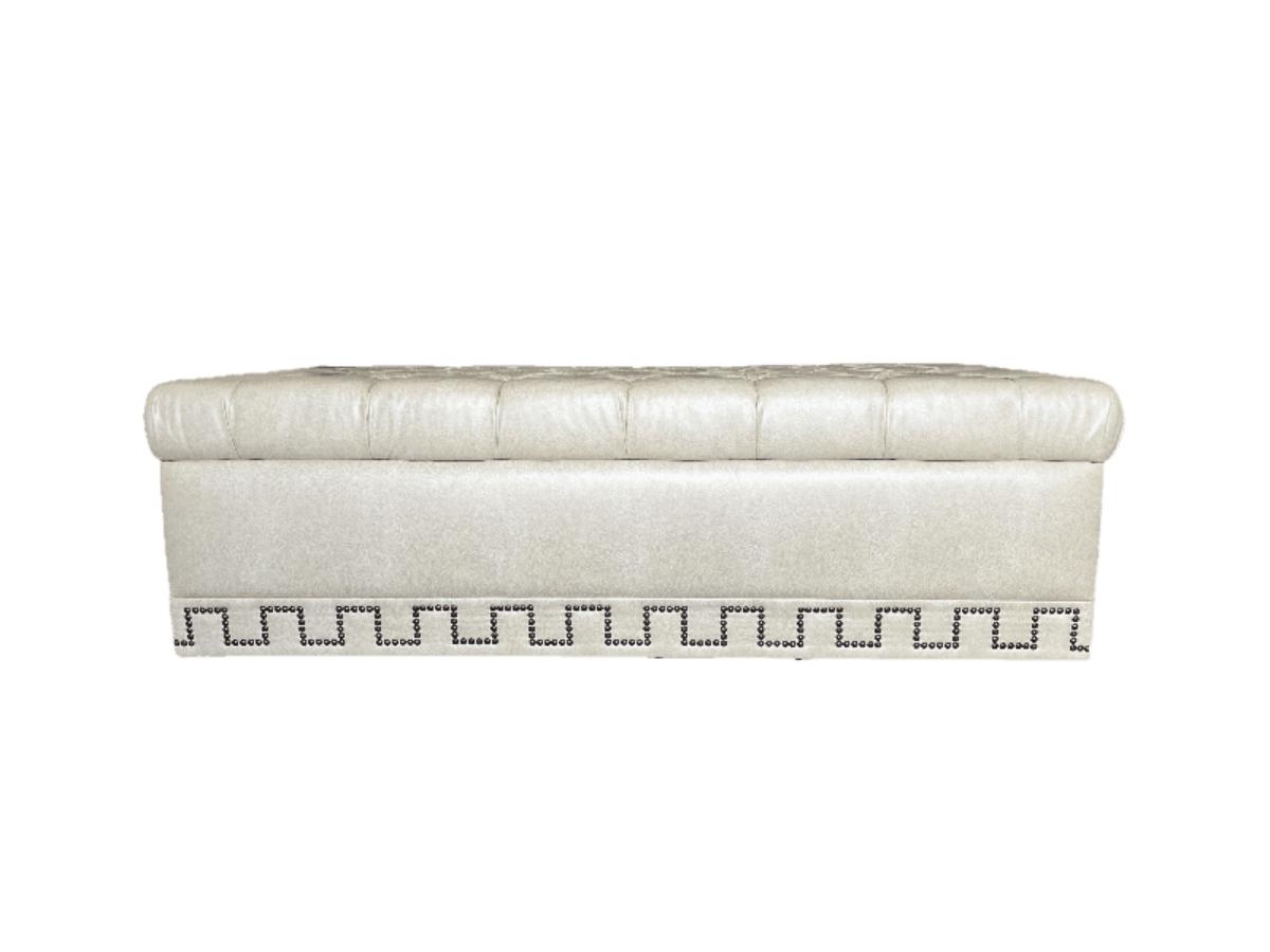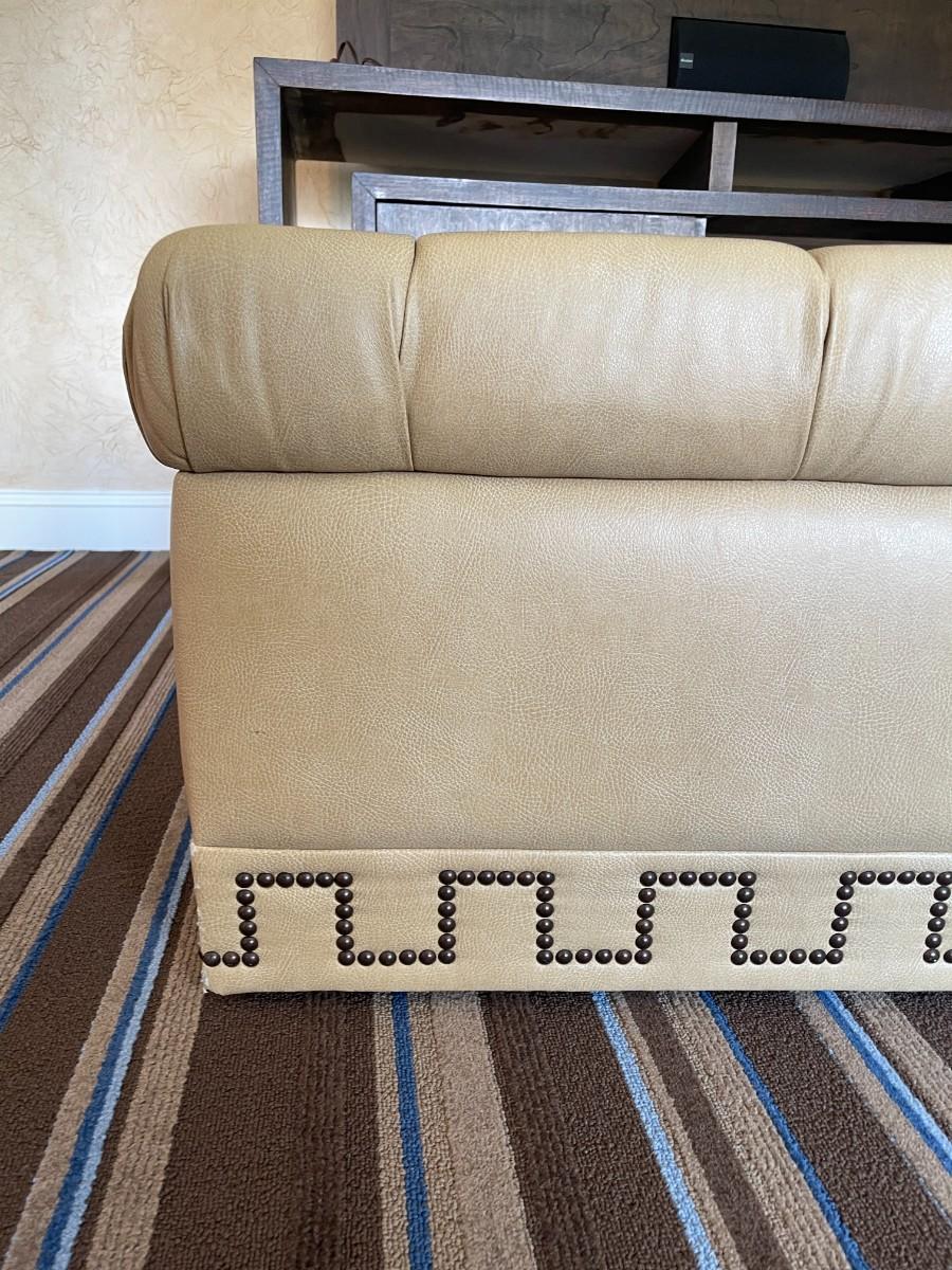 Bernhardt leather button tufted ottoman with nail head trim. Good condition. Missing a couple of nail heads and shows some scuff marks on the bottom, especially the corners. 61" x 30" x 19". Comes from a smoke free estate.