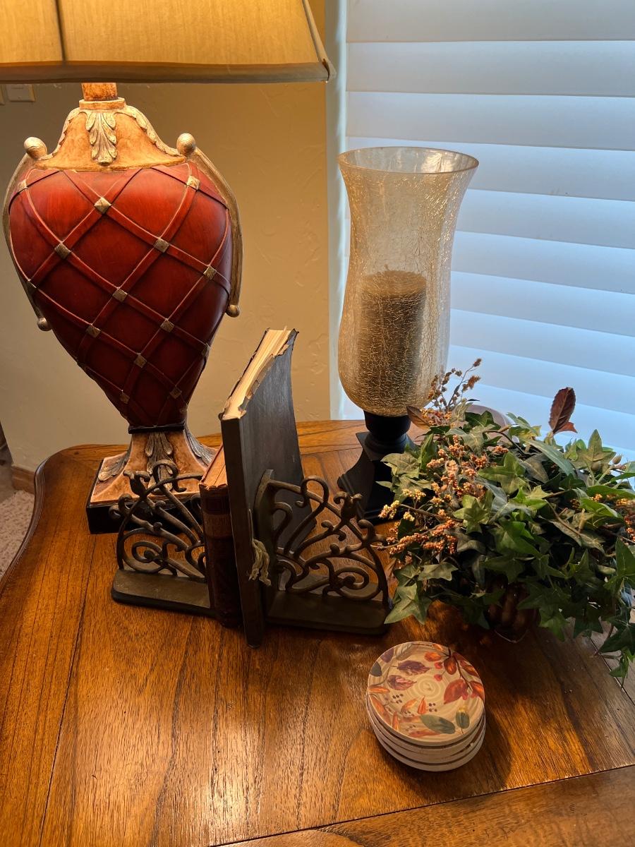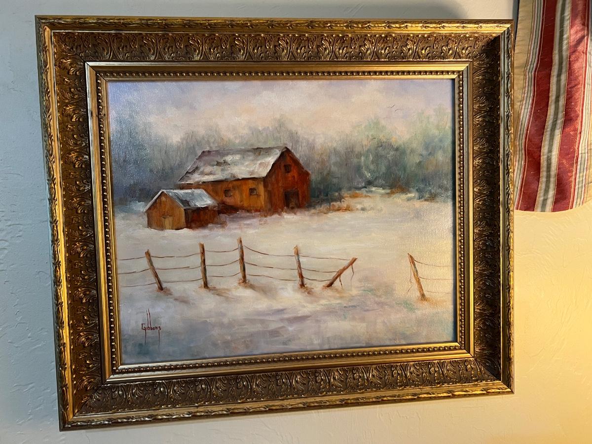 Bernhardt Leather chair, Side Table, Lamp, Original Painting, Lamp and Decor as pictured