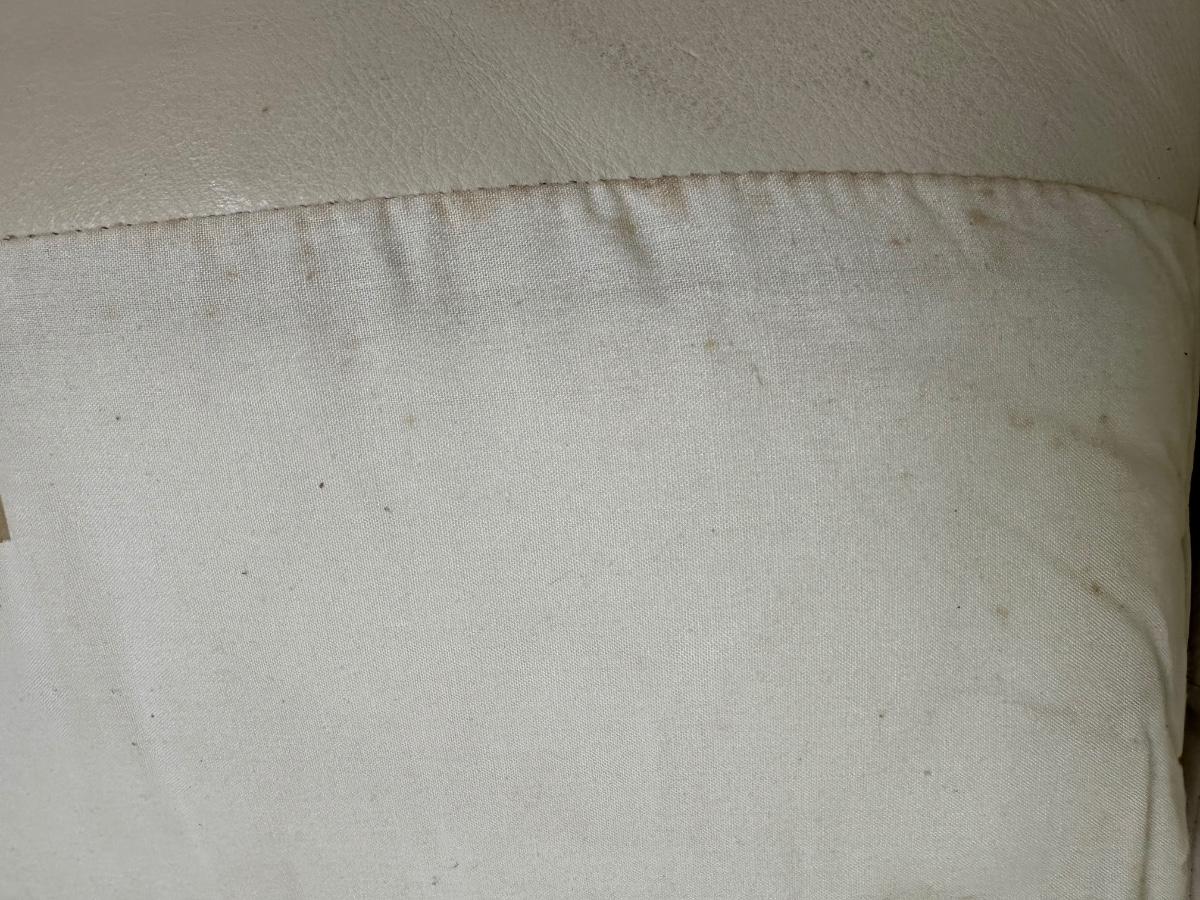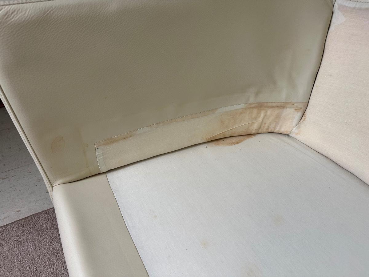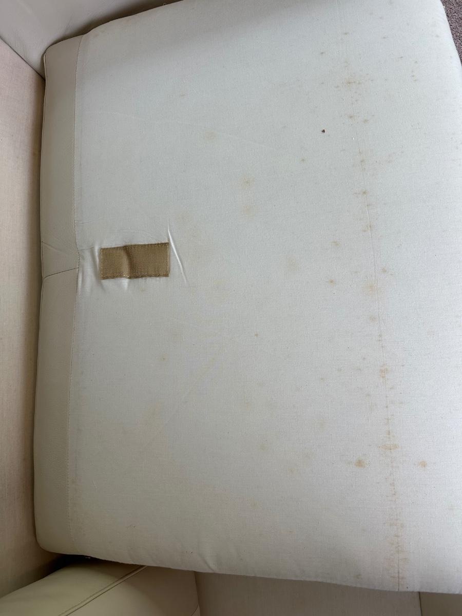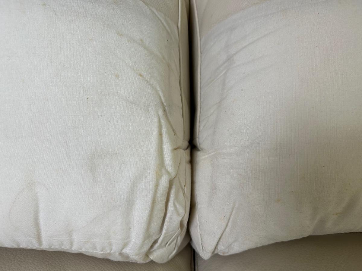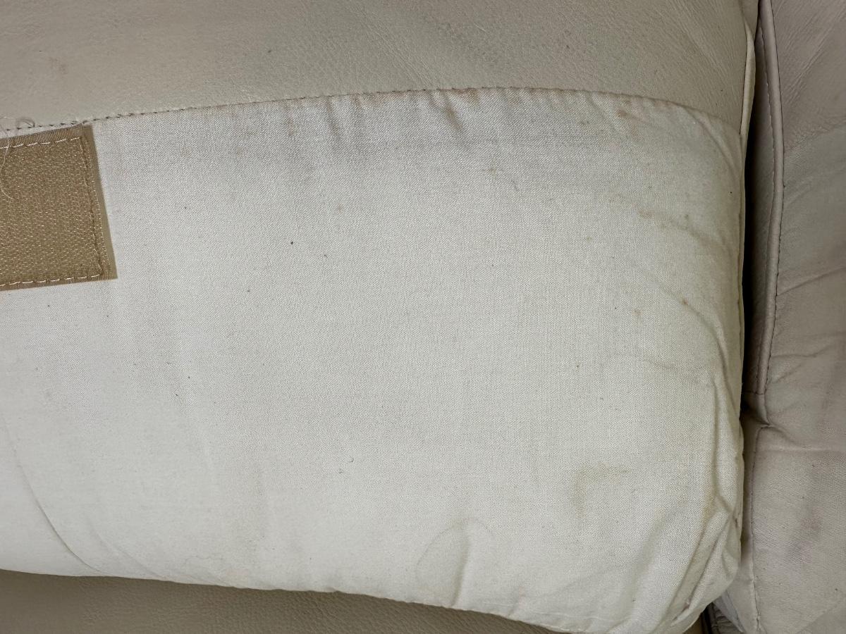Matching leather chair in auction. Located on the first floor. Kept in “basement” - light use. The material under the cushions does have stains, see pictures.
