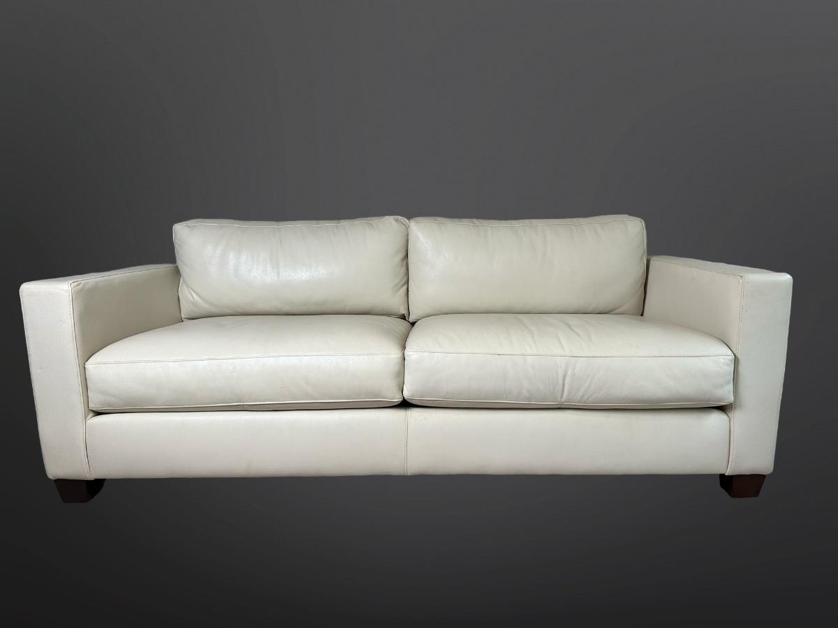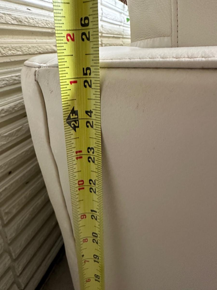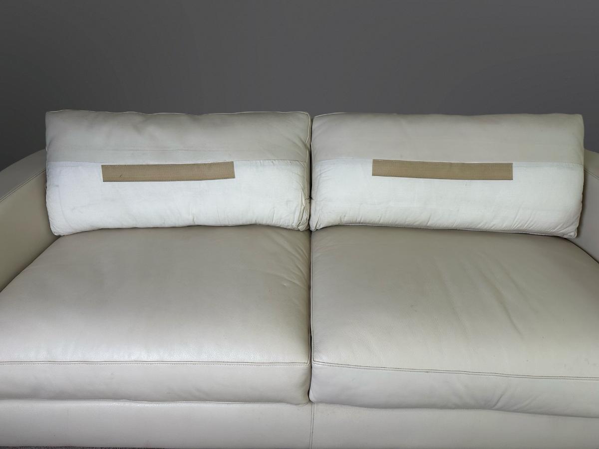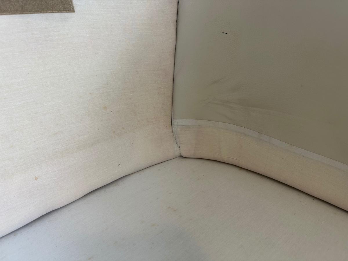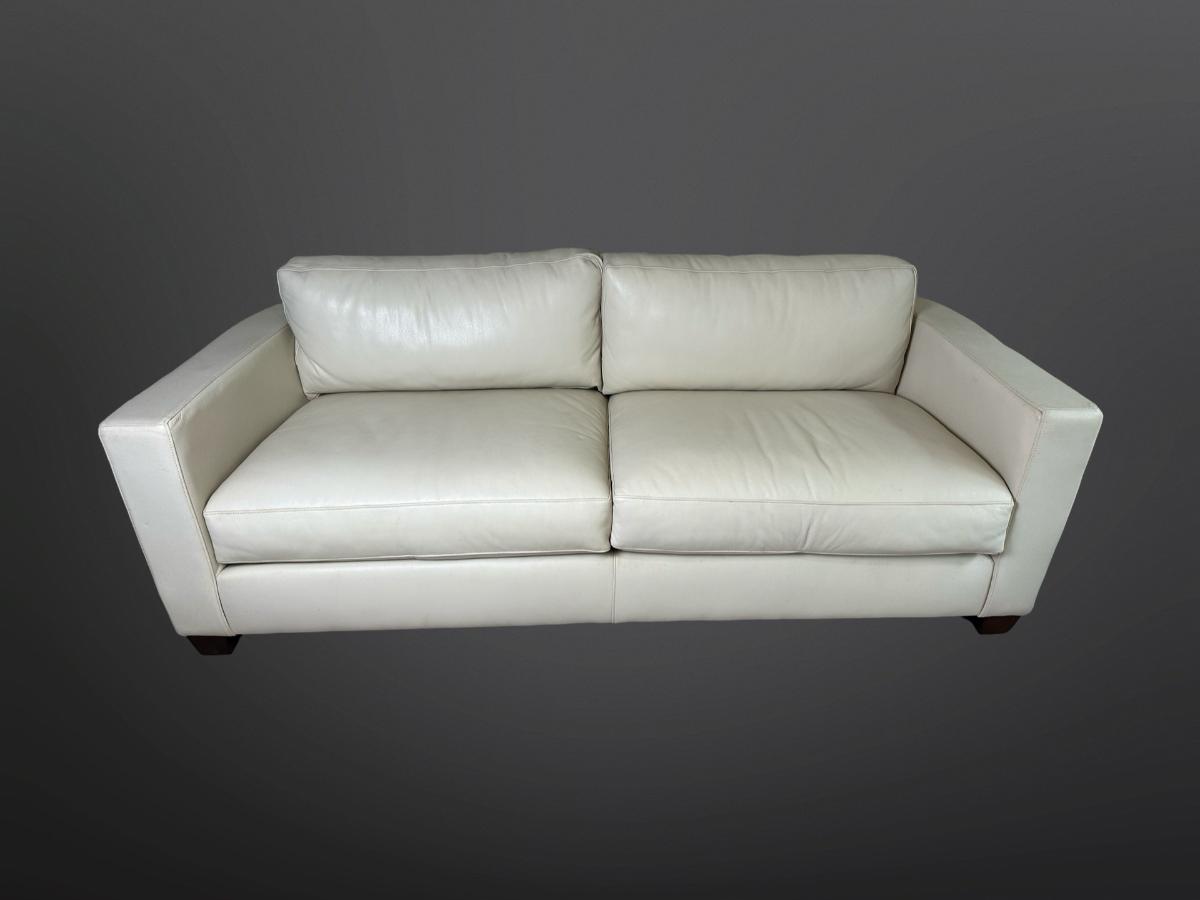 Matching leather chair in auction. Located on the first floor. Kept in “basement” - light use. The material under the cushions does have stains, see pictures.