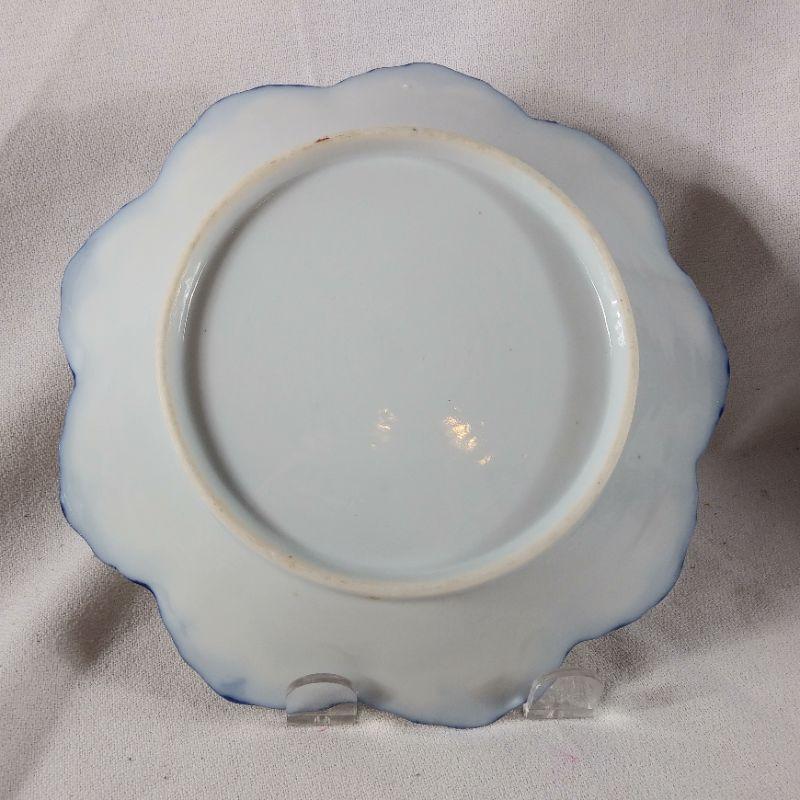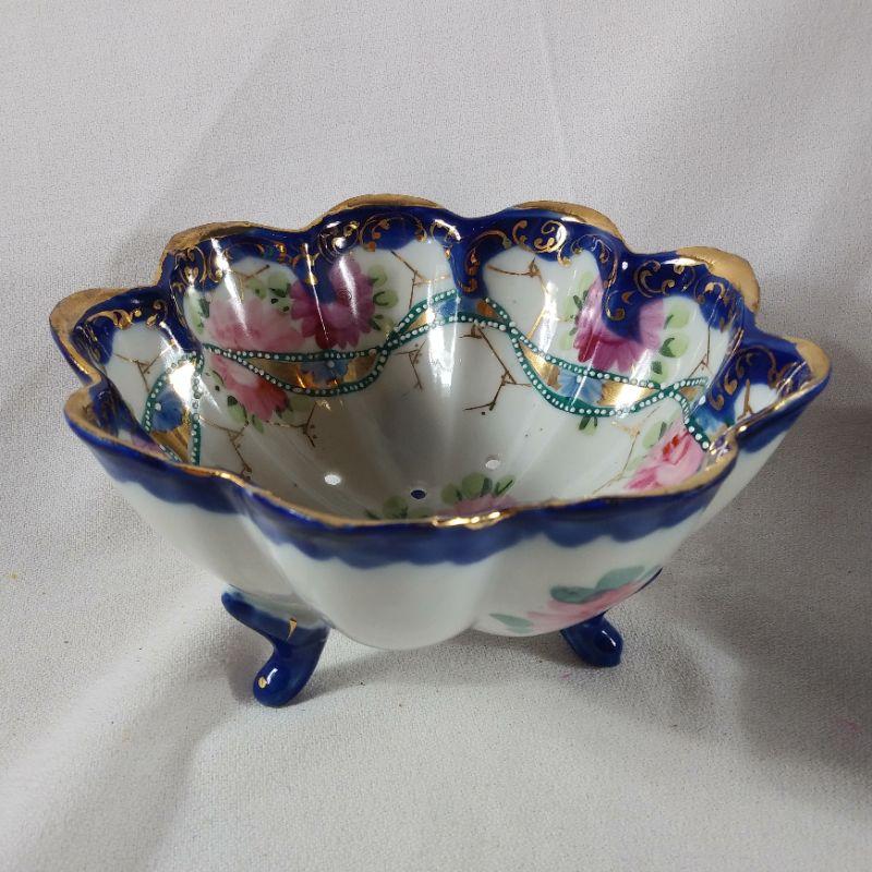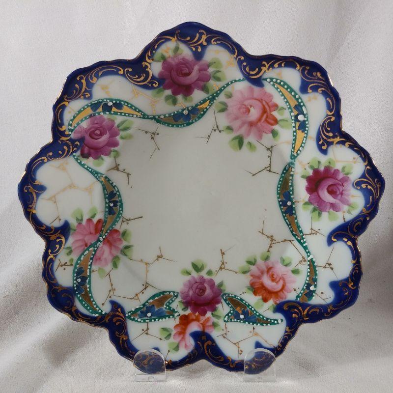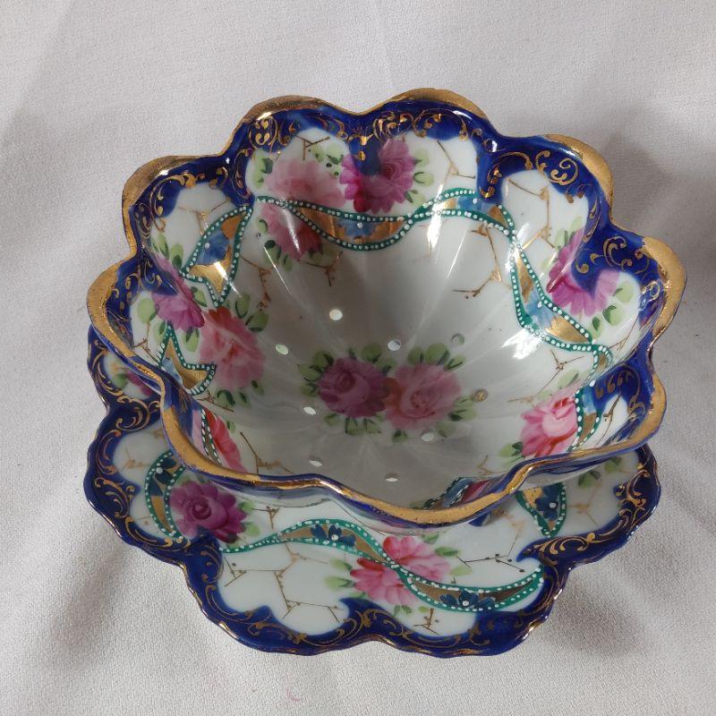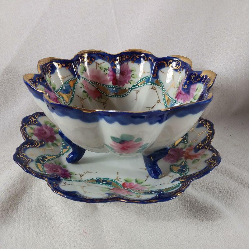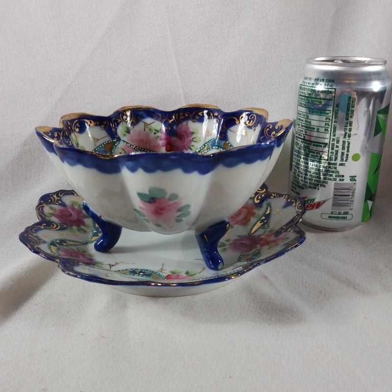 Beautiful hand-painted Berry Bowl with Under Plate. Has a little "Flow Blue" feel to it. No markings.