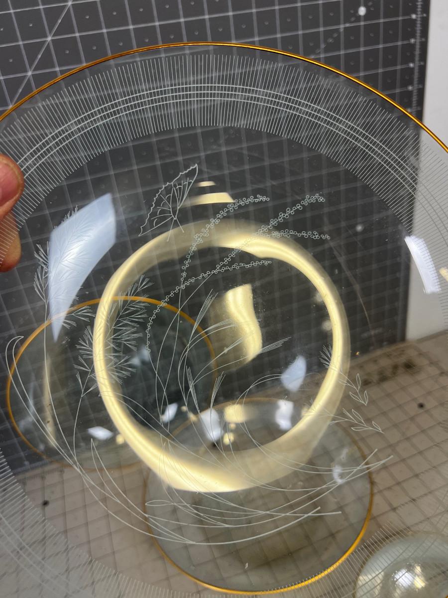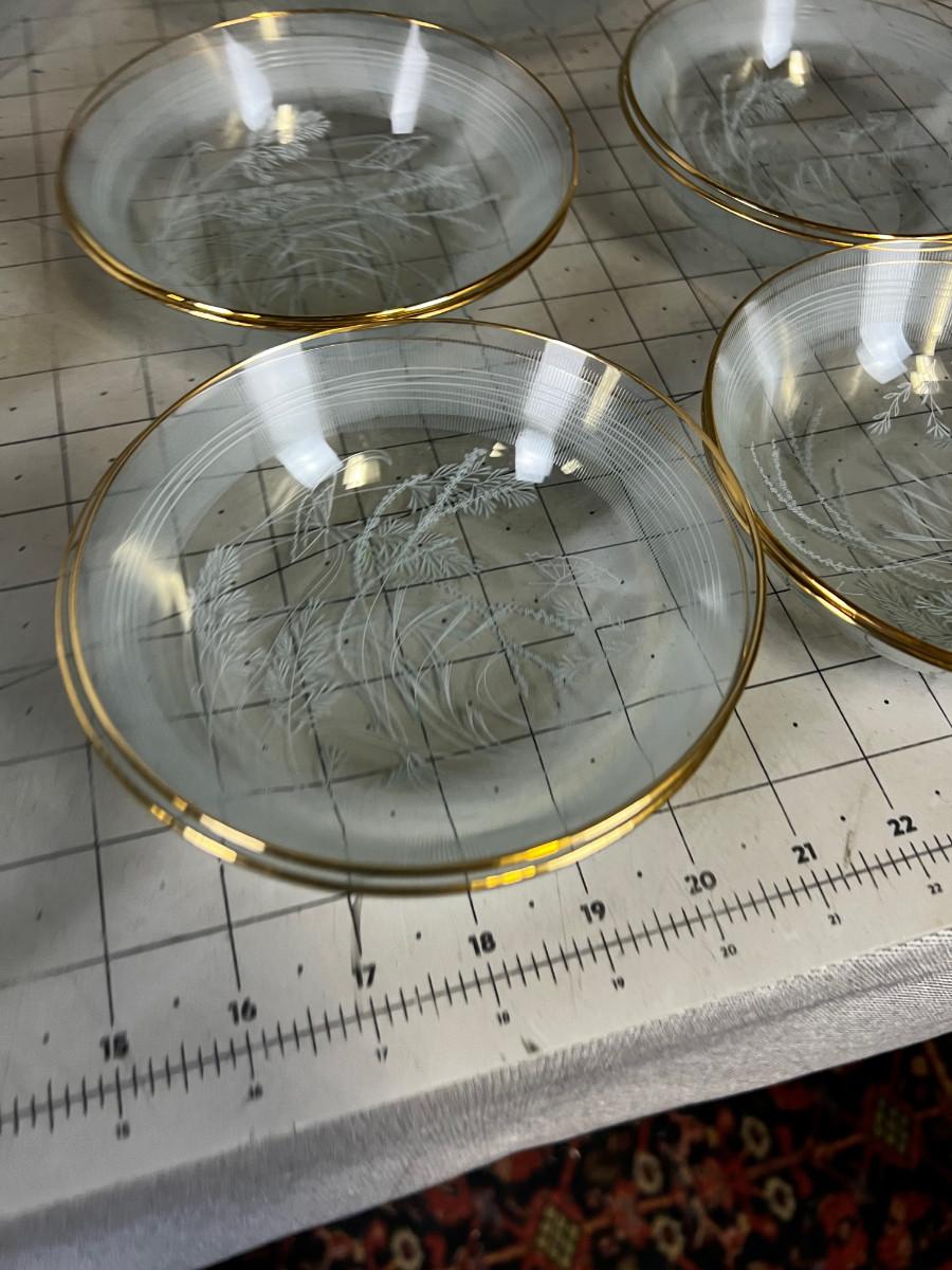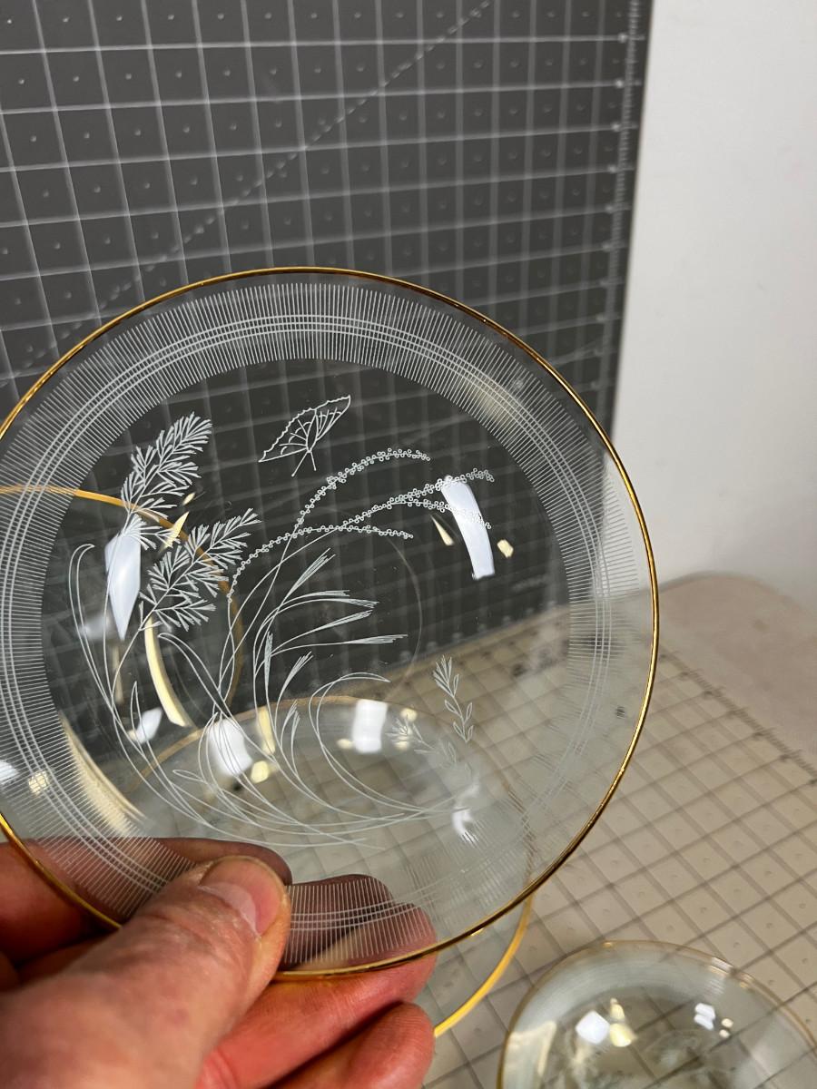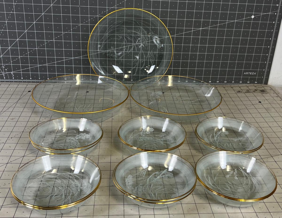 3 Serving Bowls and 10 Berry Bowls Etched with Grass and Butterflies. PRETTY! Gold Rimmed