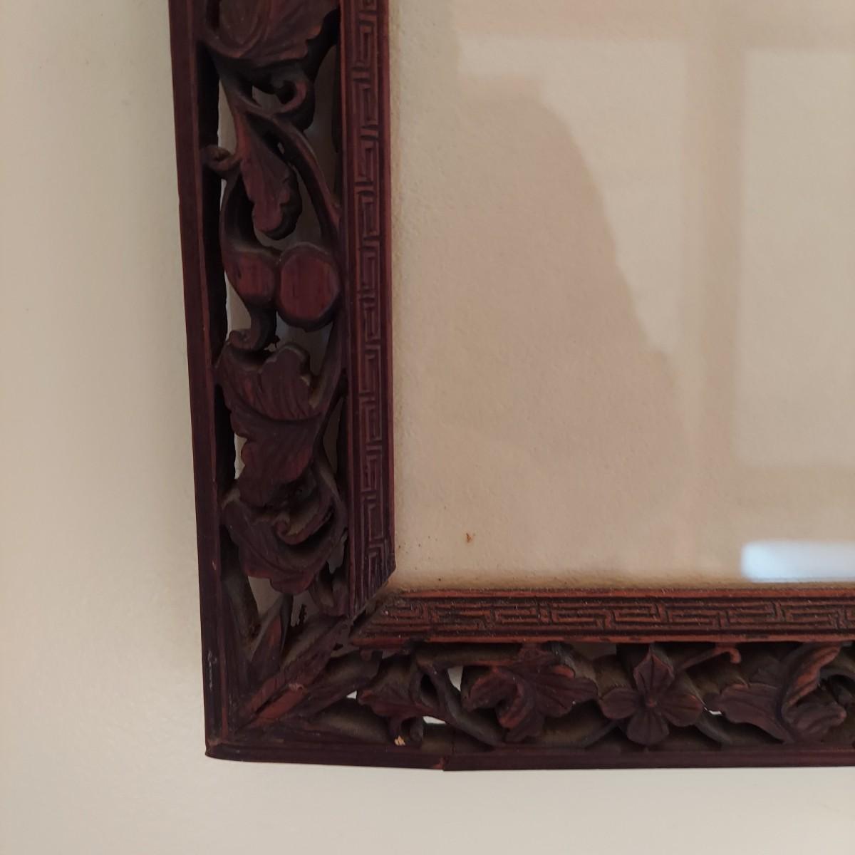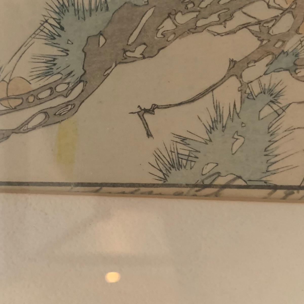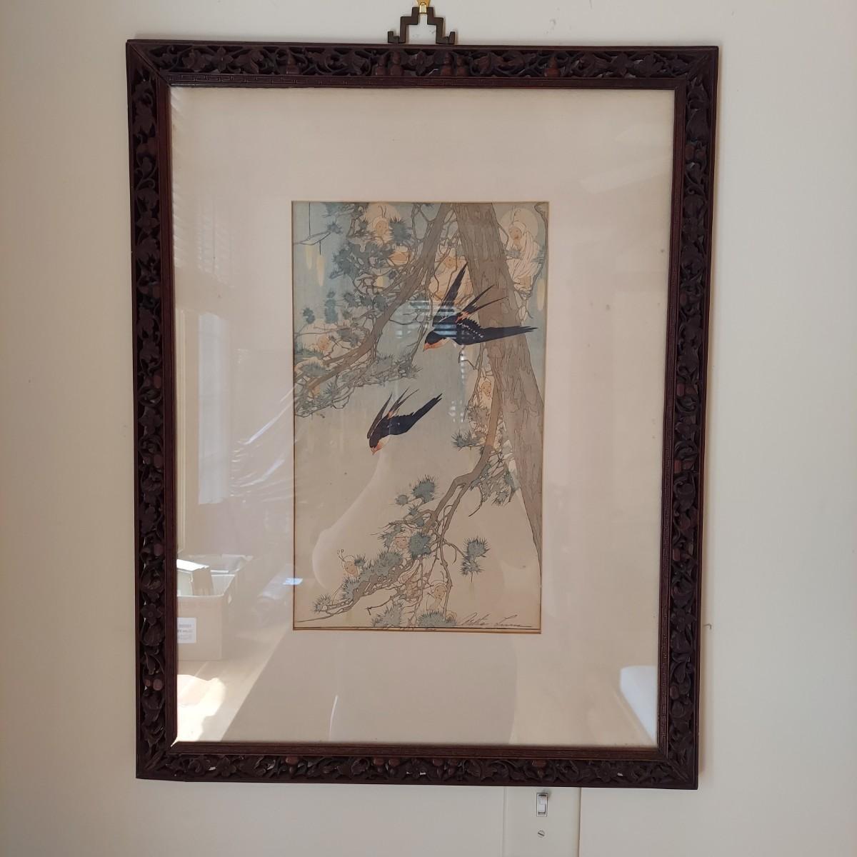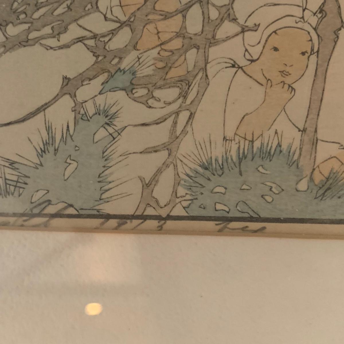 This appears to be a block print of Bertha Lum's 'Window on Distant and Hidden Things'. It is pencil signed and has other wording written in pencil that is mostly hidden under the mat. Art is framed and matted under glass. Wooden frame has delicate carved details with an East Asian style decorative metal hanger. Measures approximately 22” x 25"H. It appears to be separating at the corners on one side. Please see photos for details. Shipping available. Shipping certain items can be costly. We suggest contacting our preferred local shipping provider, Postage Express, with dimensions and getting an estimate before bidding: (828) 255-9250 or shipping@postageexpressnc.com