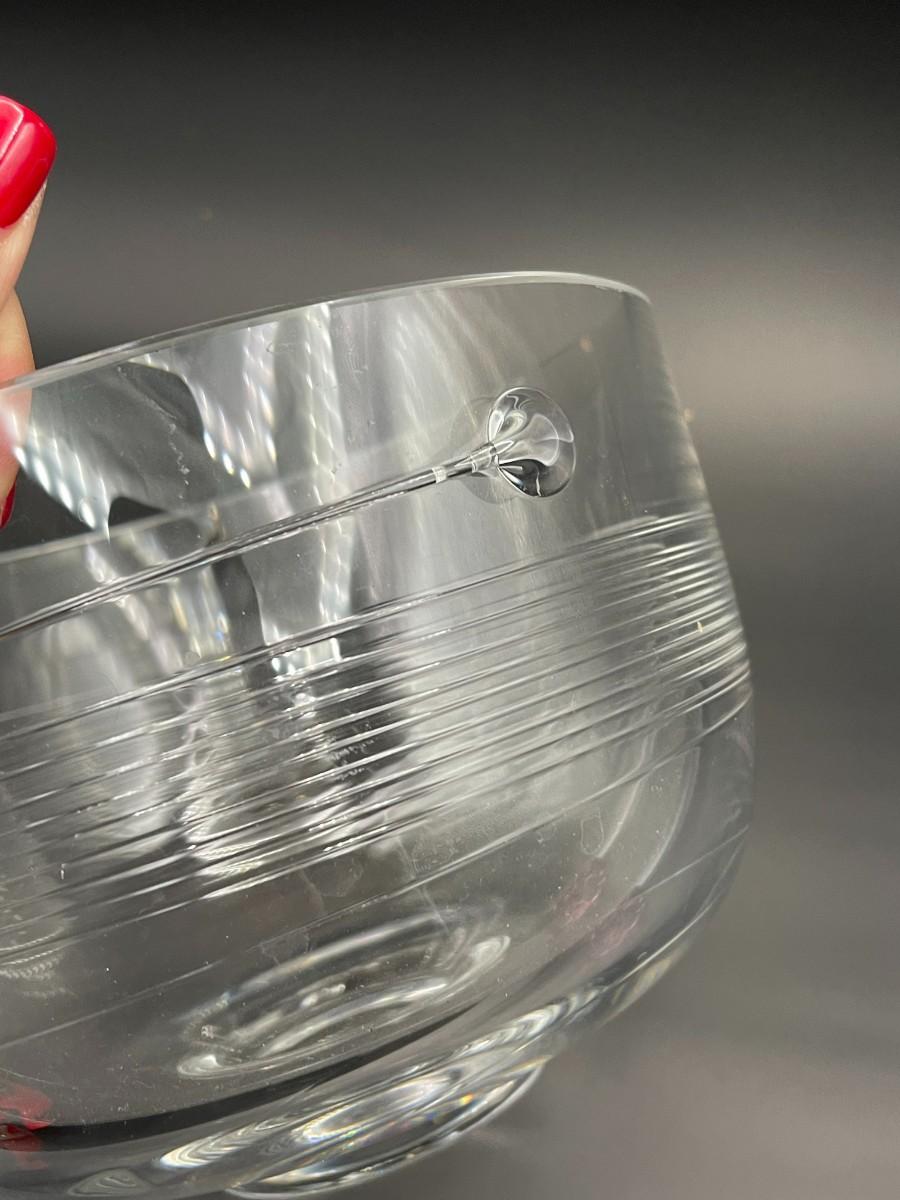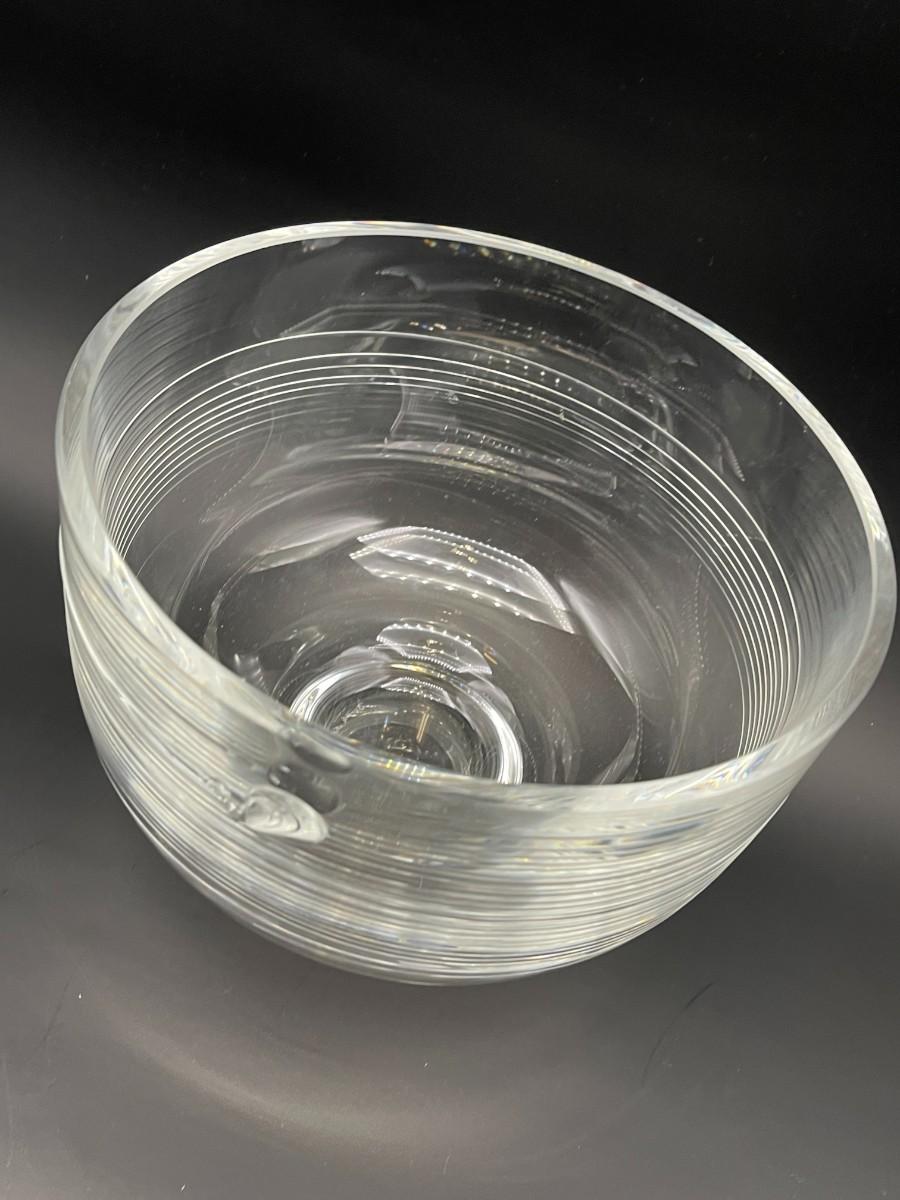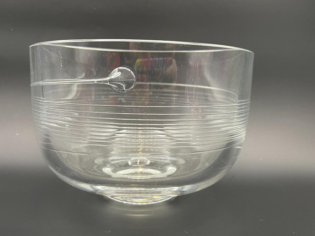 Kosta Boda employs artists in their own right at their glassworks. Bertil Vallien, born 1938, is one such living artist who has crafted work for the esteemed design house. This bowl recalls art deco design and was most likely blown by hand in the 1980s when the style became en vogue again. Approx.: 7.5" W x 5" H # 795