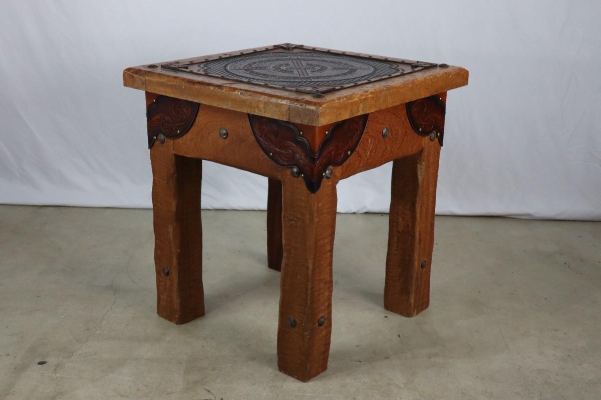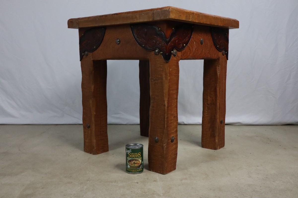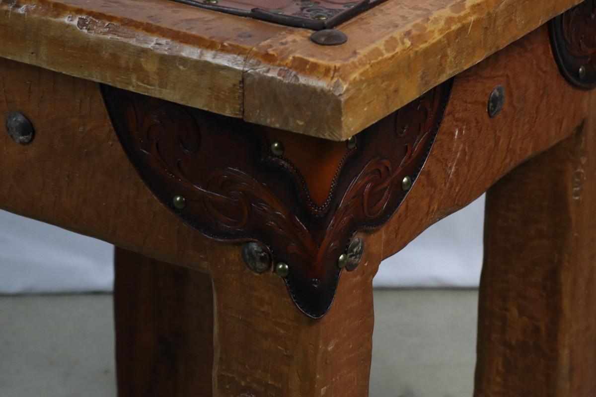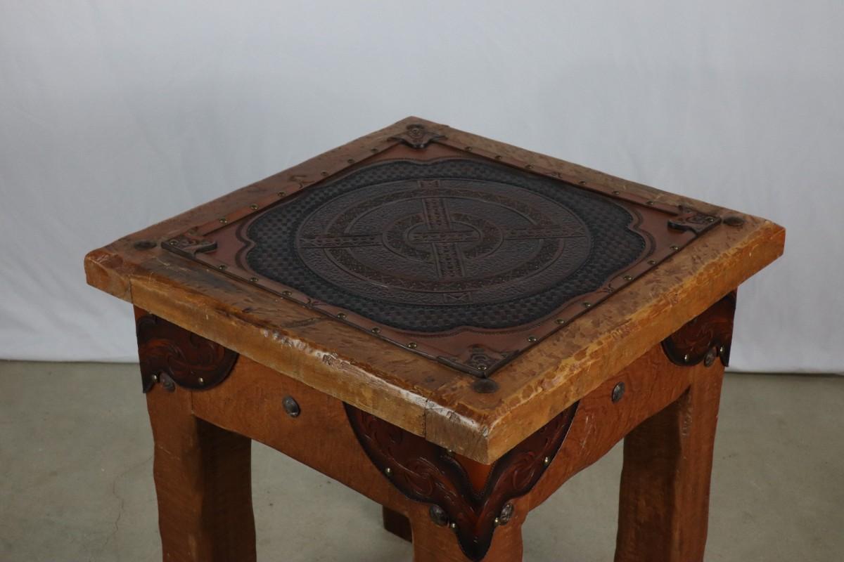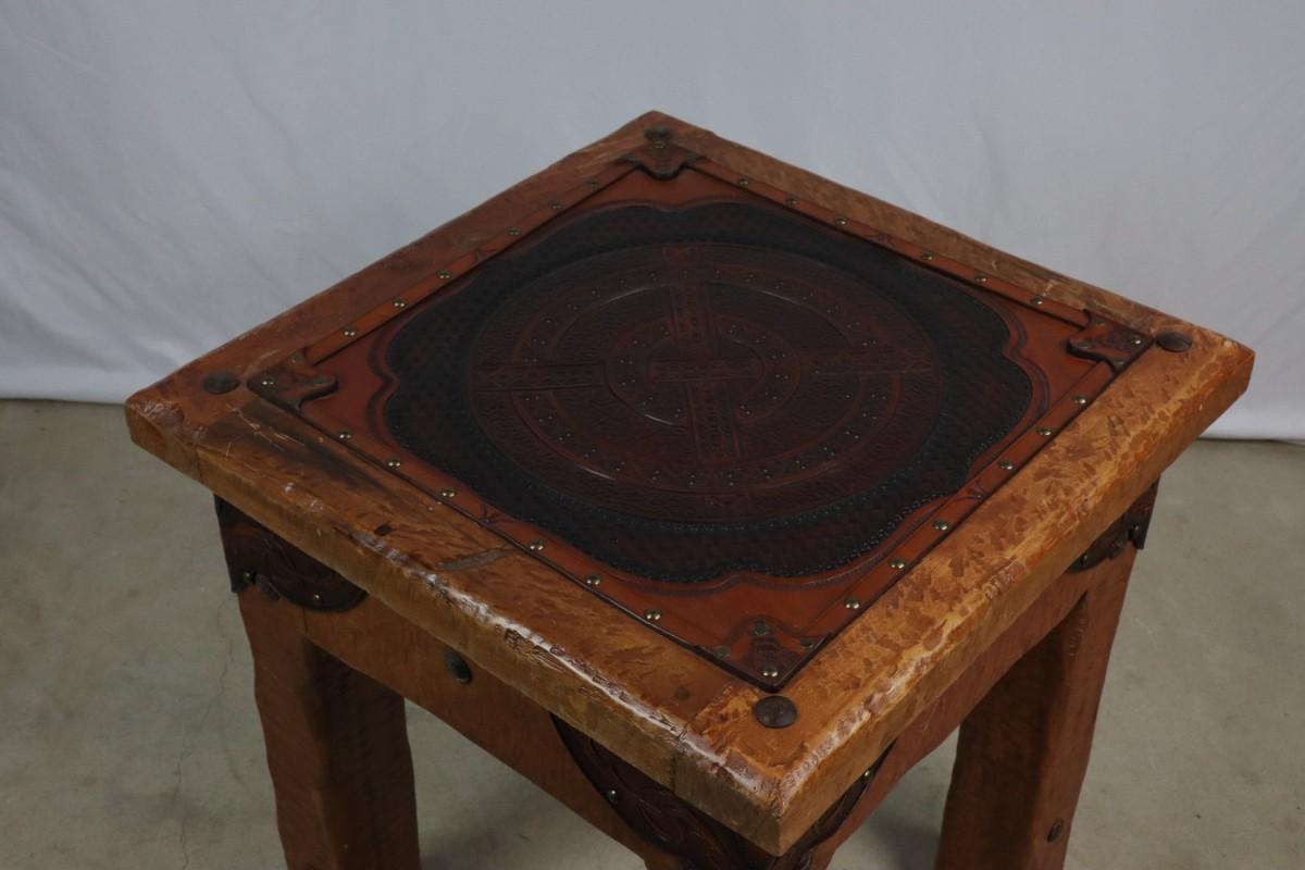 Bespoke One of a Kind Hand Tooled Leather Top Table, measures approximately 26-1/4" Tall, Top measures 24" x 24".