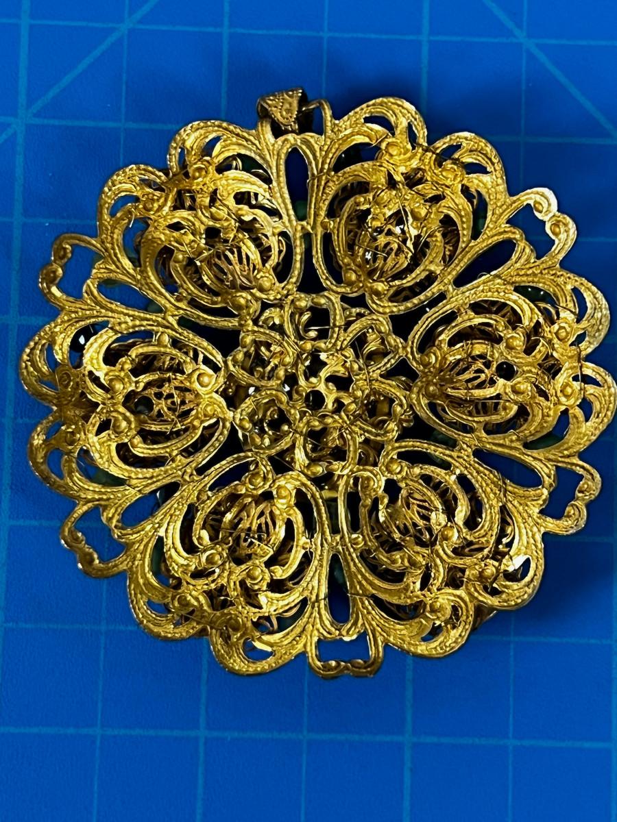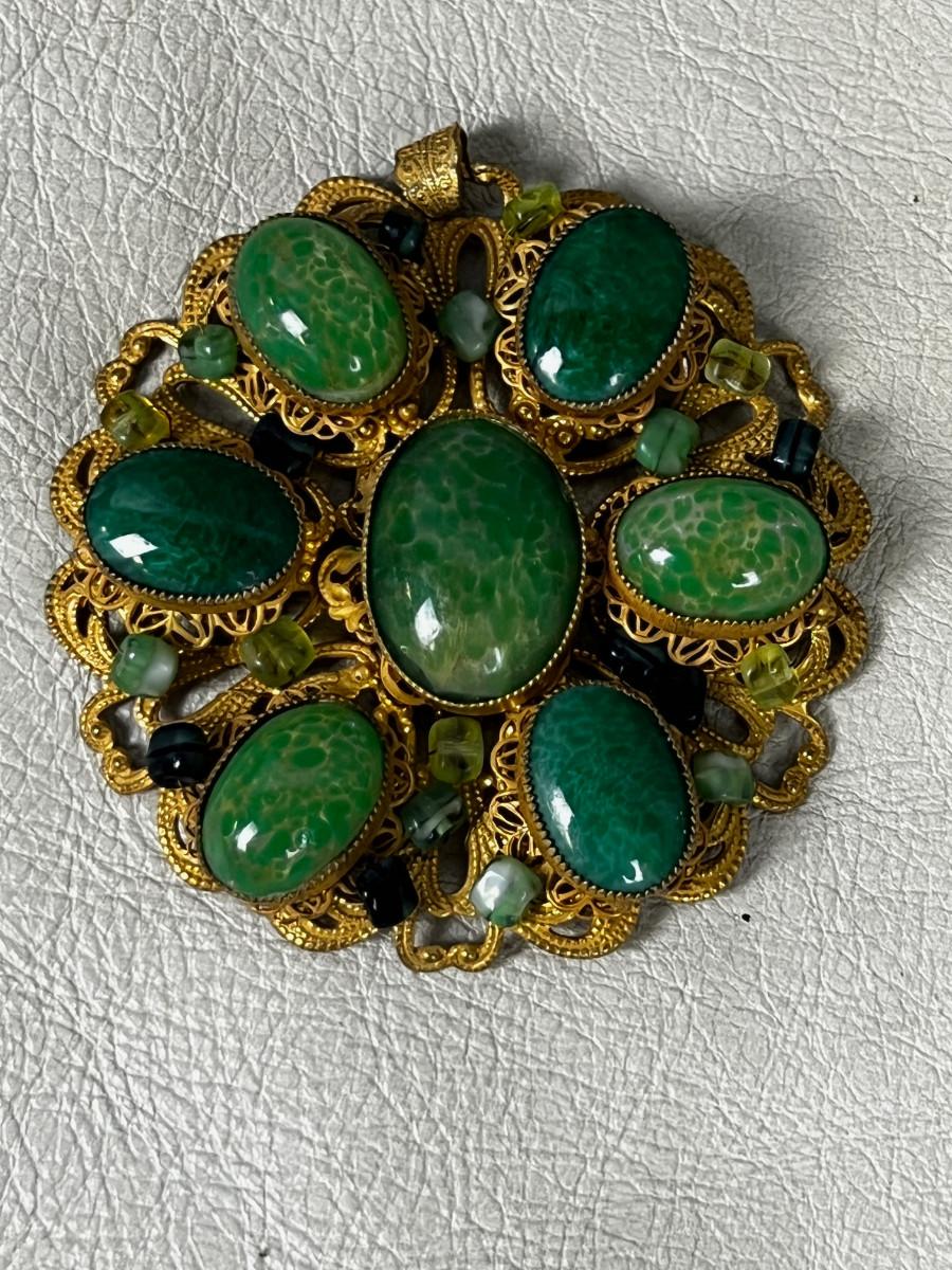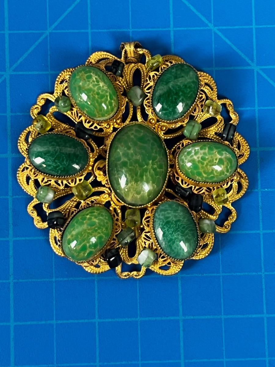 BEST OF SHOW!!! Brass POSSIBLE AN UNSIGNED HASKELL Filigree Pendant with Several Large Green Stones and Beads