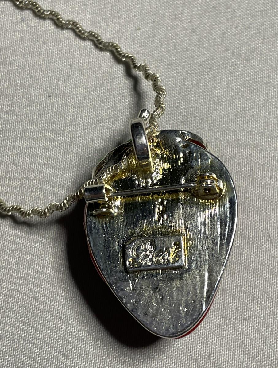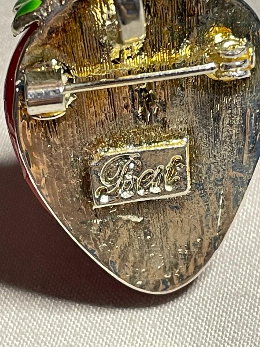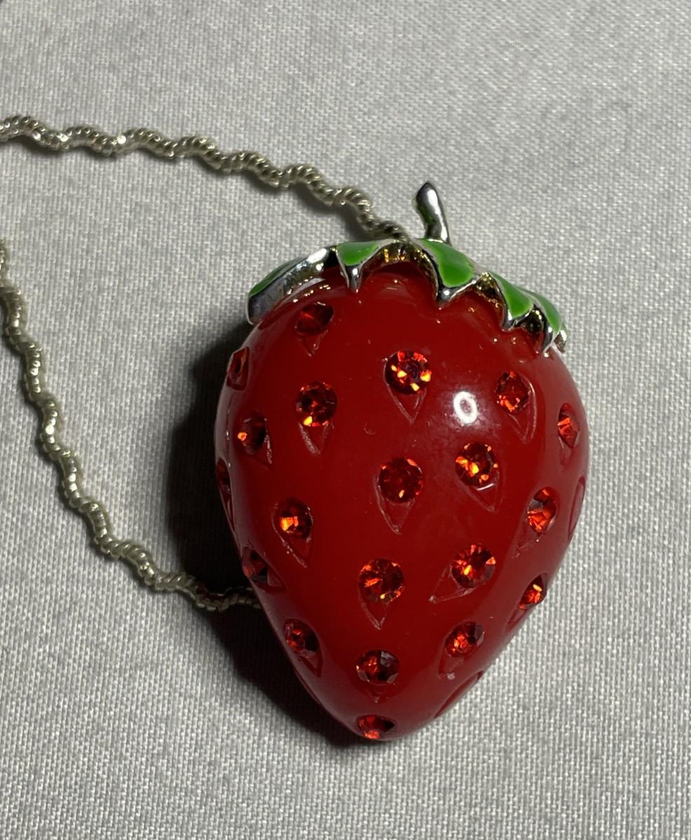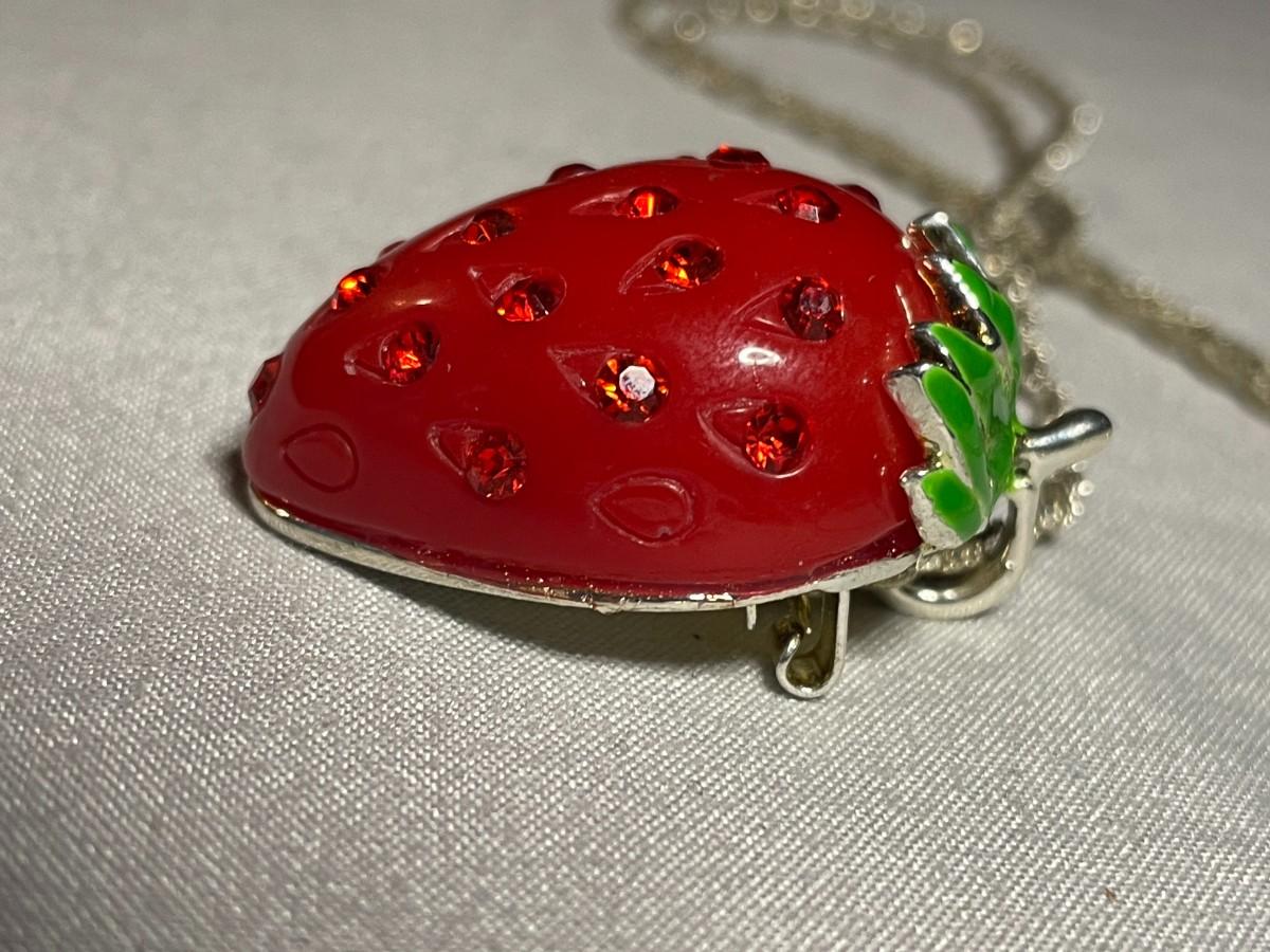 This strawberry is marked Best on the back and can be worn as a pendant or a brooch. It is about 1.3 inches long and 1 inch wide. The chain that it is on is a silver colored metal and about 24 inches long.\
