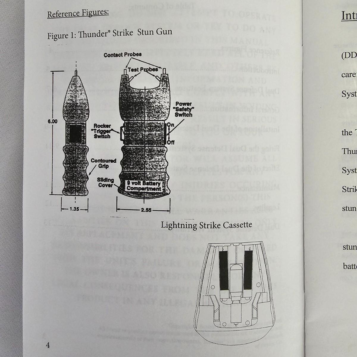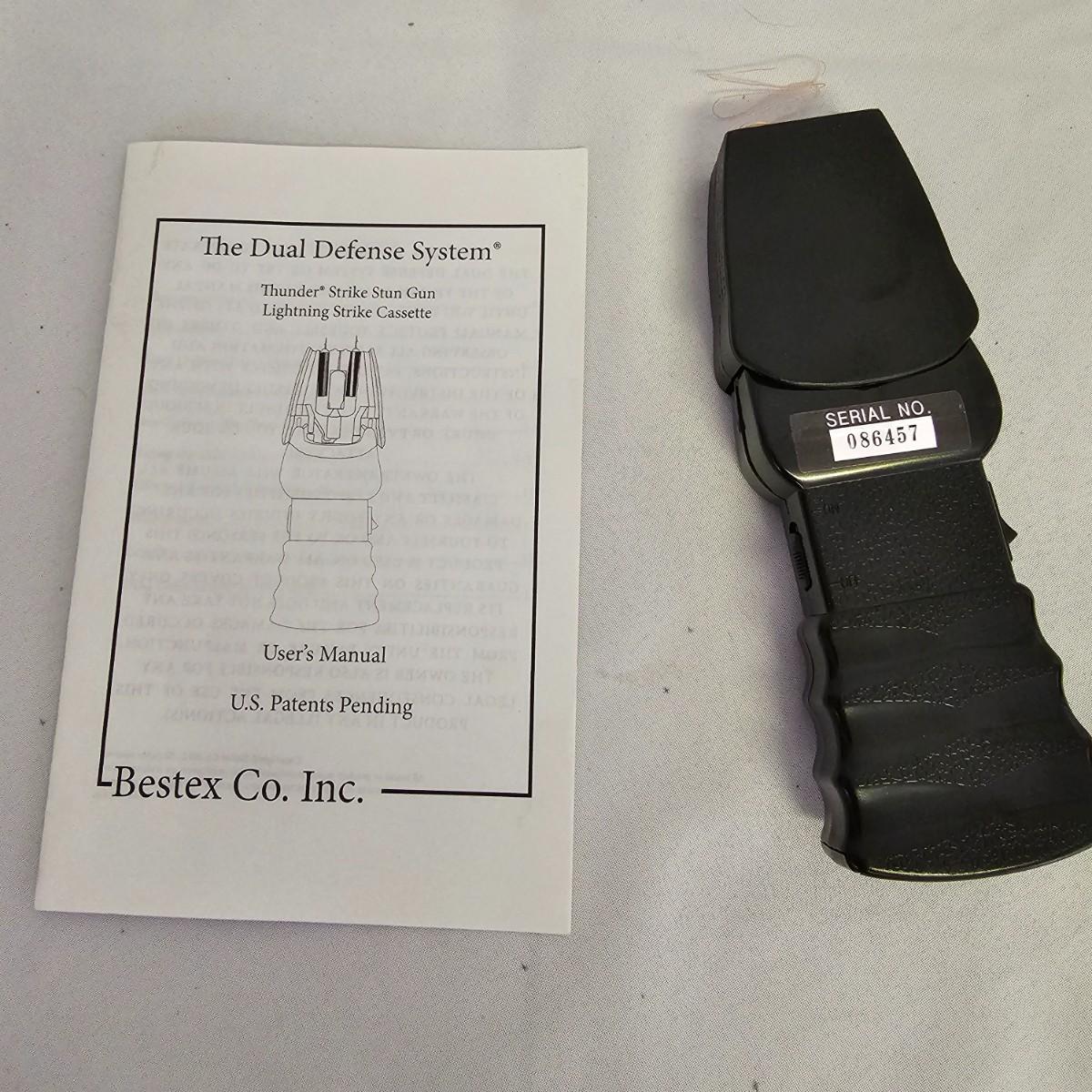 Bestex Thunder Strike stun gun has dual defense system, can also utilize a cassette which launches two probes. Powered by a 9 volt battery, item is untested, comes with instruction manual. See photos for details. Local pickup only. All sales are final. No returns or refunds. Please bid accordingly.