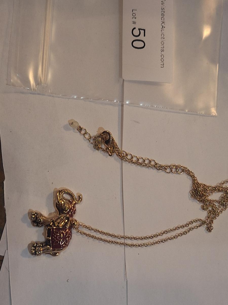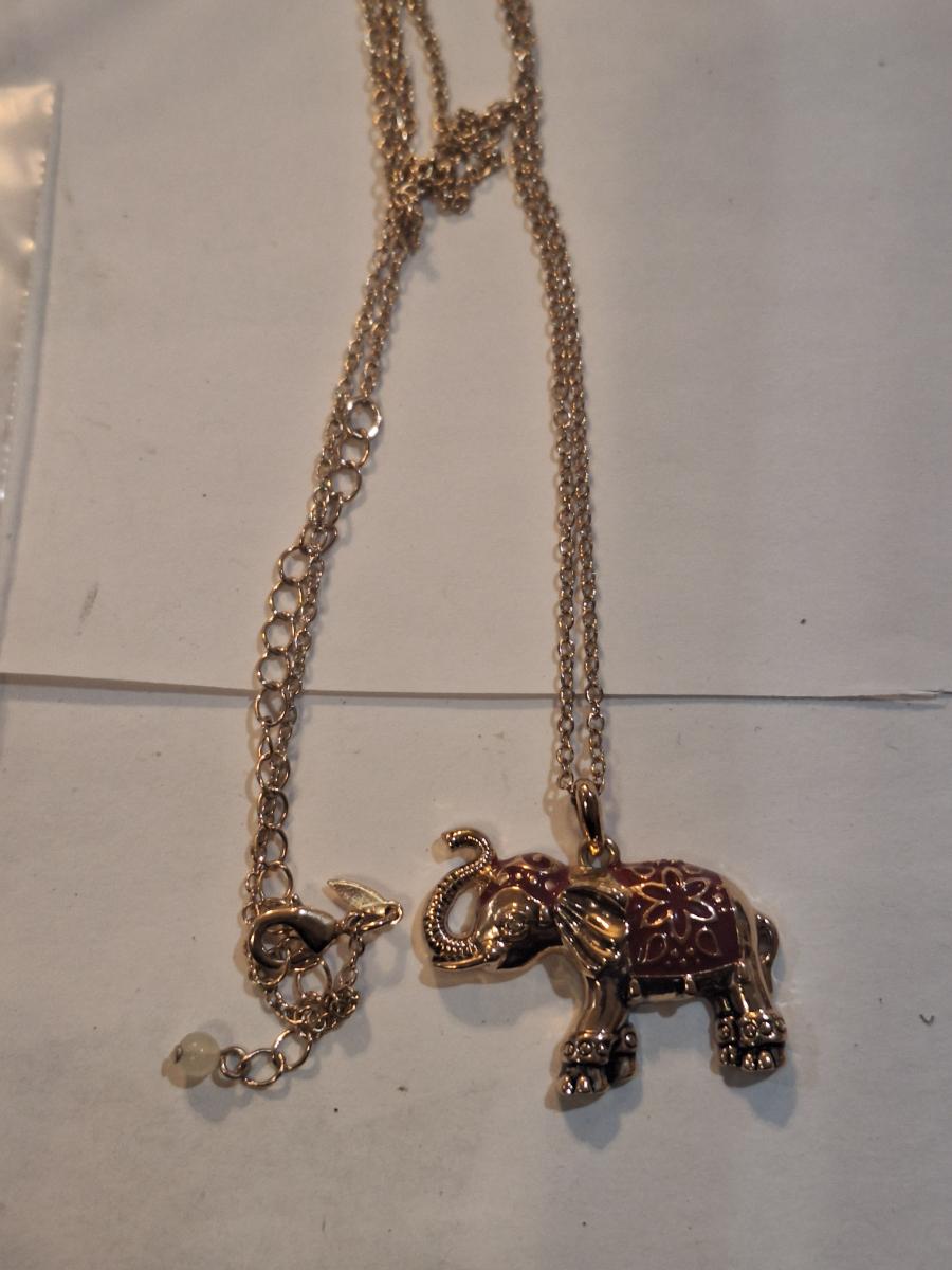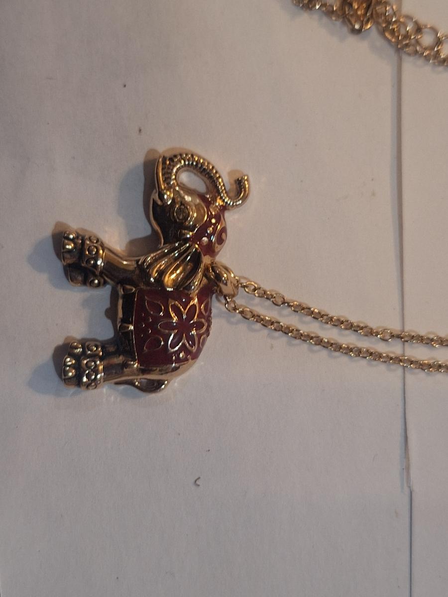 Betsey Johnson elephant pendant necklace in gold-tone metal with enamel and crystal rhinestones