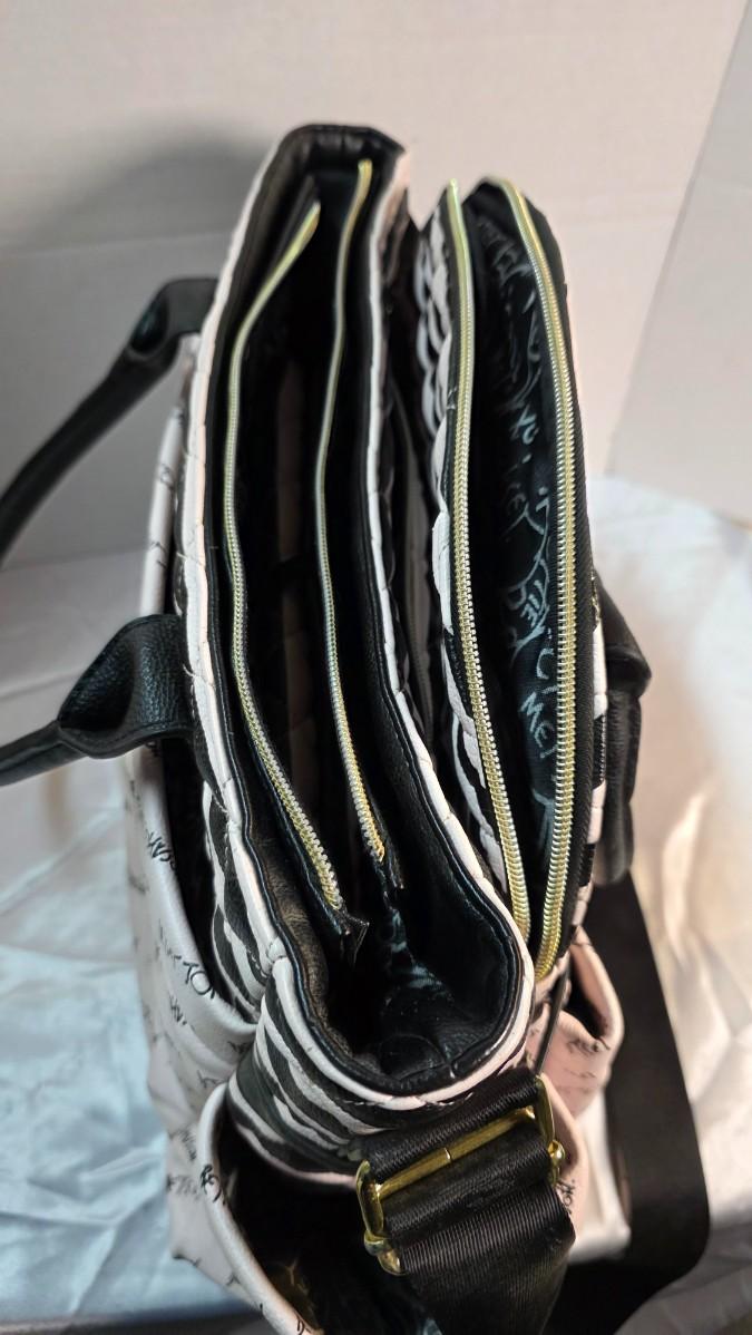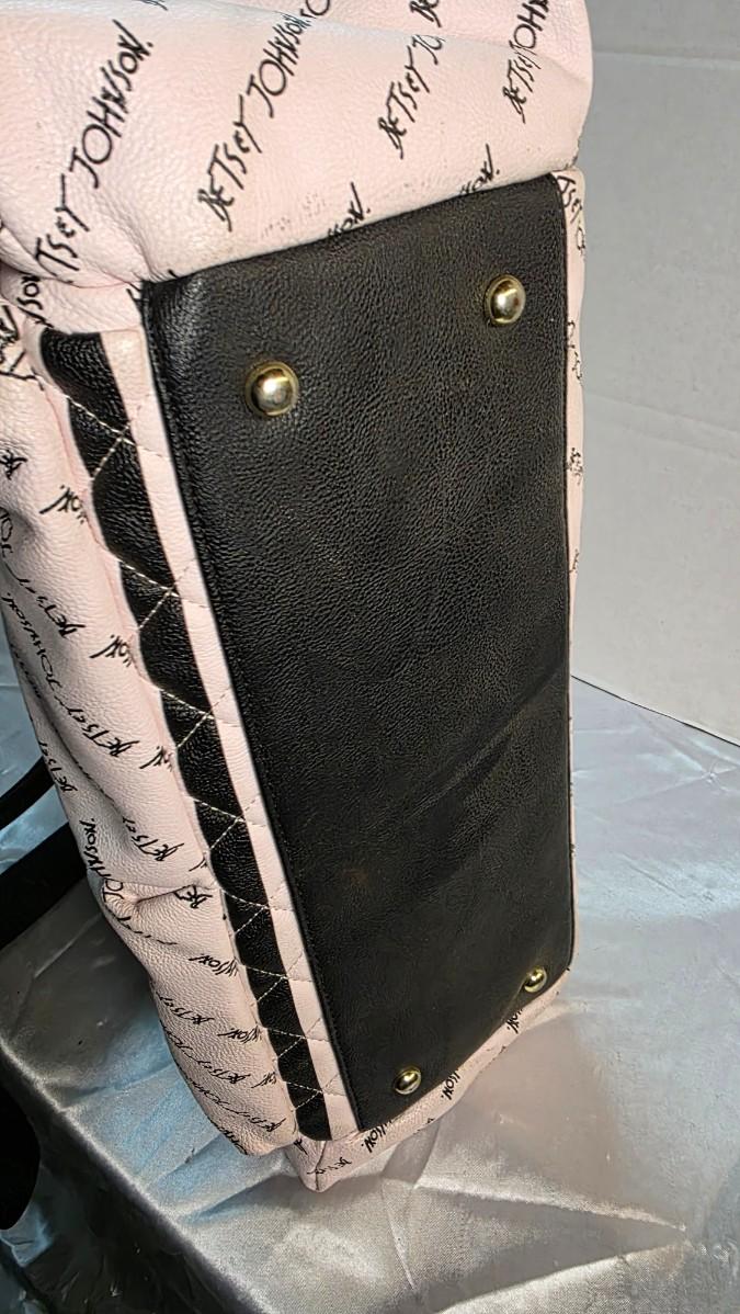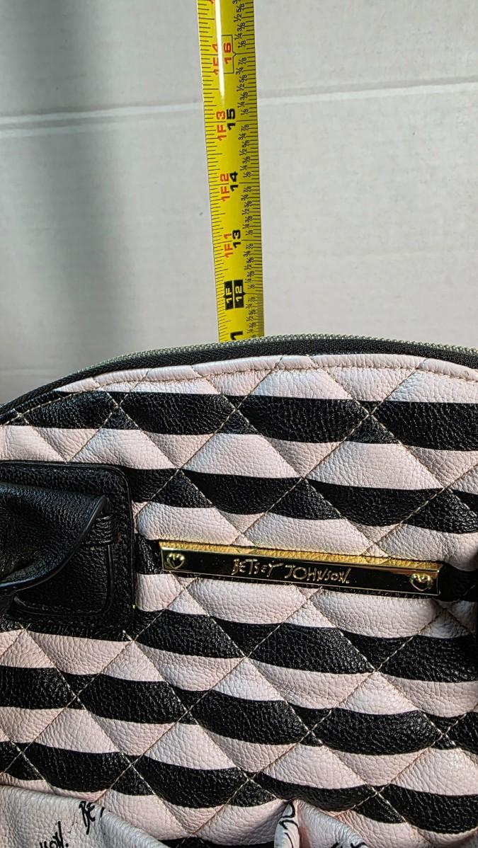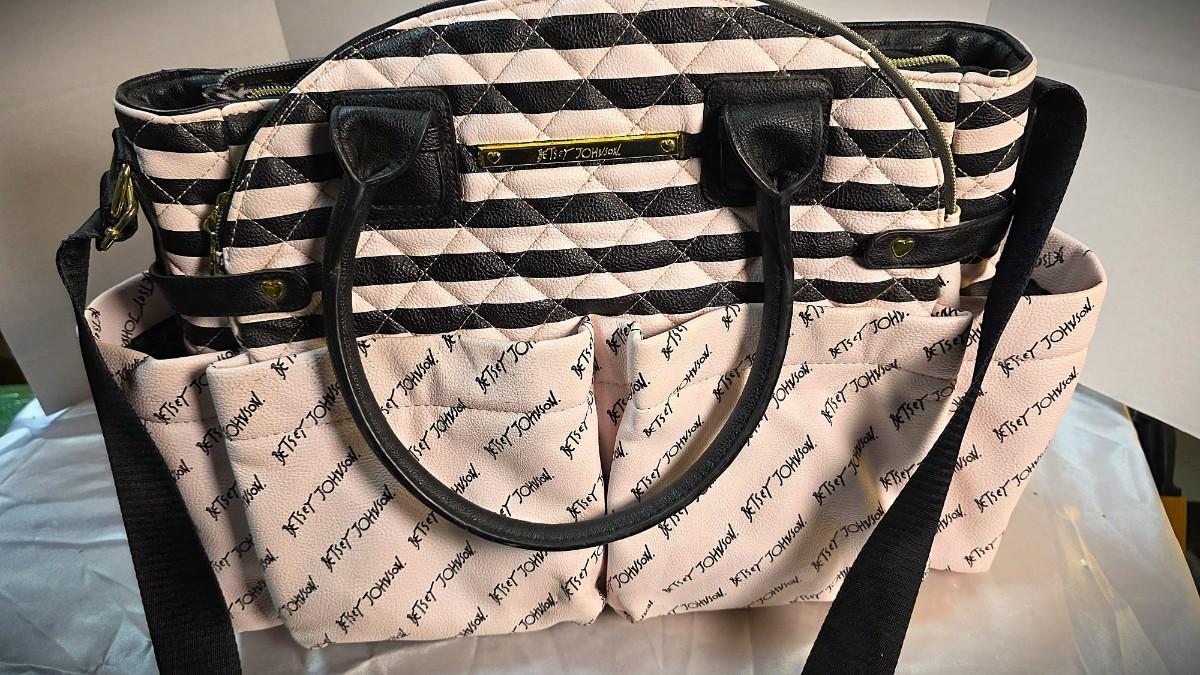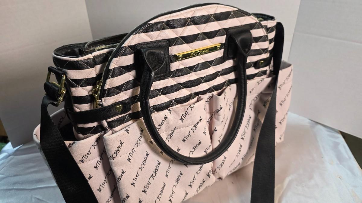 This piece is in new condition without tags, showing no signs of prior use. All zippers function smoothly, the interior lining is clean and intact, and the exterior retains its original shape and finish. While often marketed as a diaper bag, the design transcends that category, making it an ideal choice for anyone seeking a stylish, functional designer tote with iconic Betsey Johnson flair.
