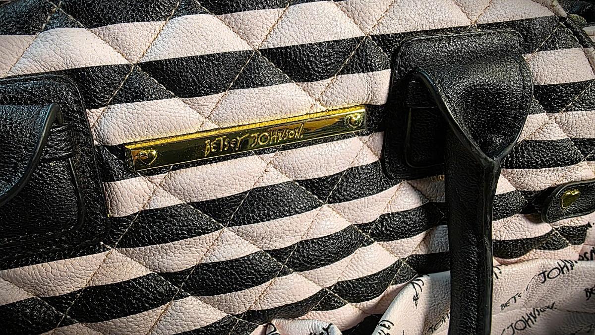 This Betsey Johnson designer tote presents a bold, unmistakable blend of playful glamour and practical sophistication, rendered in a striking black-and-blush palette. The exterior features a quilted, wave-pattern stripe design in alternating black and soft pink, accented by structured black trim, reinforced handles, and polished gold-tone hardware, including the signature Betsey Johnson nameplate. The lower portion is finished in blush pink with repeating Betsey Johnson script, adding a distinctive branded contrast that elevates the overall aesthetic.