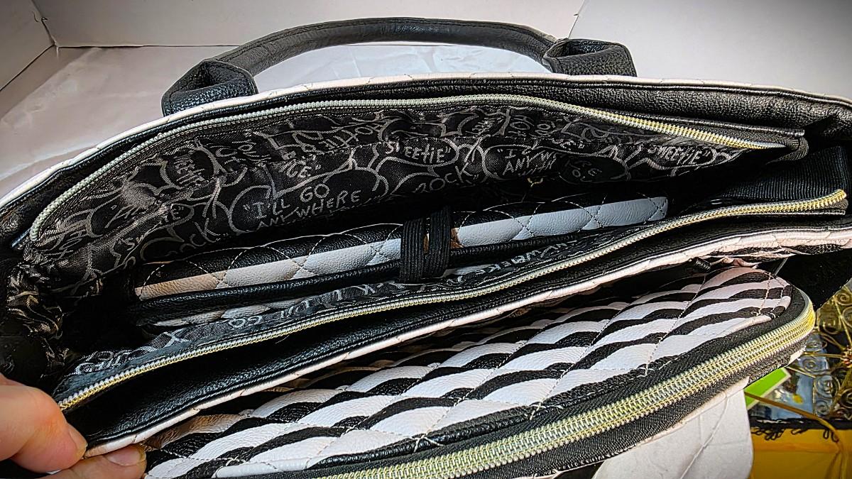 Crafted from high-quality faux leather with careful stitching throughout, the bag maintains excellent structure and durability while remaining visually refined. The interior reveals multiple thoughtfully designed compartments, zippered sections, and organizational pockets, making it equally suited for use as a diaper bag, travel tote, or everyday designer carryall. A removable shoulder strap provides versatility, allowing the bag to transition effortlessly between hand-carry and crossbody wear.