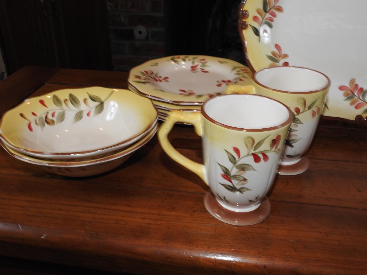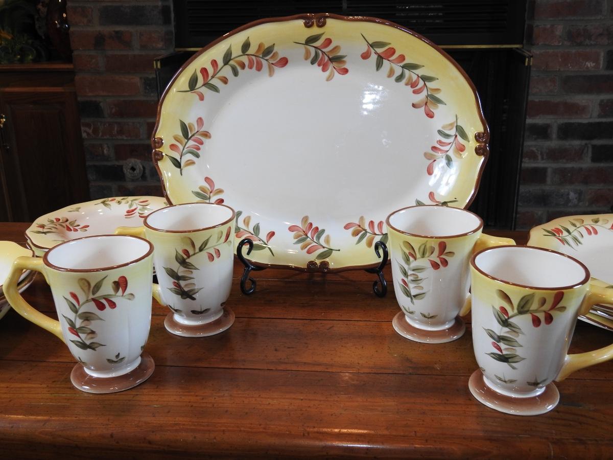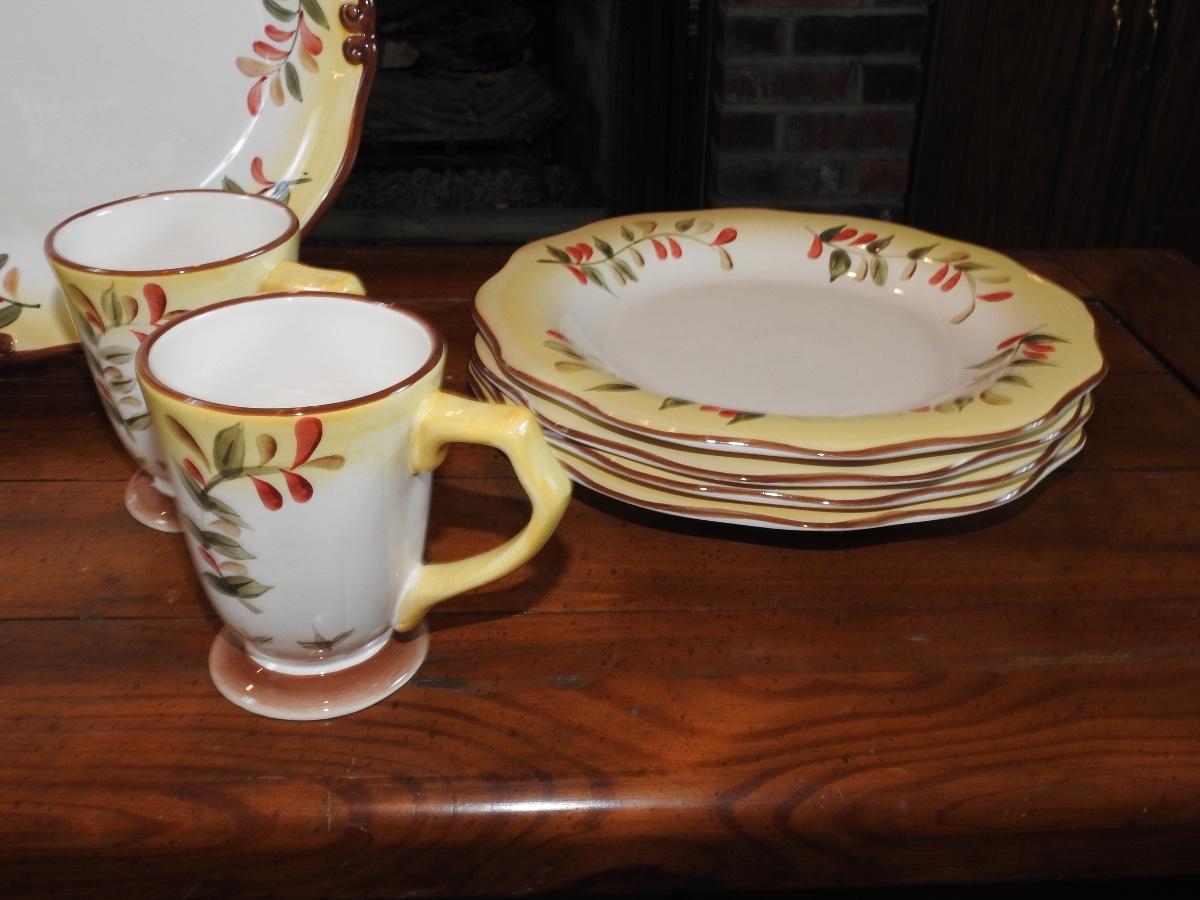 Tuscan retreat. Includes 15 inch oval serving platter, dinner plates dessert plates, small bowls, four coffee mugs. See photos for condition issues.