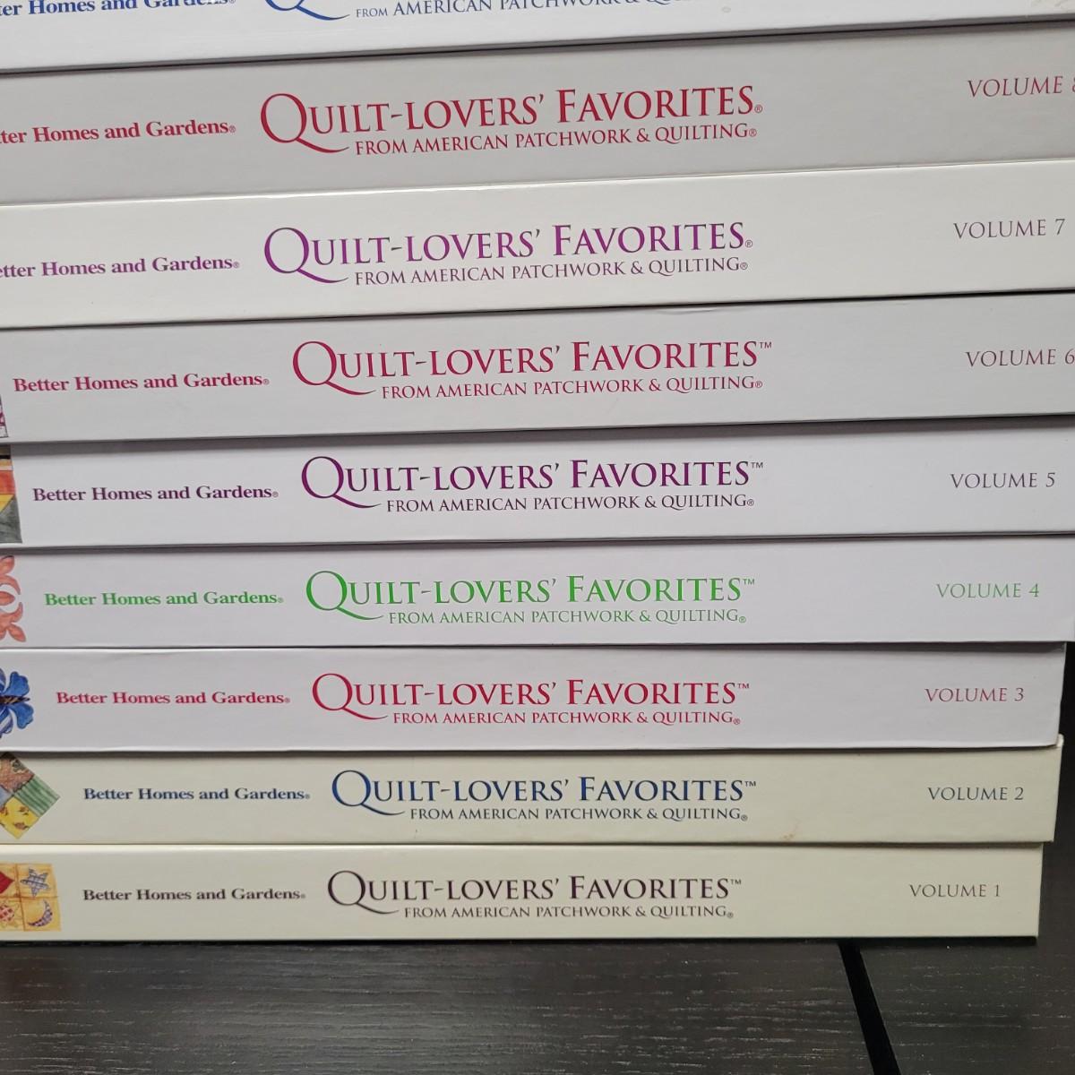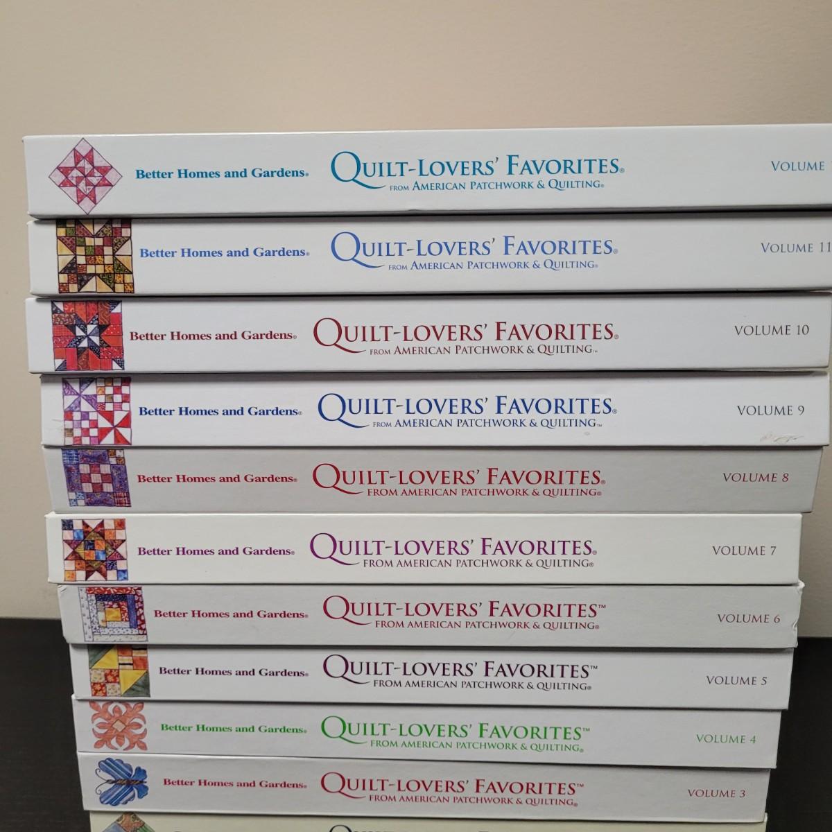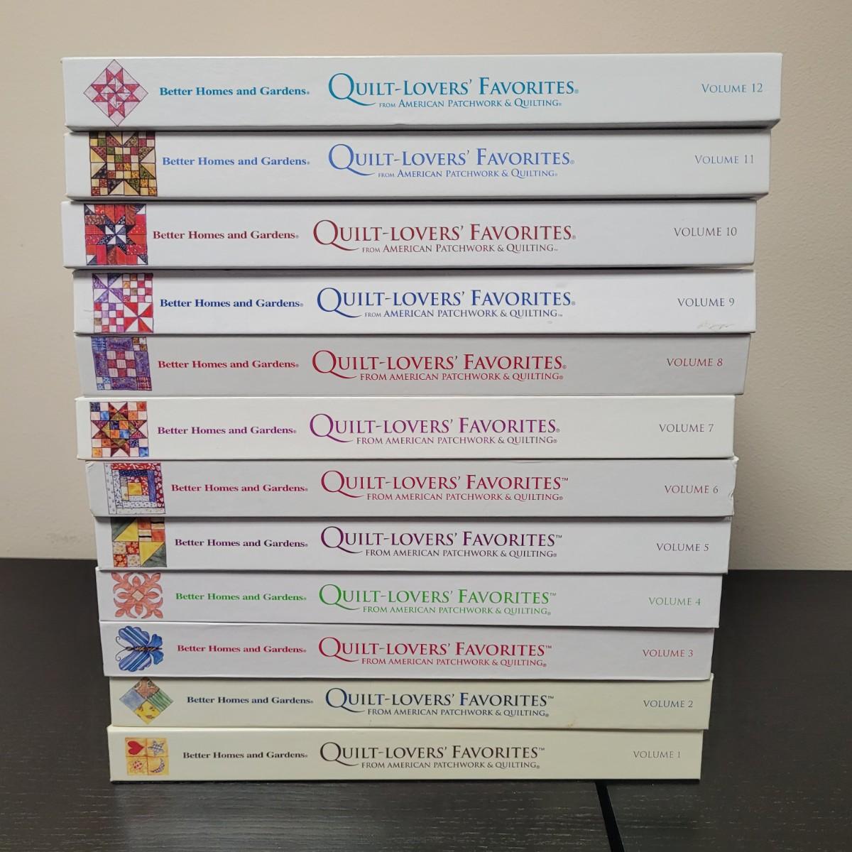 This lot includes 12 volumes of Better Homes and Gardens Quilt-Lovers Favorites books. These books are hard back binder style and include patterns. Each book is unique and has about 150 pages. They detail processes and history of different styles and patterns of quilt.