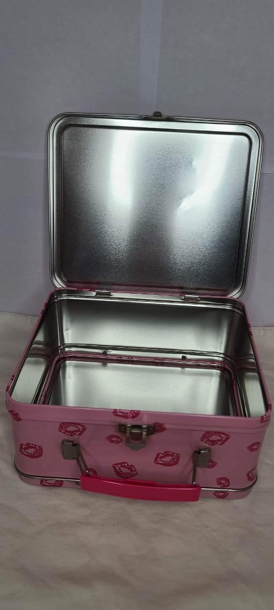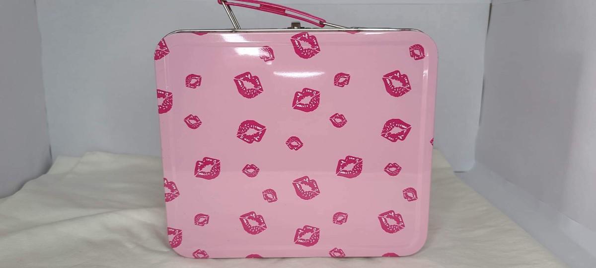 Opening the case reveals a clean metal interior with fitted compartments, evoking the feel of classic travel or keepsake boxes from decades past. The visual contrast between the glossy pink exterior and silver interior creates a striking presentation that stands out on shelves, desks, or themed collections. Whether appreciated as pop-art décor, nostalgic memorabilia, or a functional storage piece, it carries unmistakable personality and recognizable cultural flair.