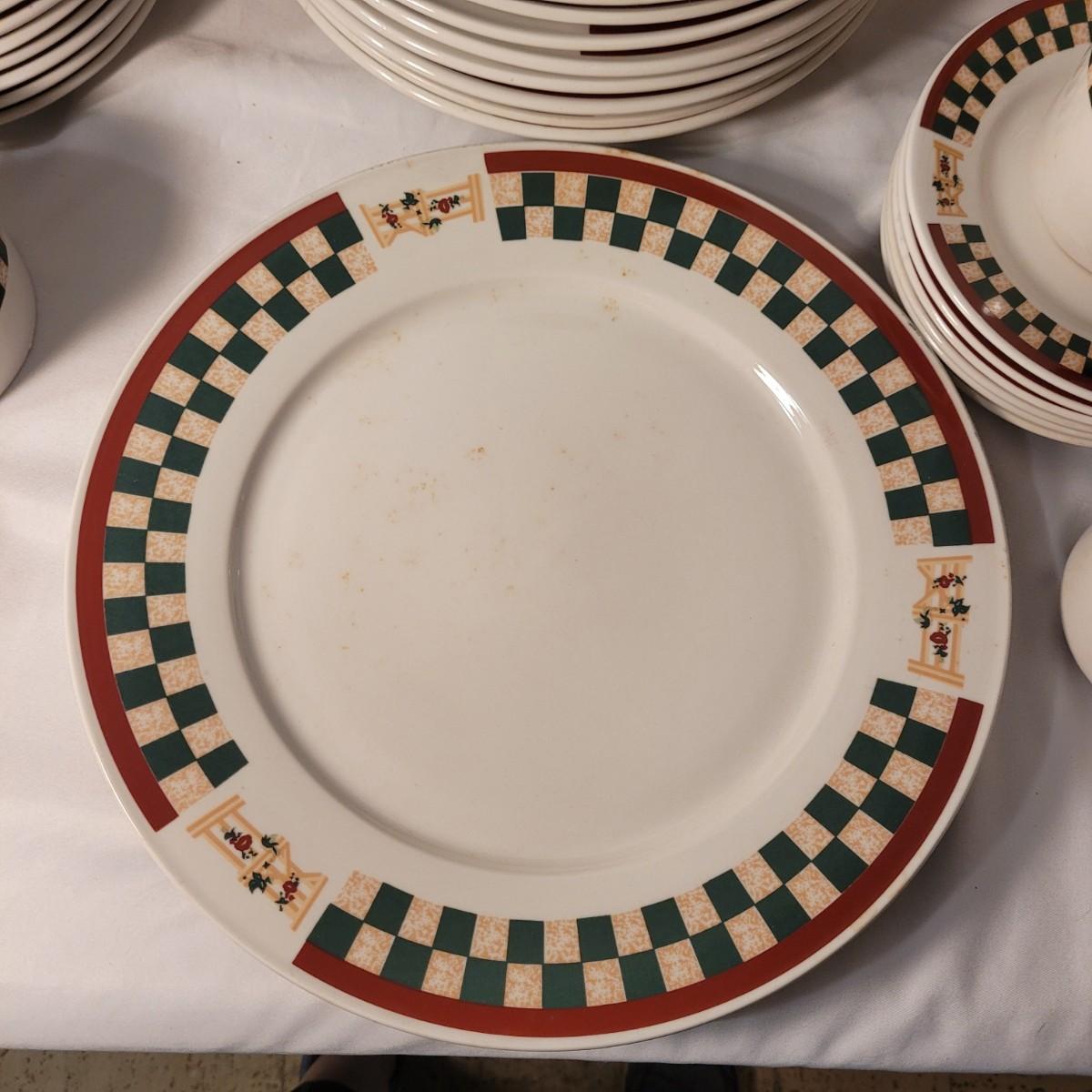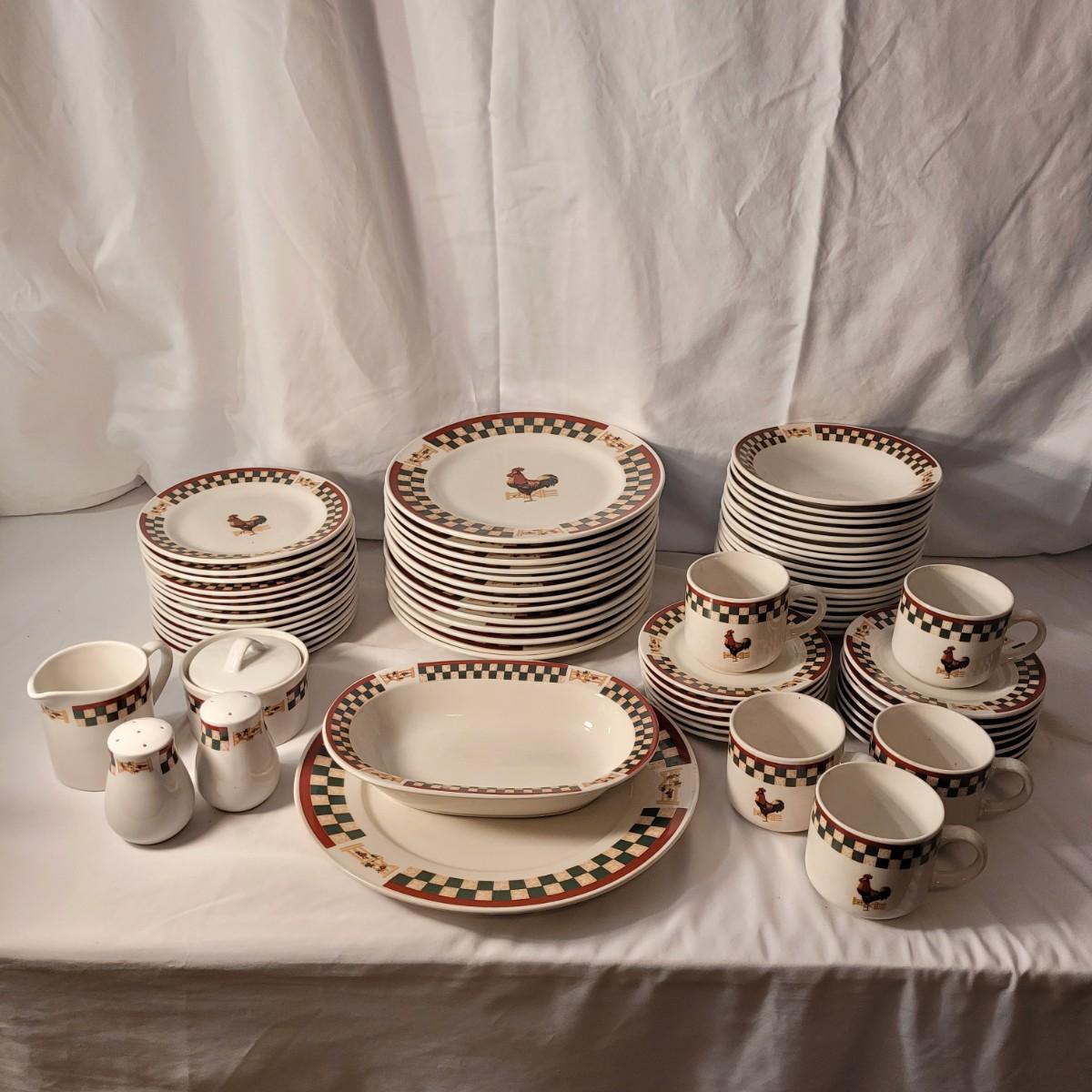 This set of Betty Crocker “Daybreak” dishware includes thirteen dinner plates and small plates, seventeen bowls, thirteen saucers, five mugs, one large serving dish, one oval serving bowl, a salt and pepper shaker and sugar and creamer set. Some items need to be cleaned. Large serving dish measures approximately 12”D, dinner plate 10.5”D. Shipping available.