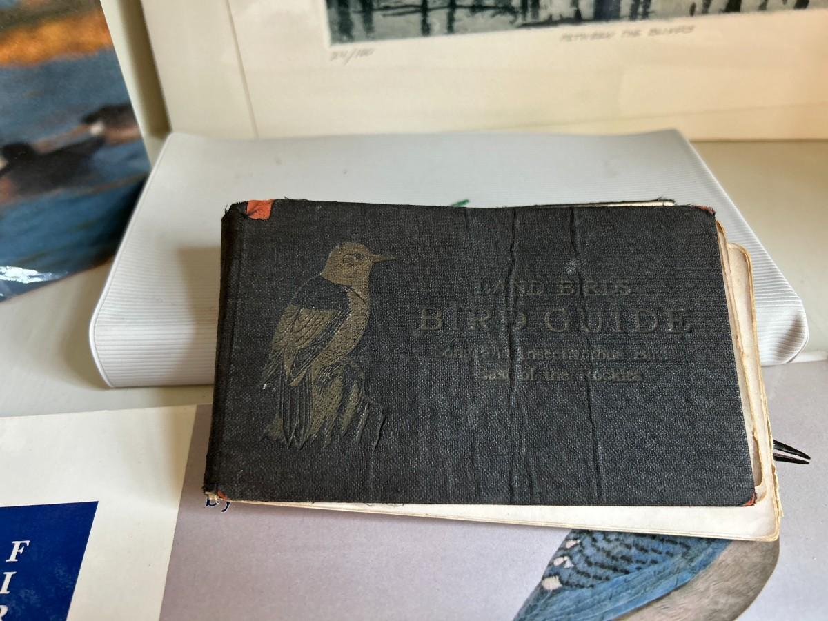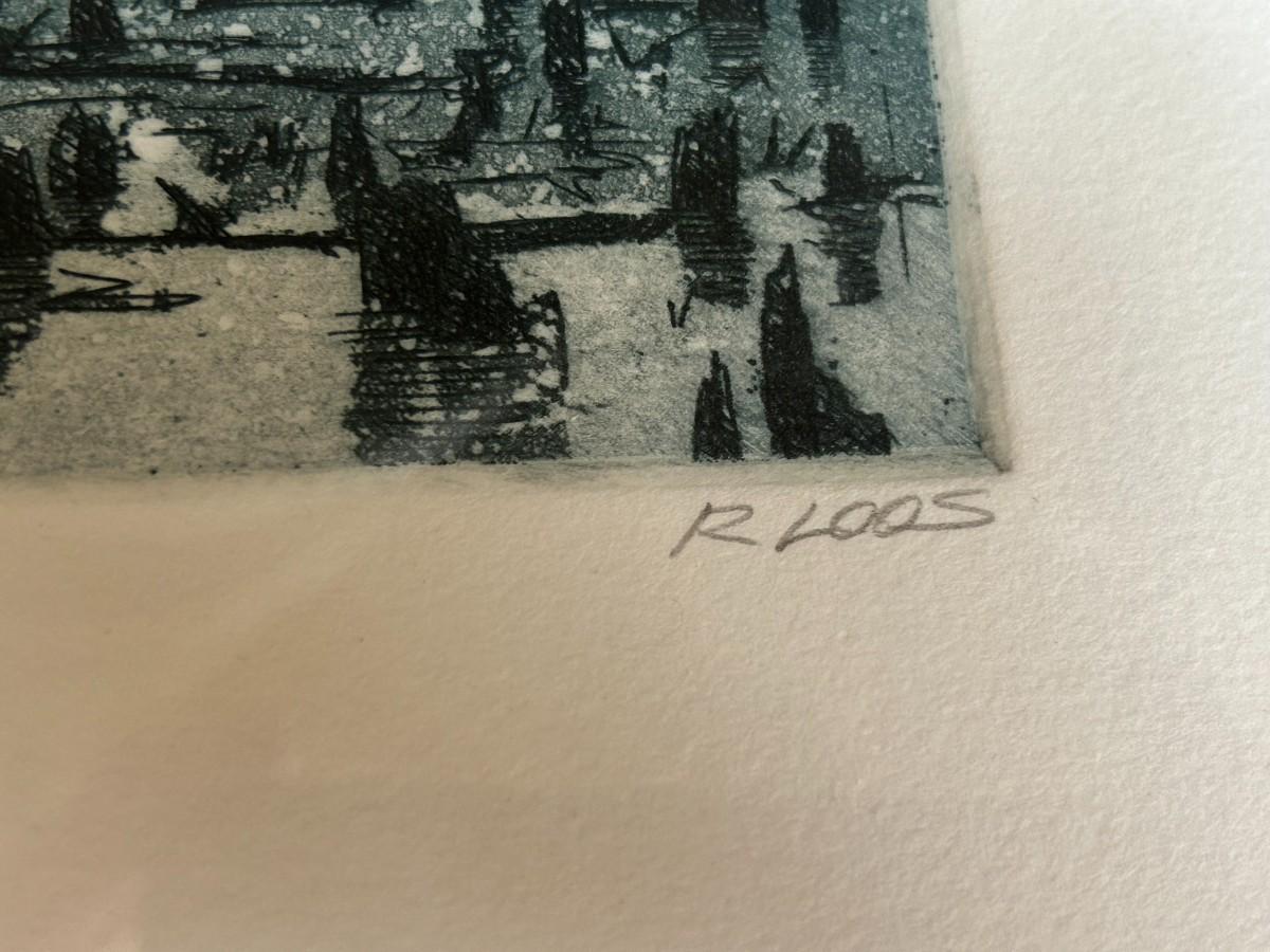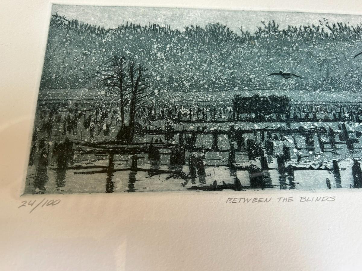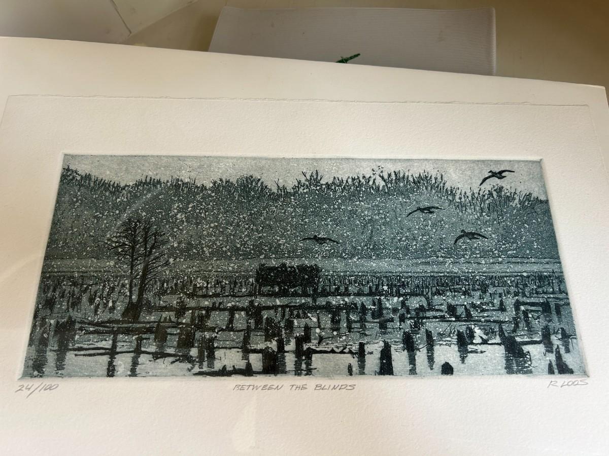 Bird Books and Ryland Loos pencil etching, "Between the Blinds" shows birds flying in a snowstorm with brush in the background. Matted and wrapped.