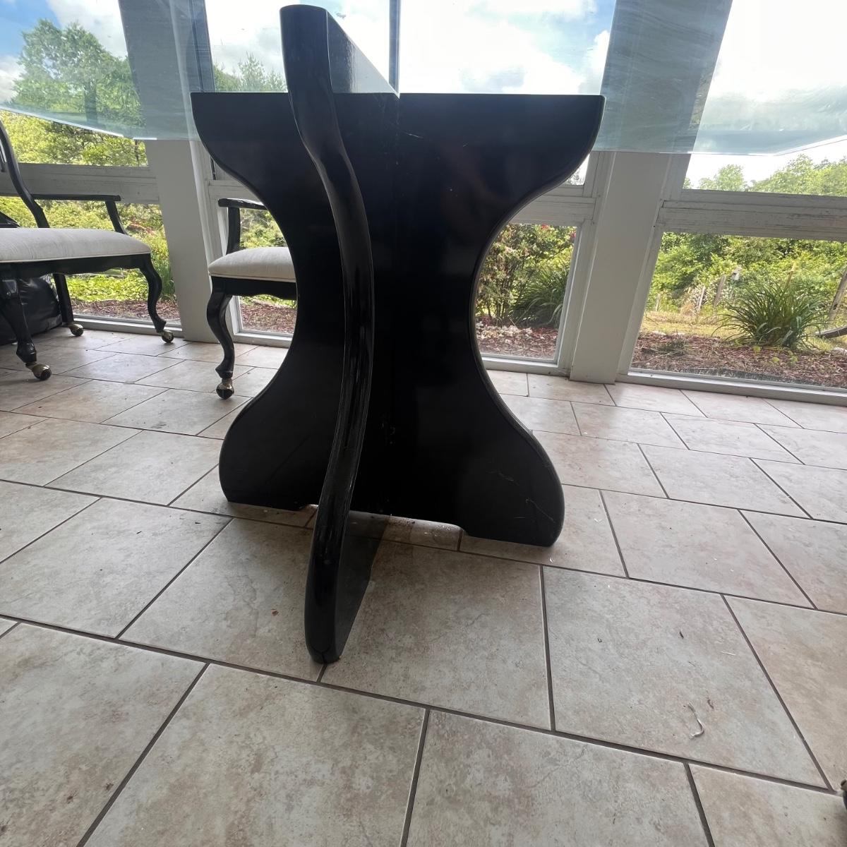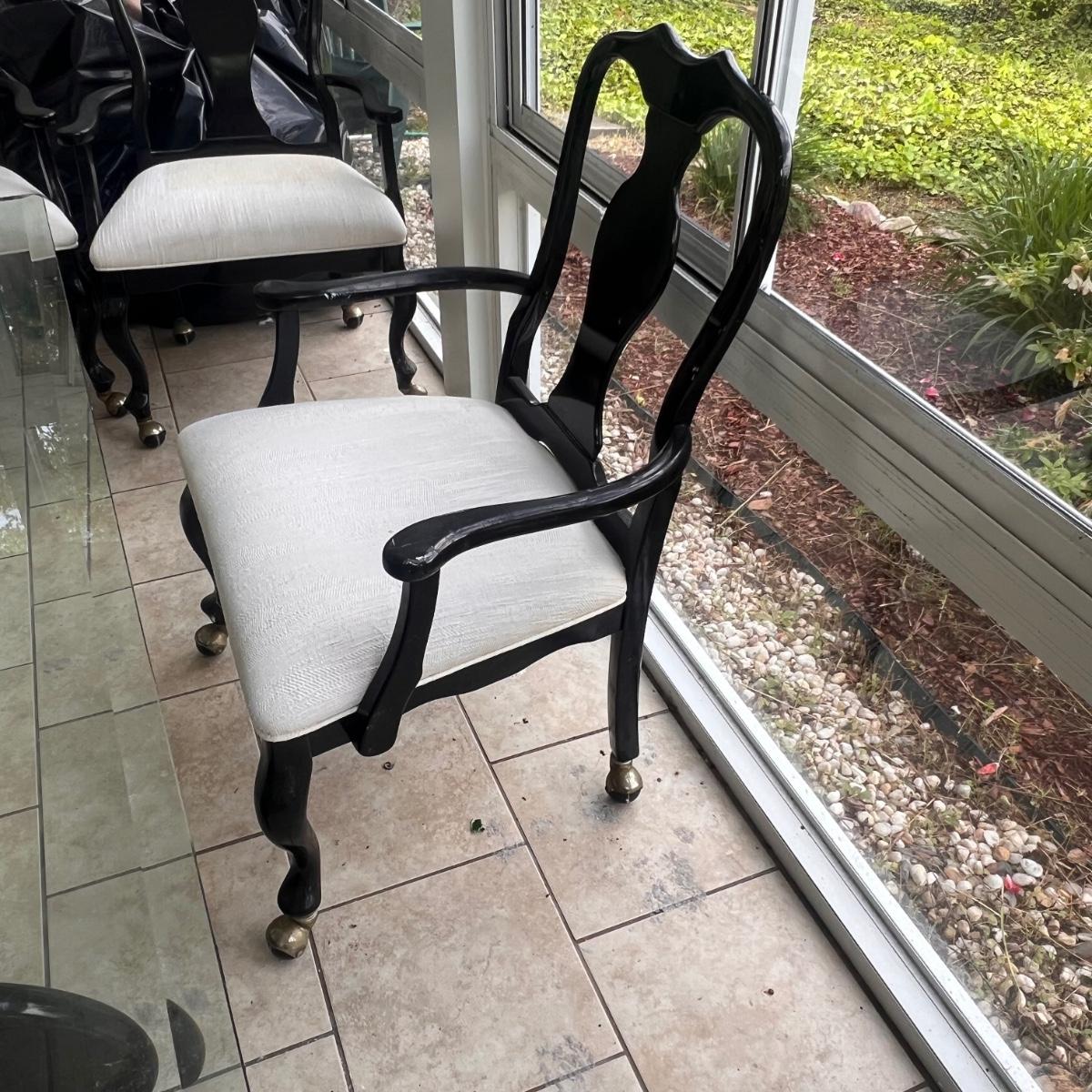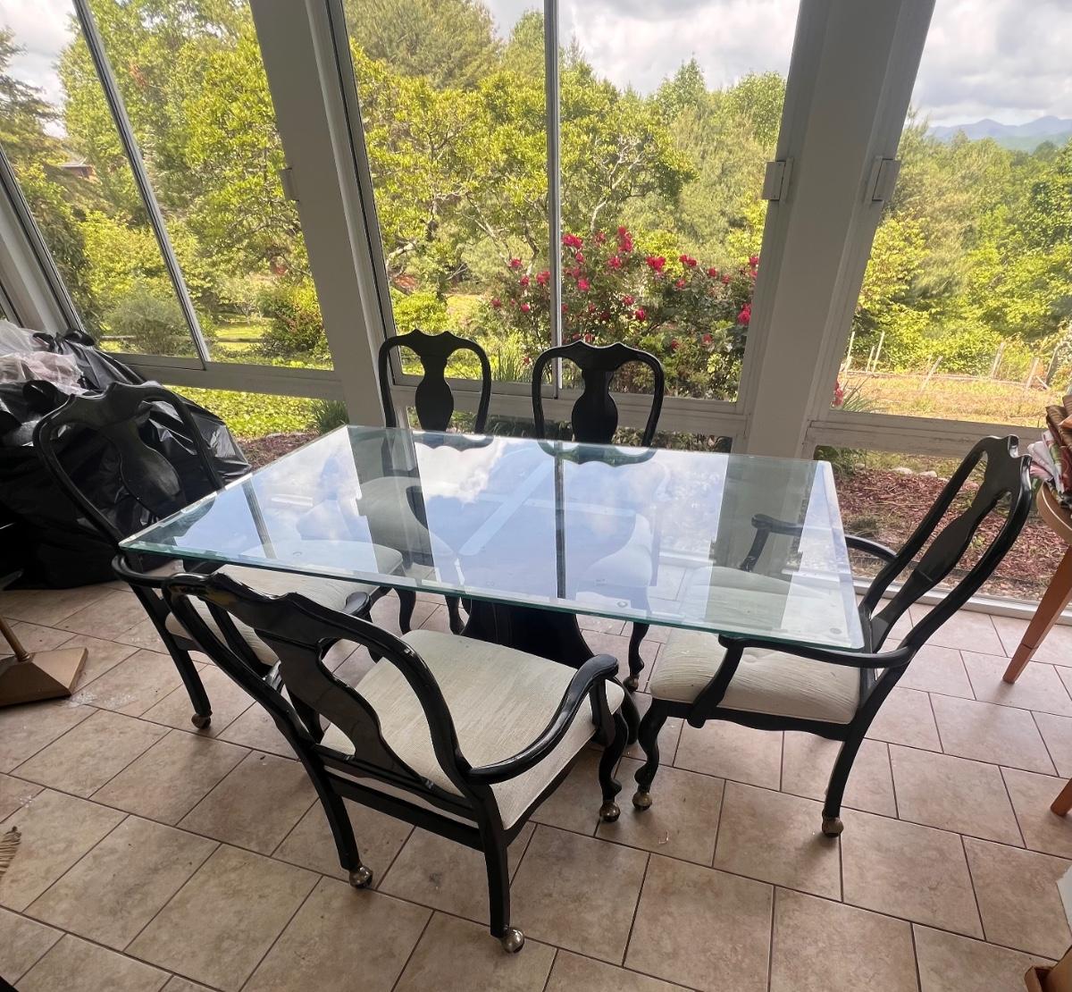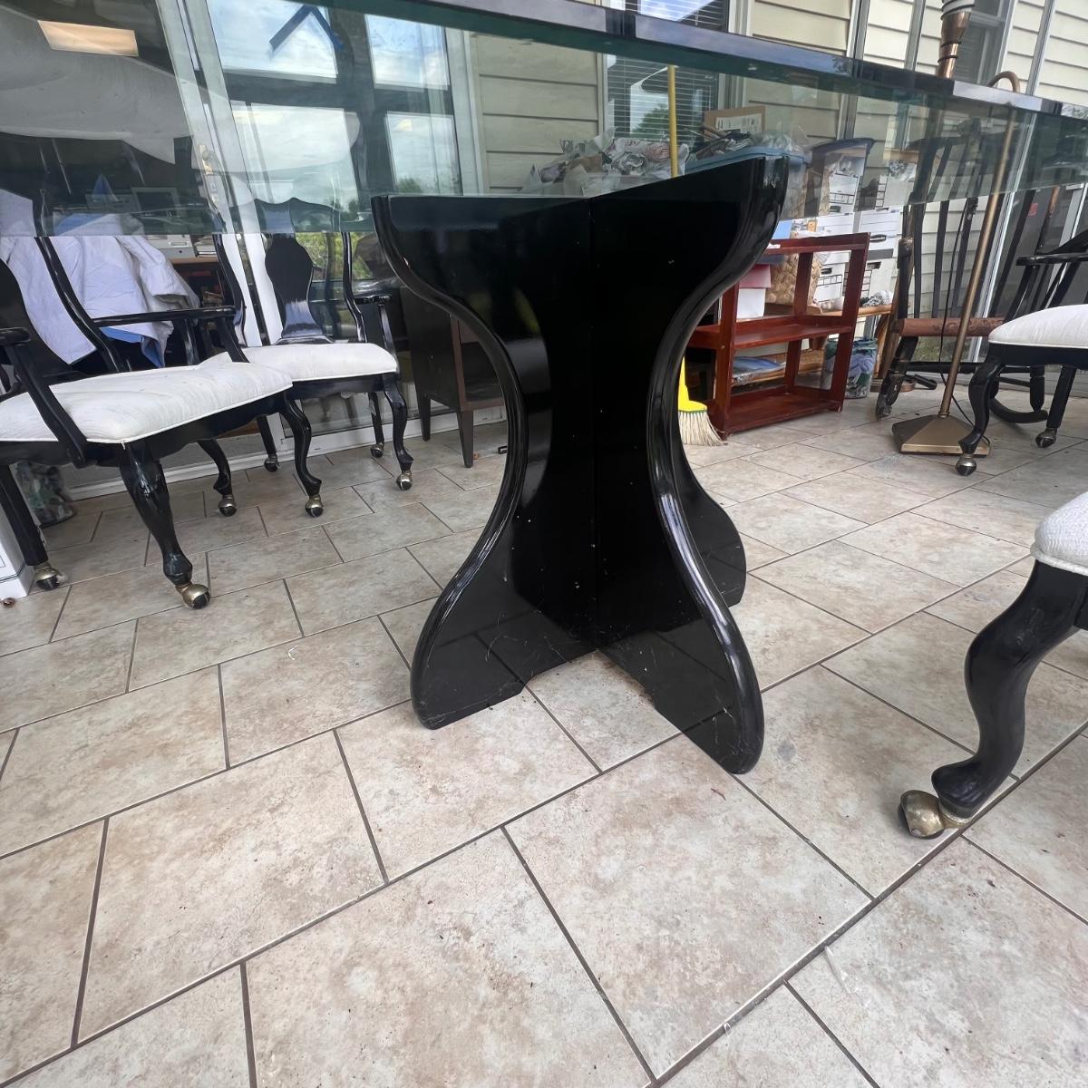 This elegant dining table comes with five matching chairs all with arms. The pedestal base and chair frames are wood painted black. The removable tabletop is 1/4" thick beveled glass. Note that this set does need some TLC, the glass has a few scratches which are shown in pics but don’t show up well and a lot of areas with residue of some sort on the glass which should come off with gentle cleaning/scraping. The chair frames have lots of nicks in the paint and the cream upholstered seats have discoloration; these items were in a sunroom and boxes were stored on the seats leaving a yellowed discoloration.