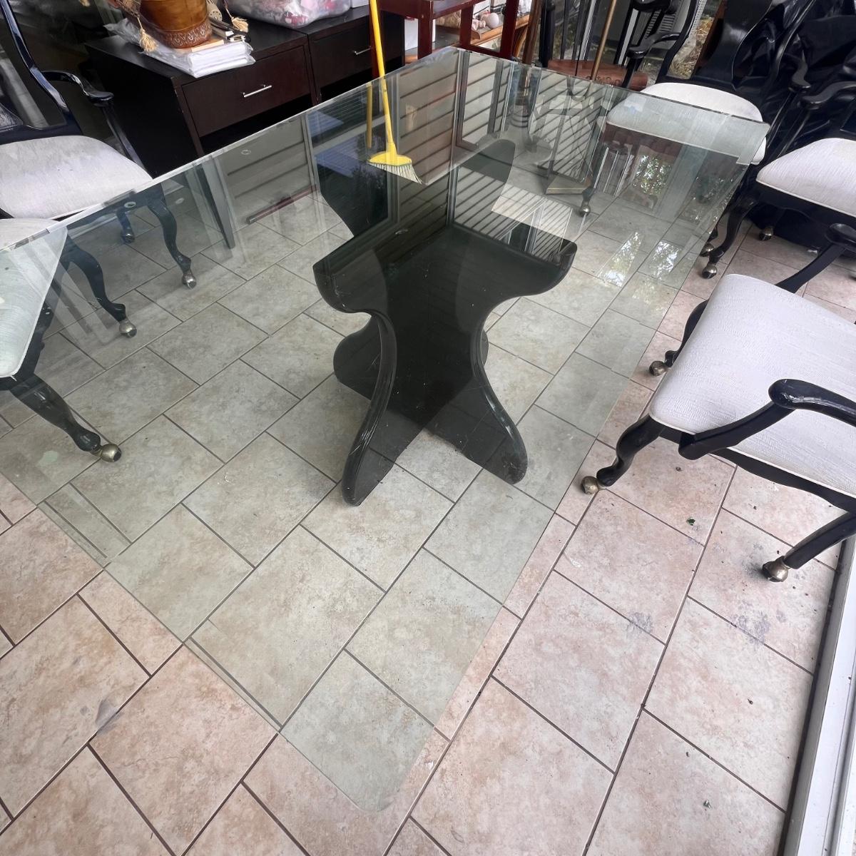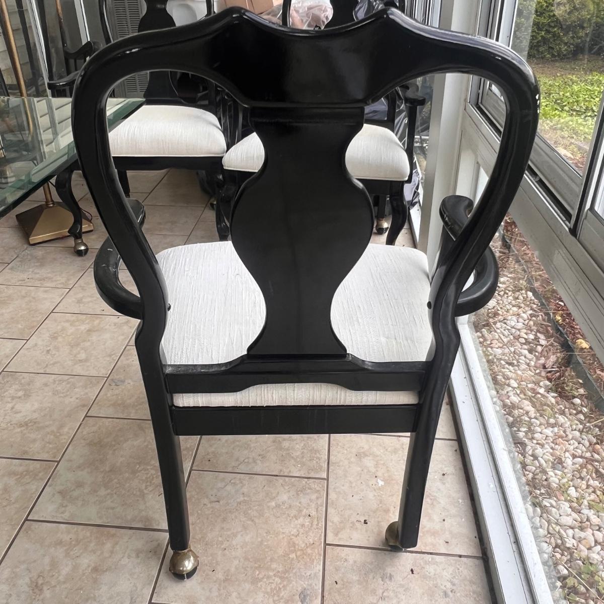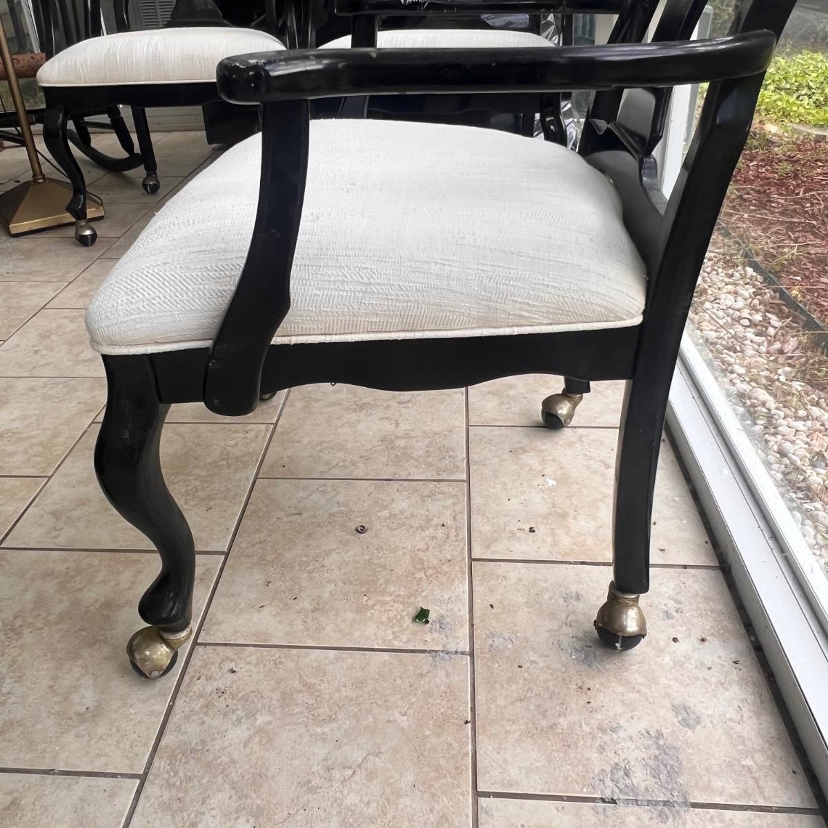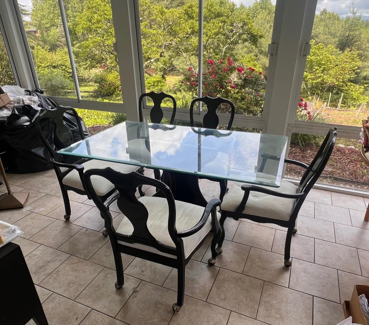 This elegant dining table comes with five matching chairs all with arms. The pedestal base and chair frames are wood painted black. The removable tabletop is 1/4" thick beveled glass. Note that this set does need some TLC, the glass has a few scratches which are shown in pics but don’t show up well and a lot of areas with residue of some sort on the glass which should come off with gentle cleaning/scraping. The chair frames have lots of nicks in the paint and the cream upholstered seats have discoloration; these items were in a sunroom and boxes were stored on the seats leaving a yellowed discoloration.