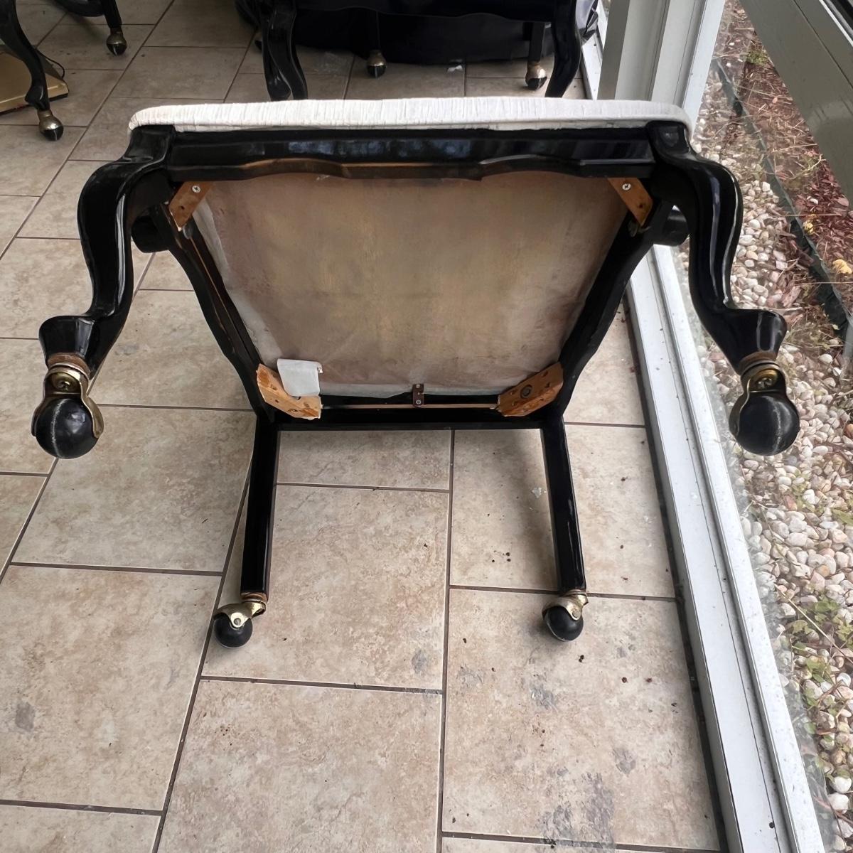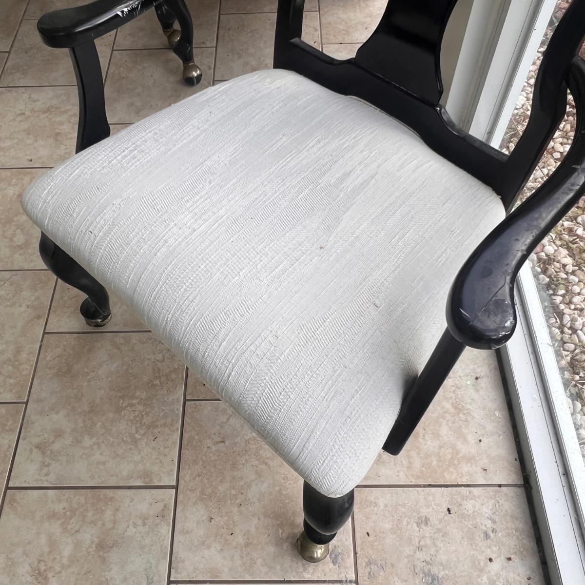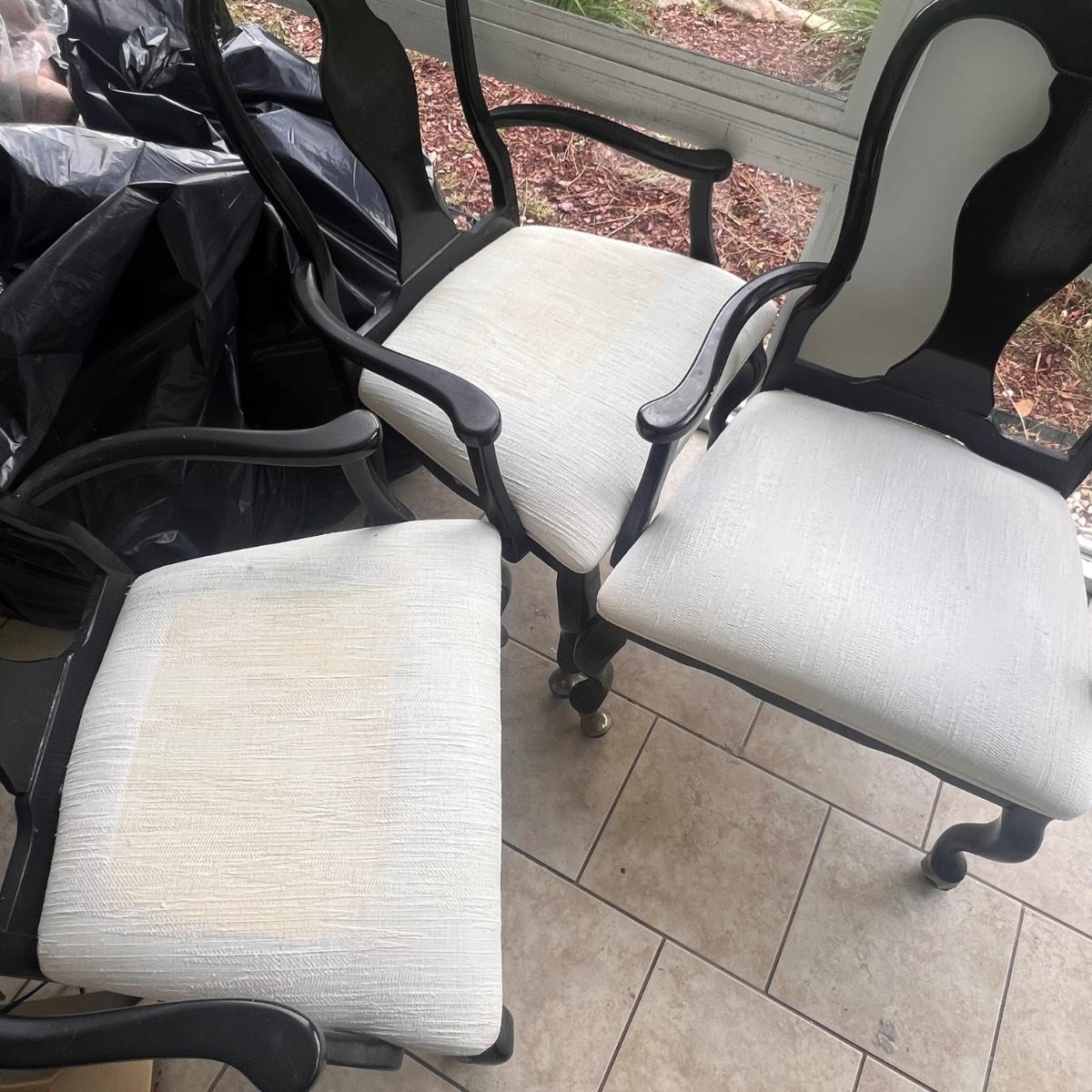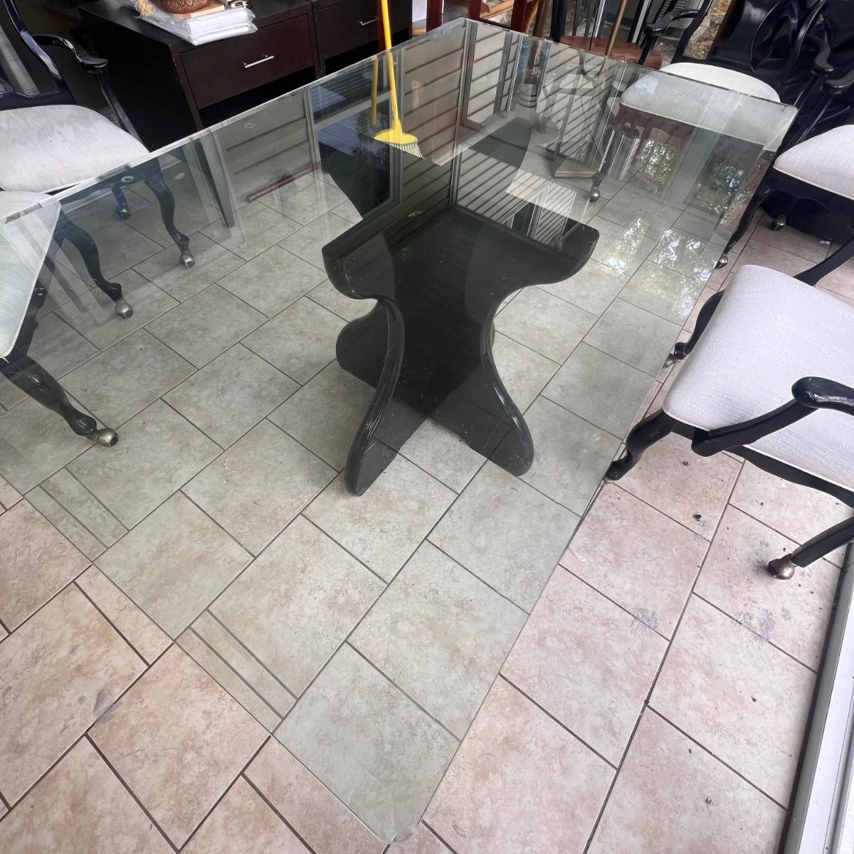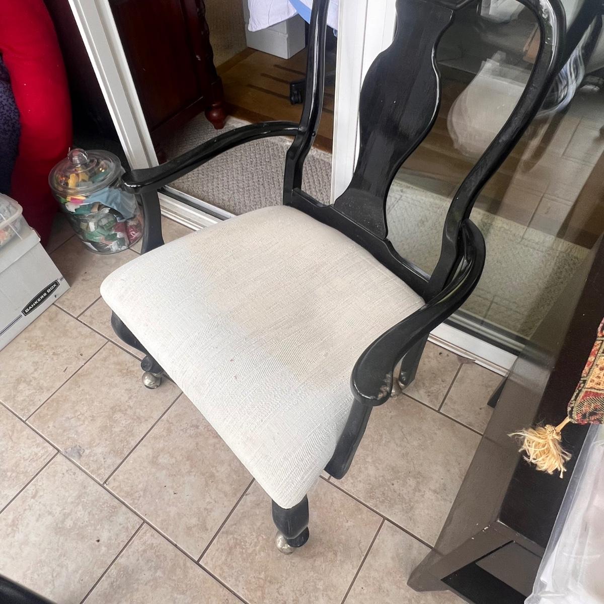 This elegant dining table comes with five matching chairs all with arms. The pedestal base and chair frames are wood painted black. The removable tabletop is 1/4" thick beveled glass. Note that this set does need some TLC, the glass has a few scratches which are shown in pics but don’t show up well and a lot of areas with residue of some sort on the glass which should come off with gentle cleaning/scraping. The chair frames have lots of nicks in the paint and the cream upholstered seats have discoloration; these items were in a sunroom and boxes were stored on the seats leaving a yellowed discoloration.