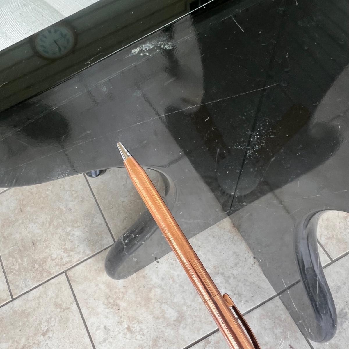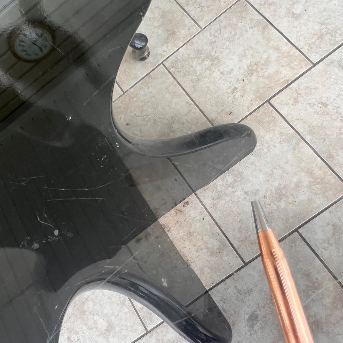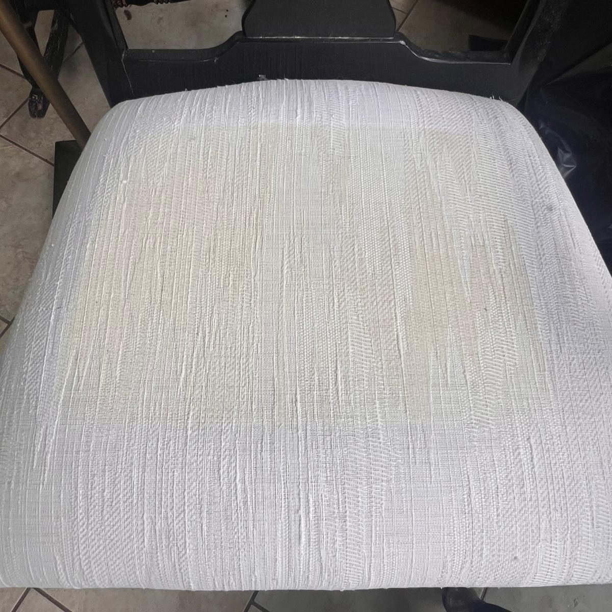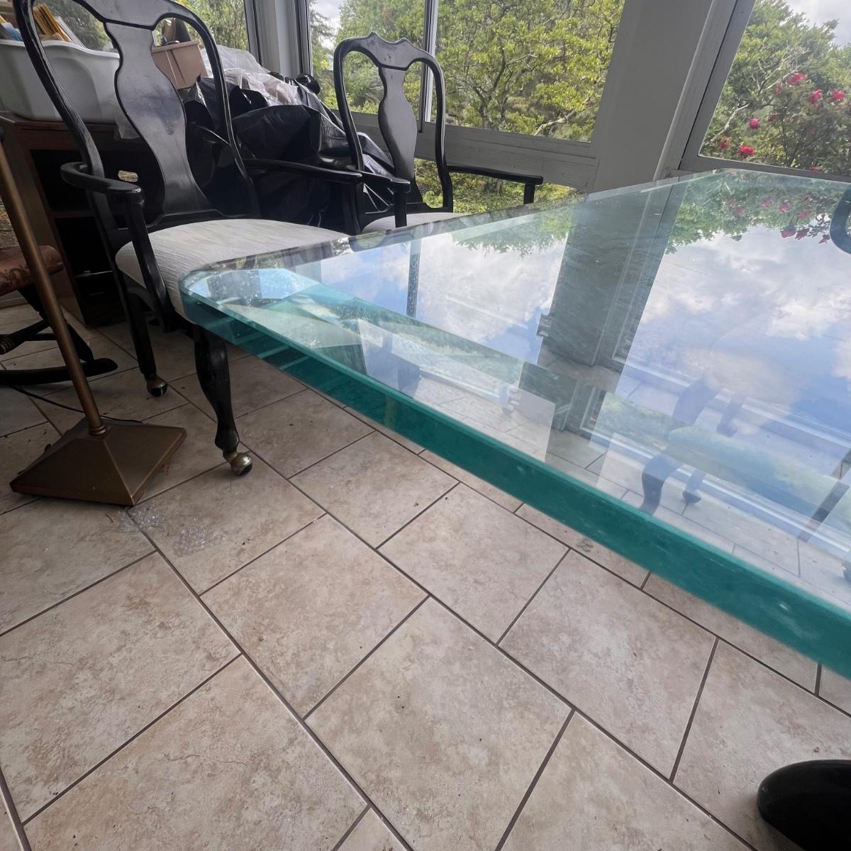 This elegant dining table comes with five matching chairs all with arms. The pedestal base and chair frames are wood painted black. The removable tabletop is 1/4" thick beveled glass. Note that this set does need some TLC, the glass has a few scratches which are shown in pics but don’t show up well and a lot of areas with residue of some sort on the glass which should come off with gentle cleaning/scraping. The chair frames have lots of nicks in the paint and the cream upholstered seats have discoloration; these items were in a sunroom and boxes were stored on the seats leaving a yellowed discoloration.