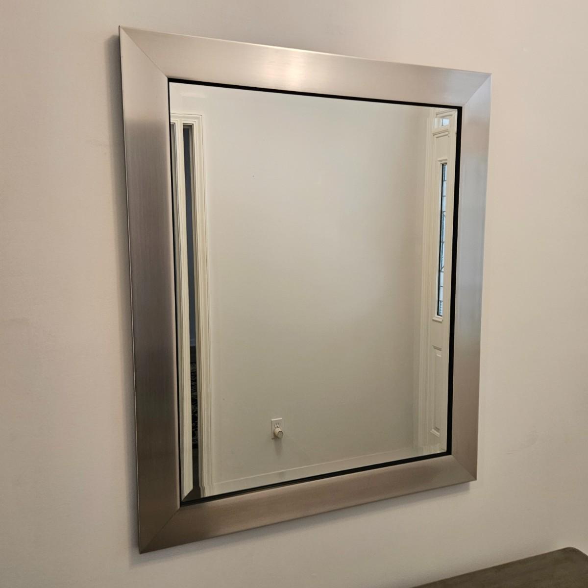 A beveled mirror in a chrome frame made of wood with black edges. It has a 1" bevel and measures approximately 29" x 35". It can hang horizontally or vertically. Local pickup only