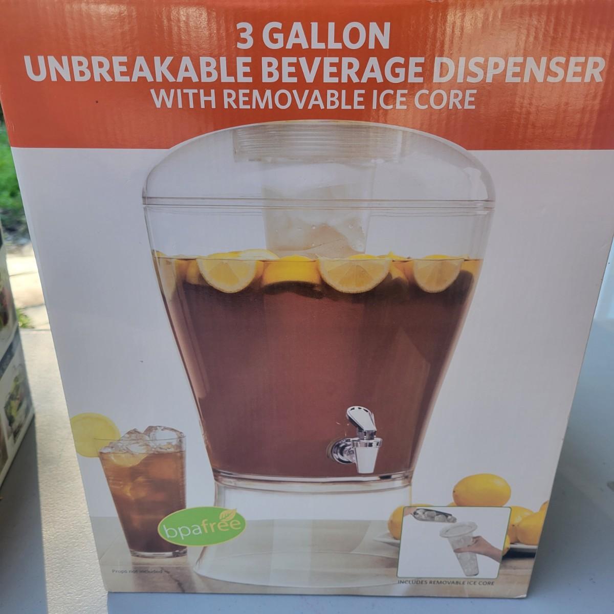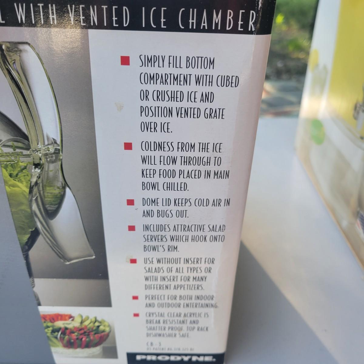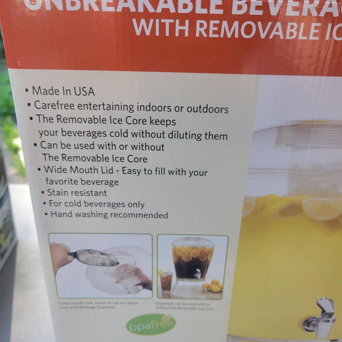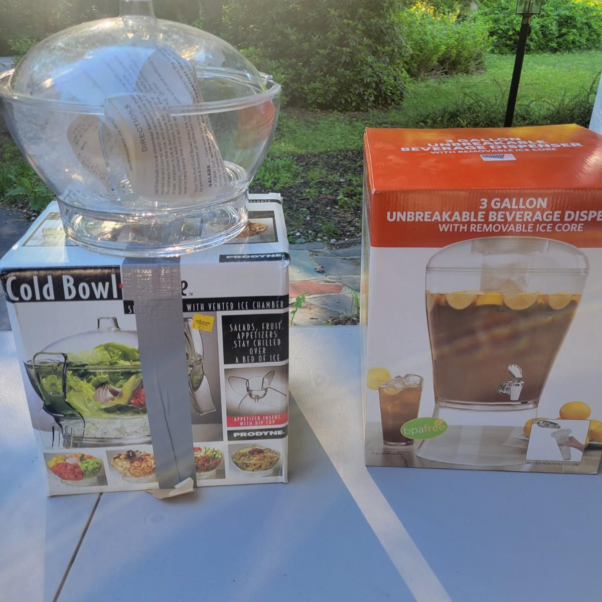 Items for patio entertainment. 3 gallon beverage dispenser with removable ice core. New and in original packaging. Cold bowl with vented ice chamber for keeping salad, fruit and vegetables cool outside. In original packaging but used. Local pickup only