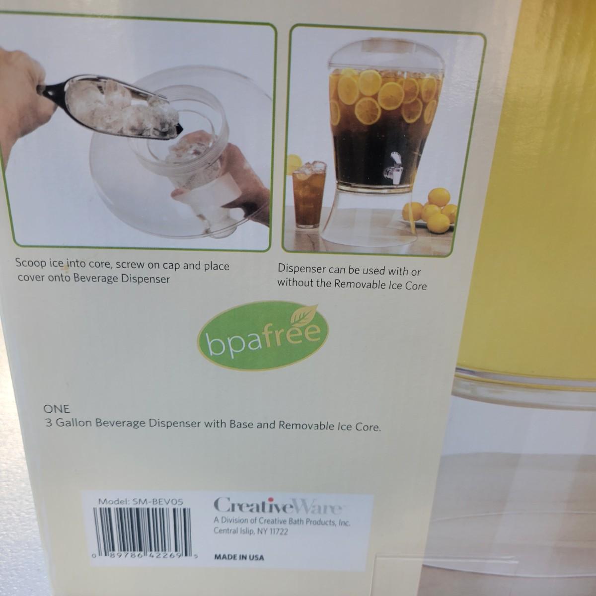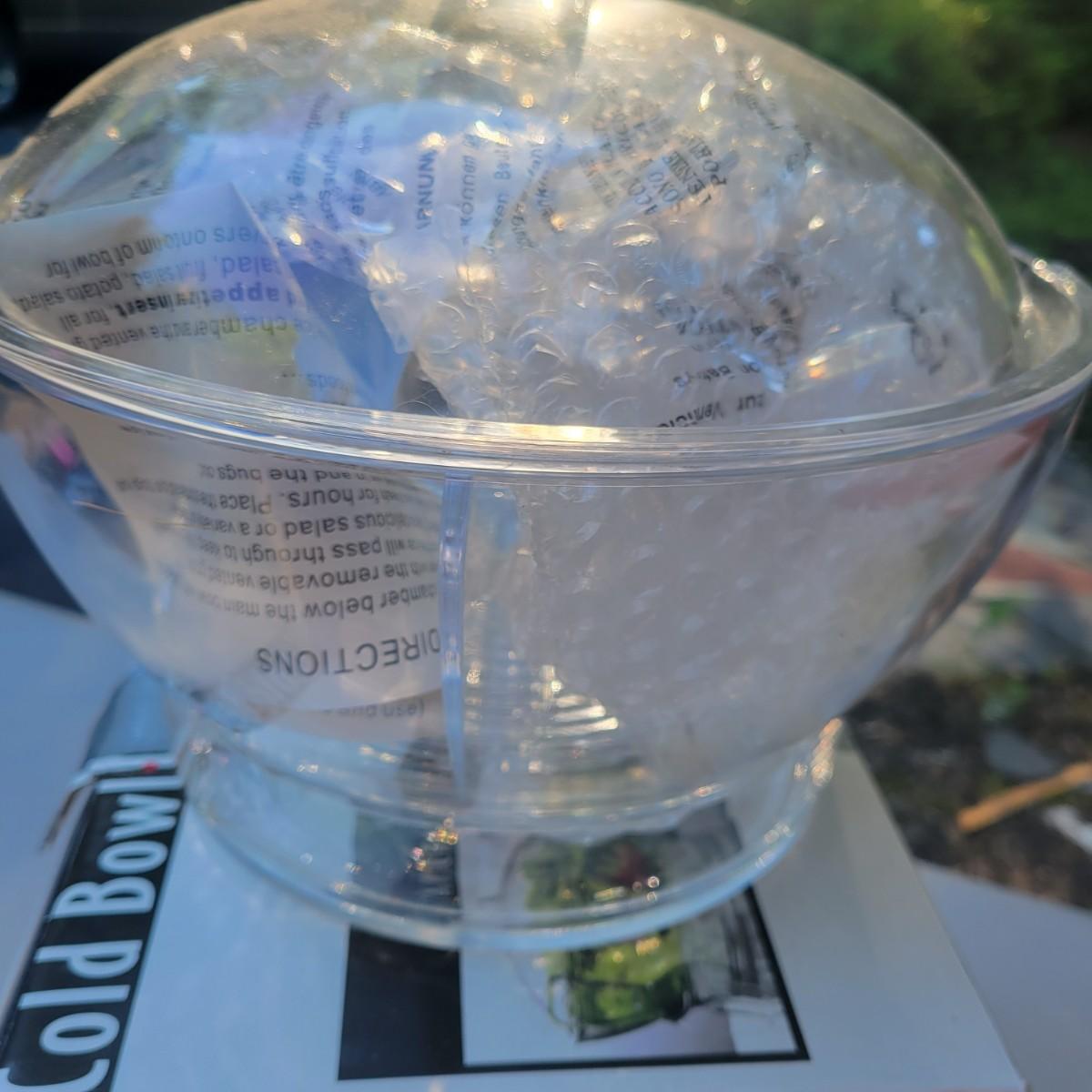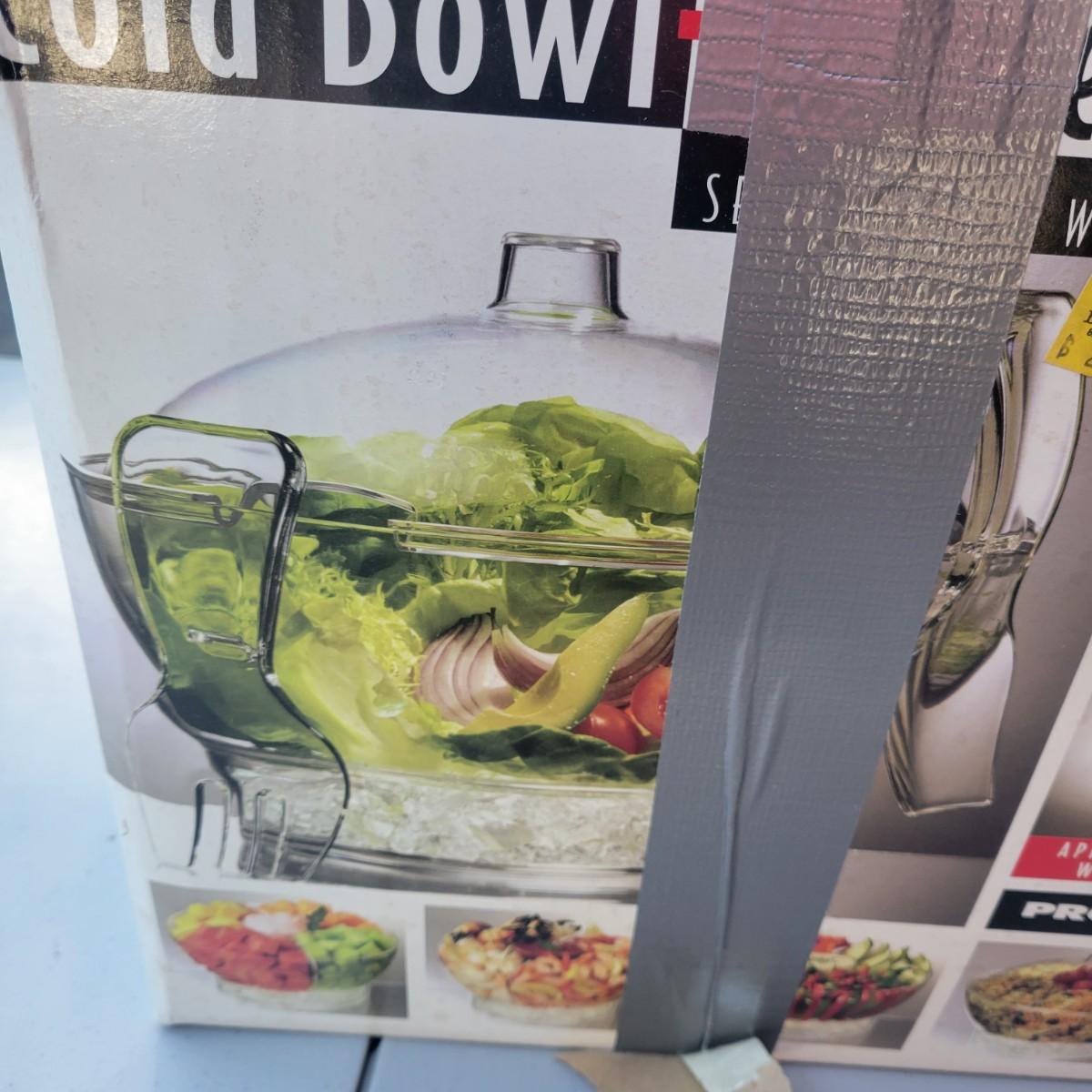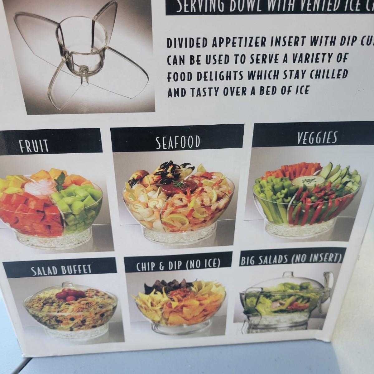 Items for patio entertainment. 3 gallon beverage dispenser with removable ice core. New and in original packaging. Cold bowl with vented ice chamber for keeping salad, fruit and vegetables cool outside. In original packaging but used. Local pickup only