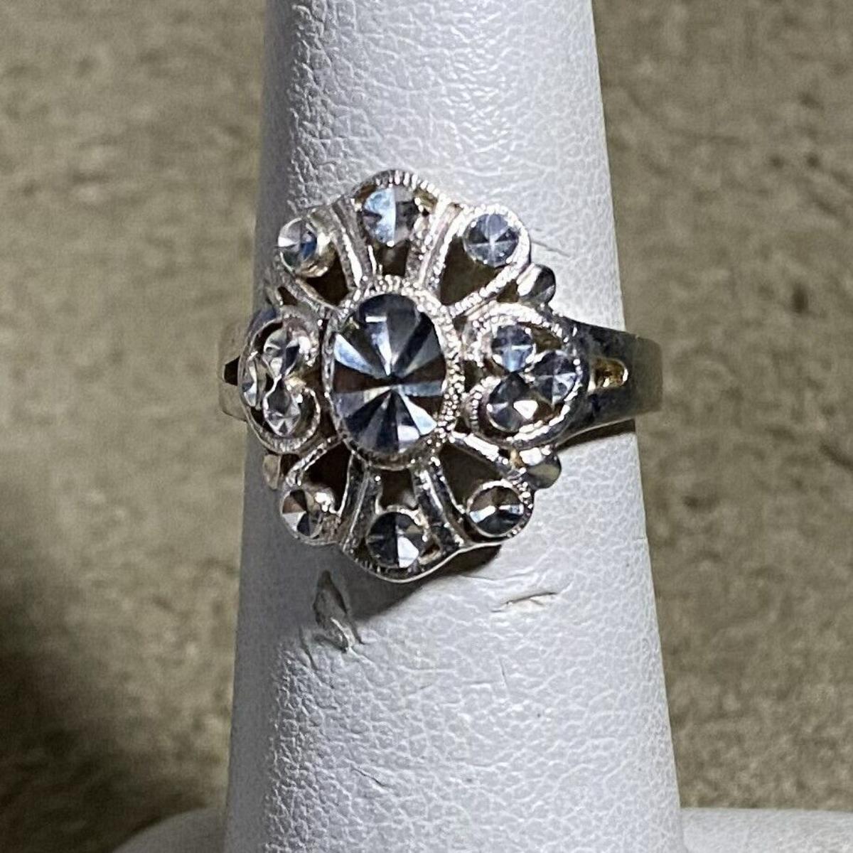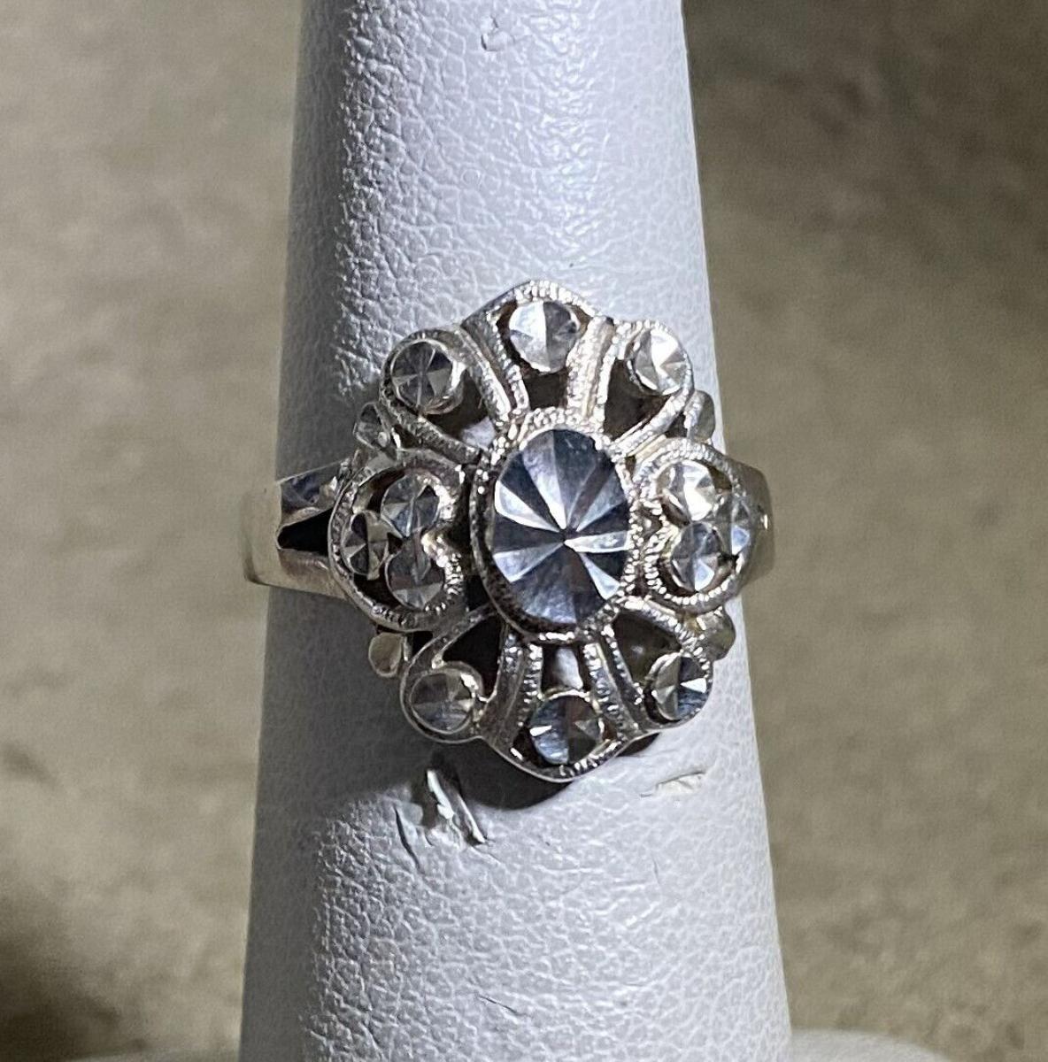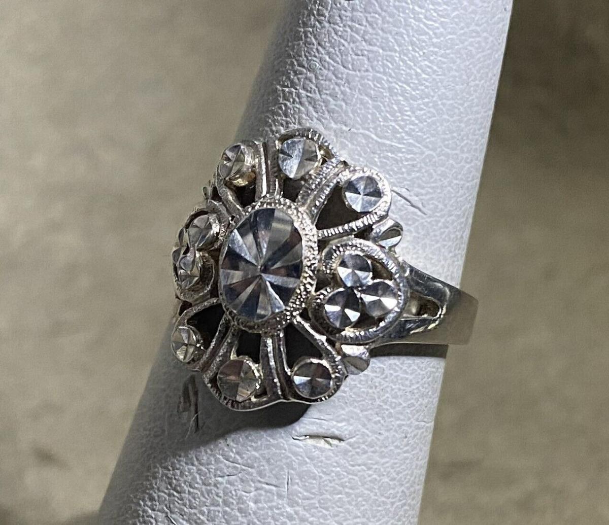 Filigree and faceted decorative metal in Sterling from Beverlry Hills Silver...Size 5.75 on this vintage ladies' ring...3.1 gram weight...Light use.