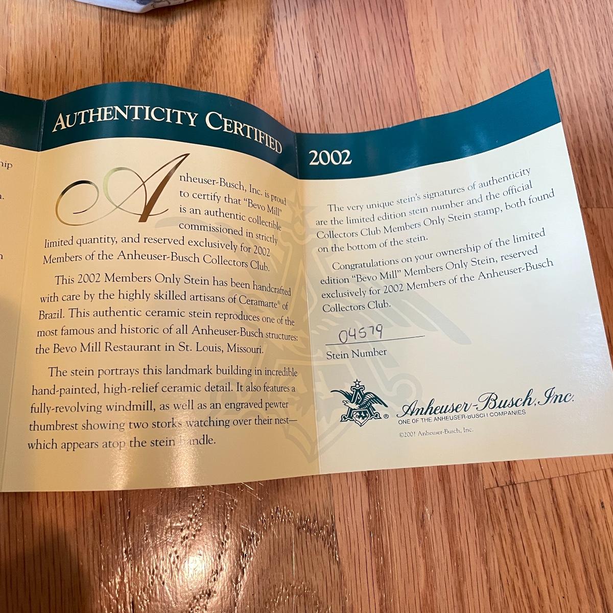 Anheuser-Busch Members Only Stein 2002 with moving windmill. Stein is about 10” tall, windmill will add a couple inches. See images. Shipping available.