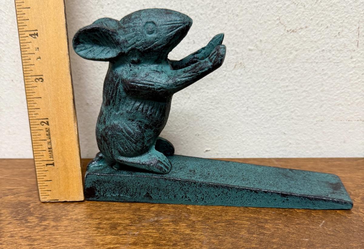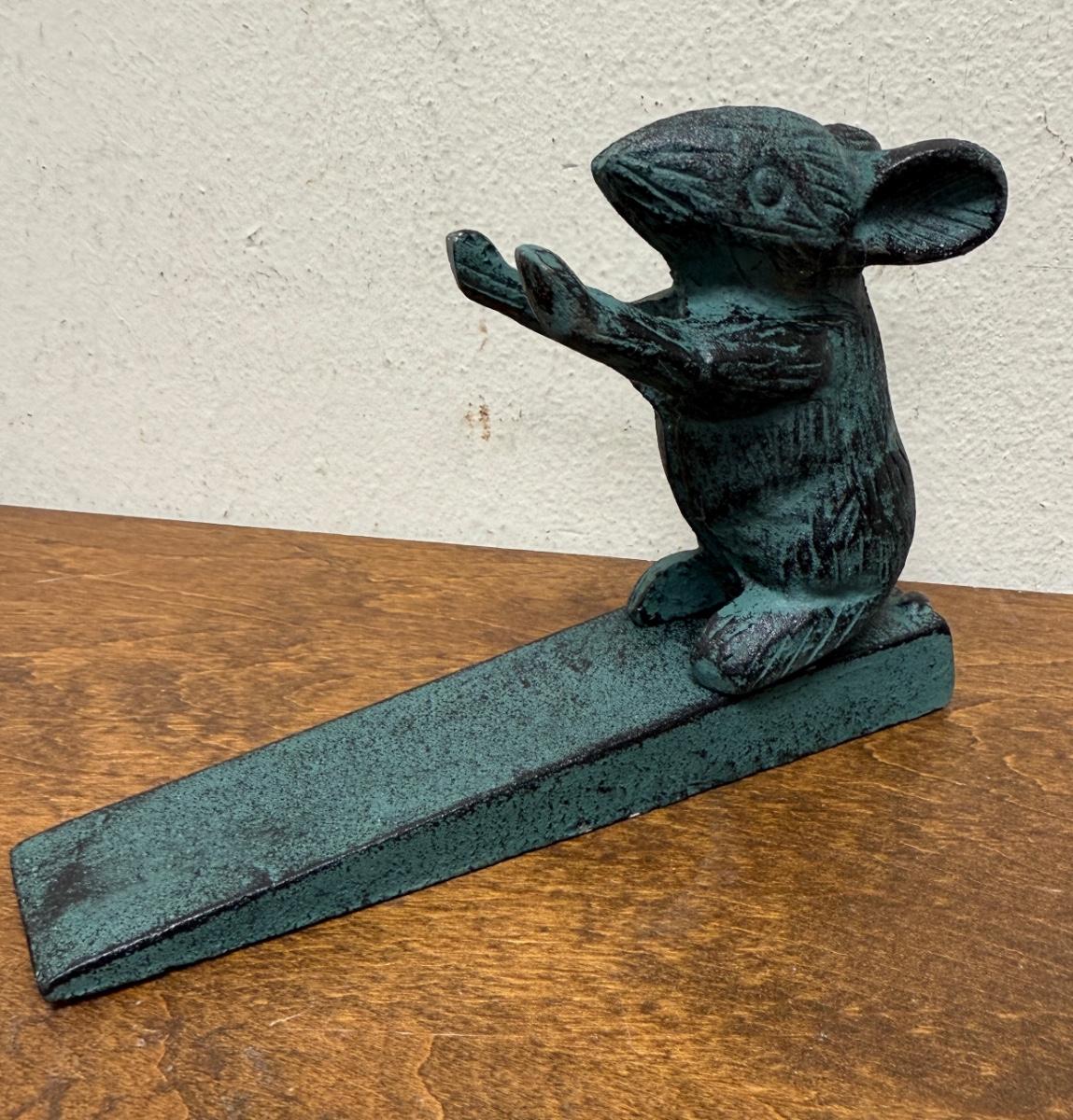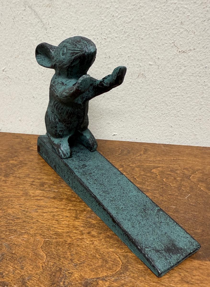 Cast Iron Mouse Door Stop Wedge Figural Blue-Green Finish